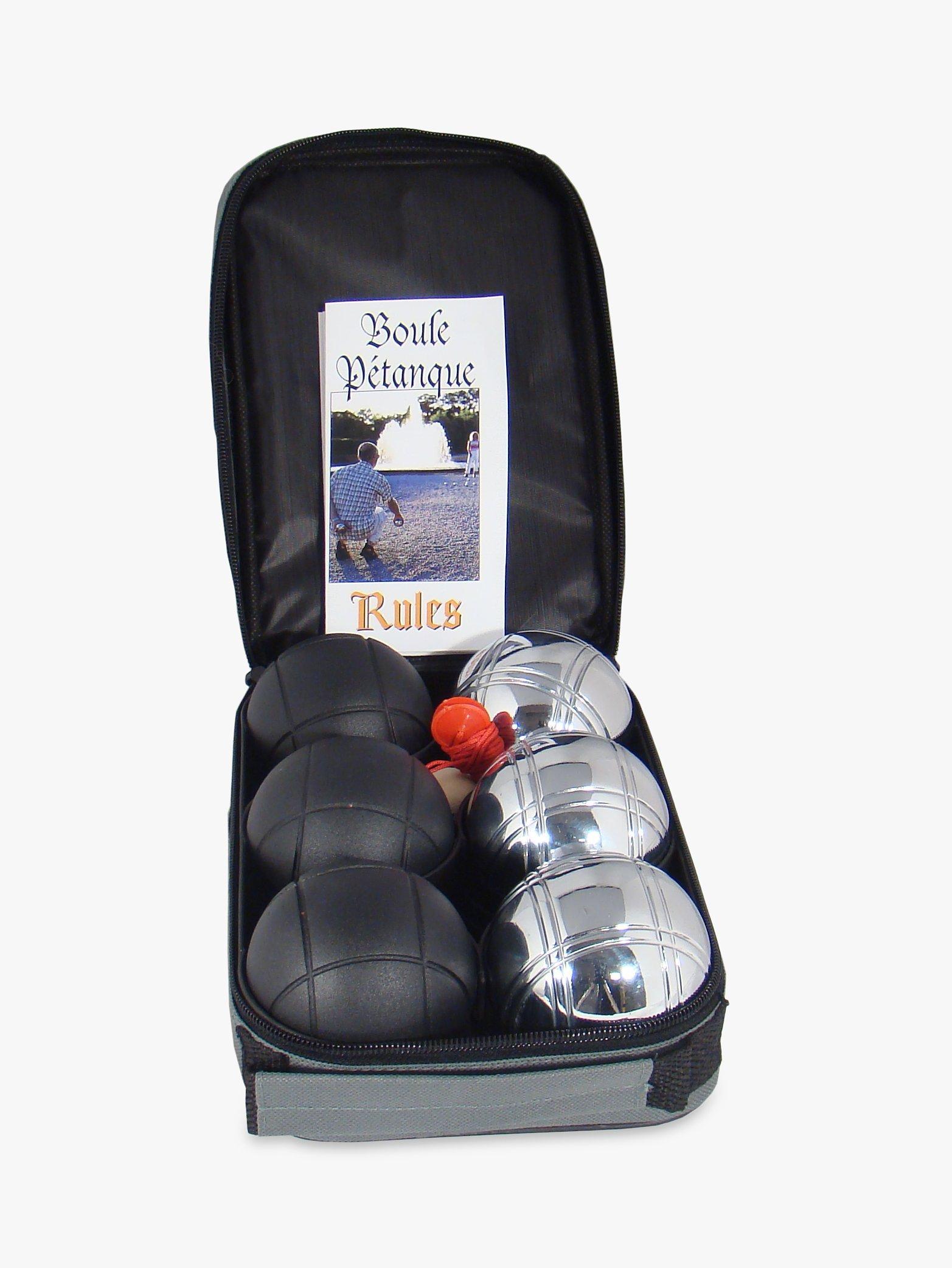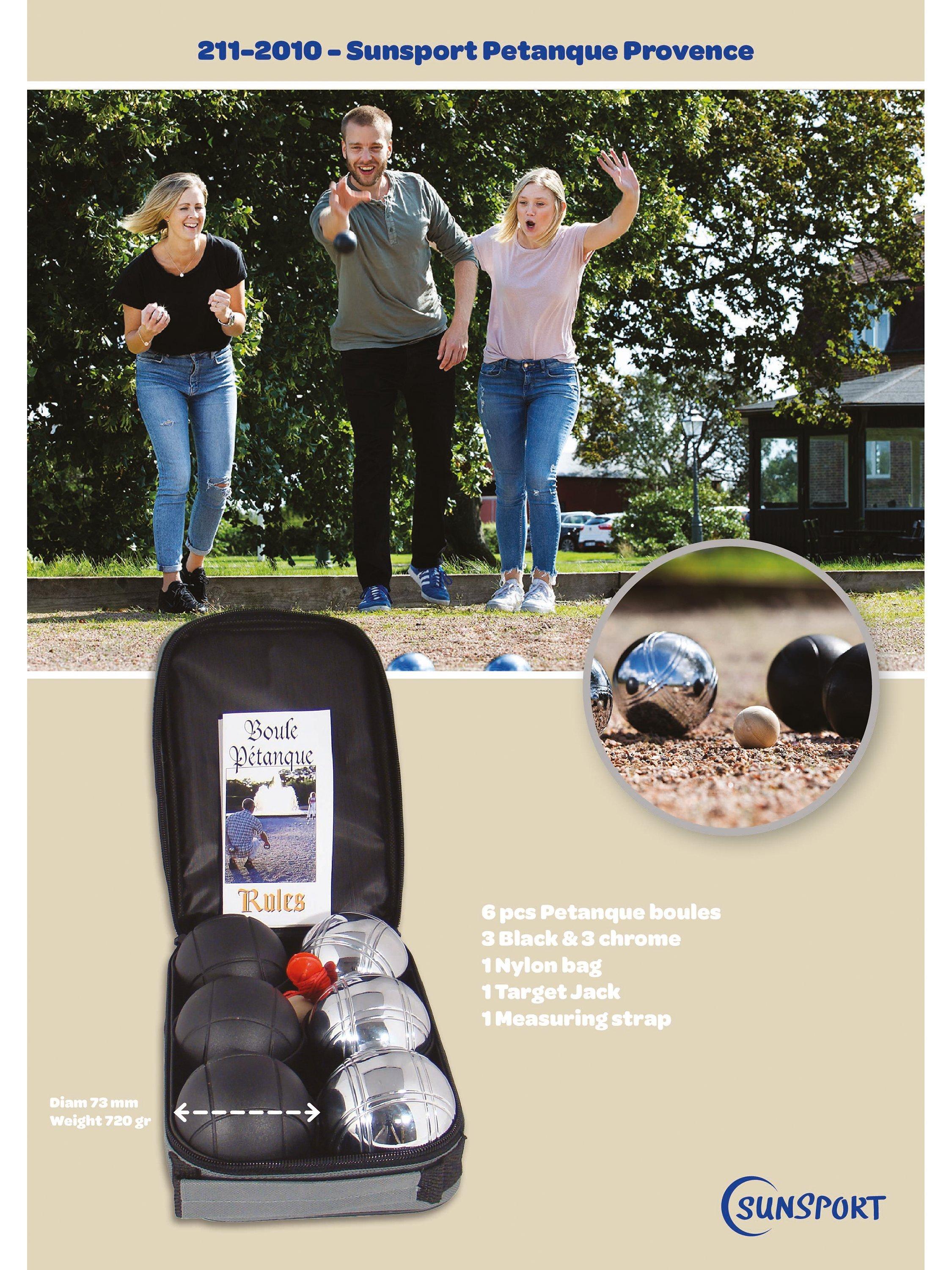 The set includes 6 metal petanque balls (3 black, 3 chromed), cloth storage bag, jack, measuring tape as well as a rulebook.