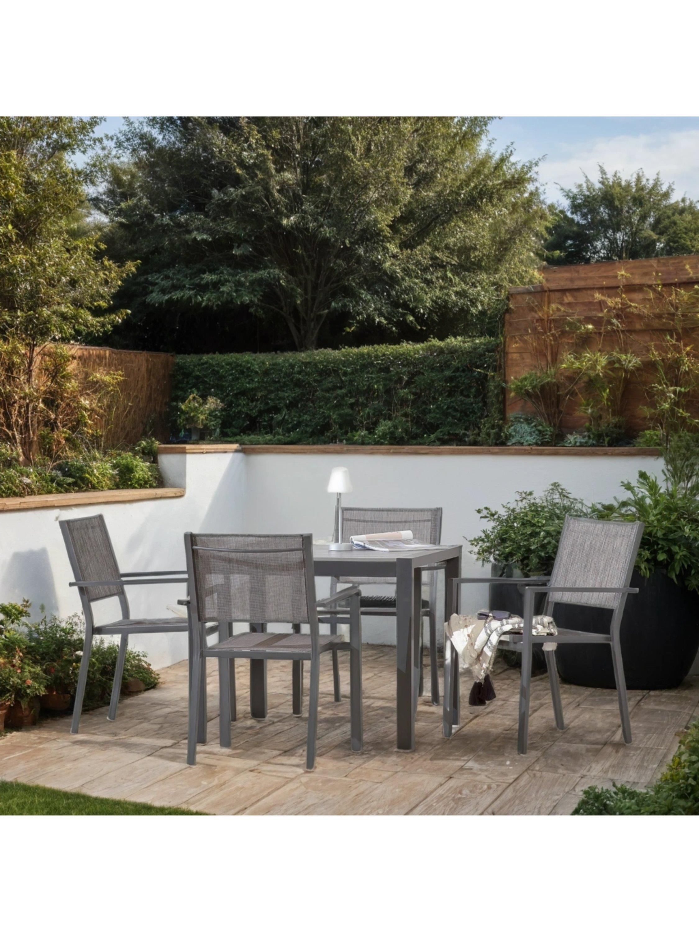 Create a stylish and comfortable outdoor dining space with this Suntime Adrano set. Designed for both elegance and practicality, this contemporary garden set includes four armchairs and a square dining table, making it ideal for al fresco dining, entertaining, or relaxing in your garden or patio.