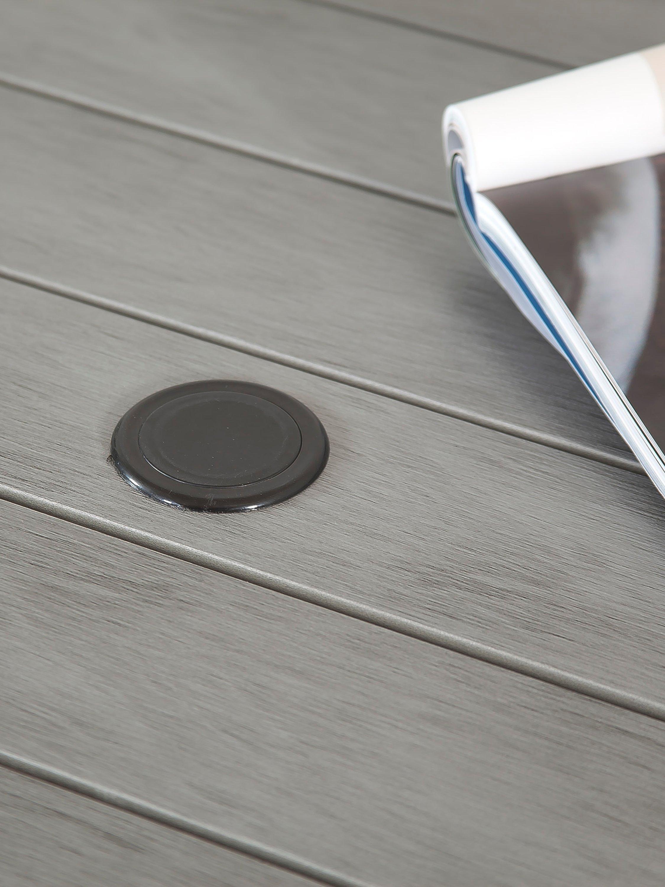 - Square garden dining table with a poly wood top and parasol hole