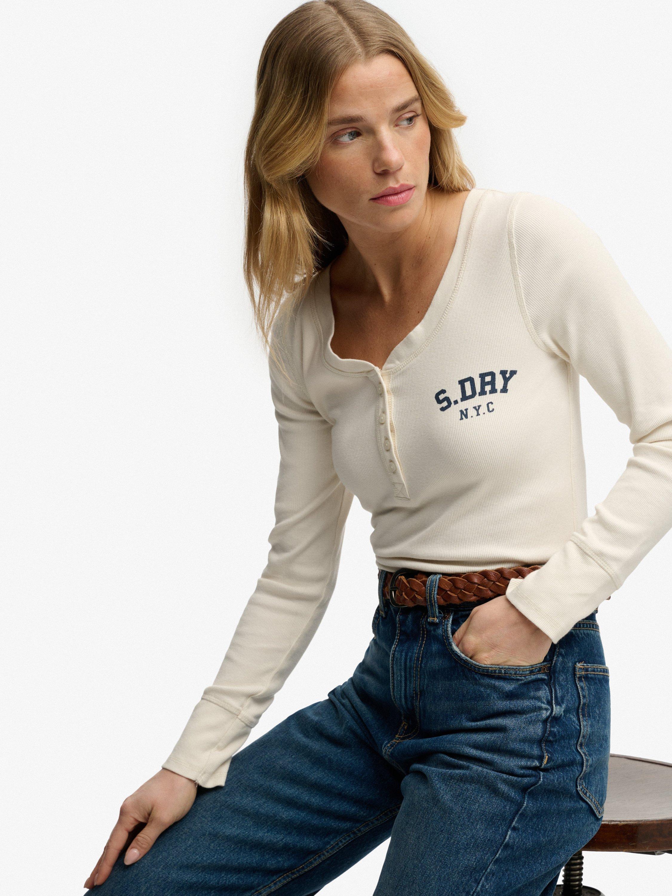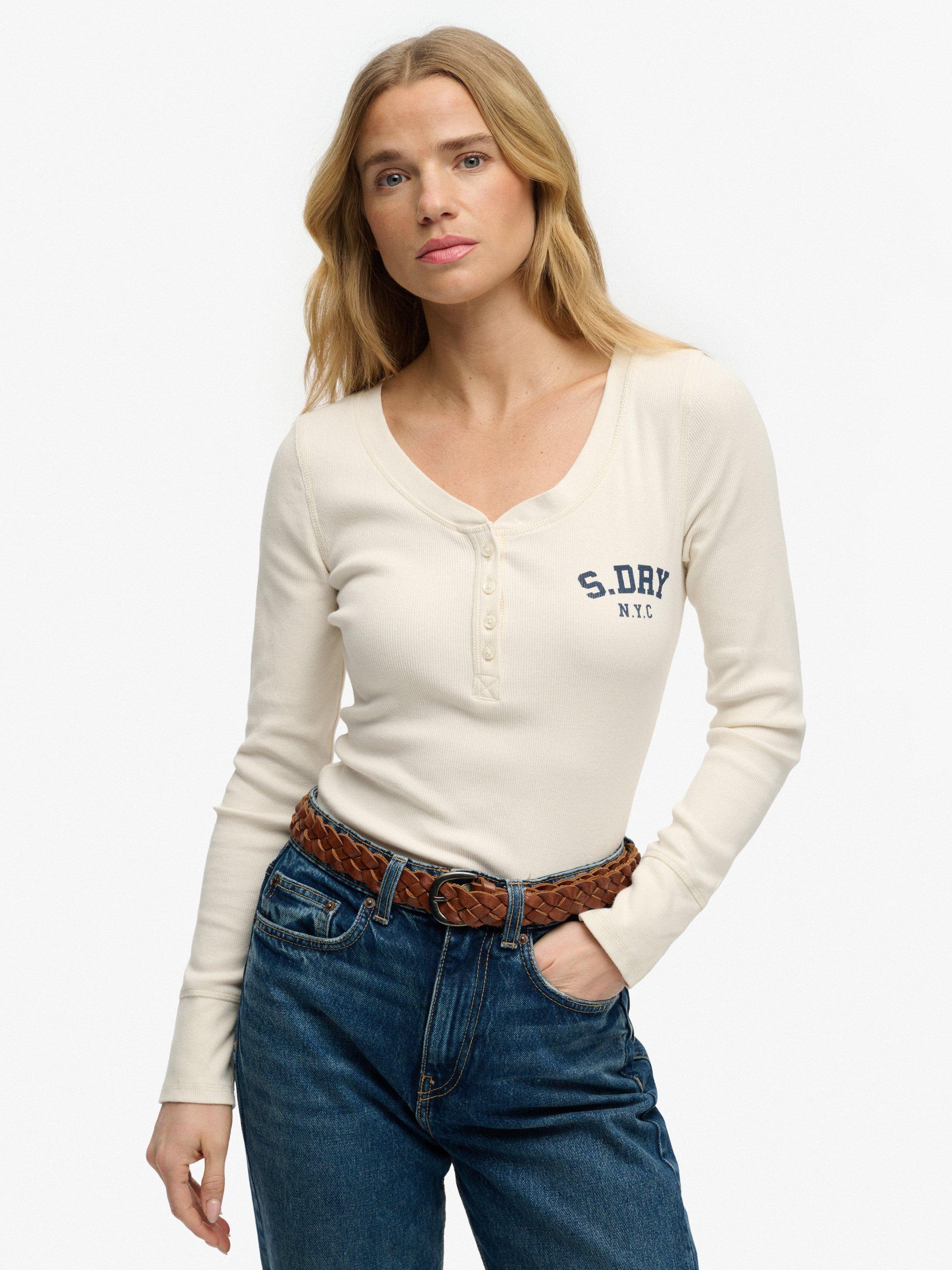 SuperdryAthletic Button Down Long Sleeve Top, Desert Bone Offwhite