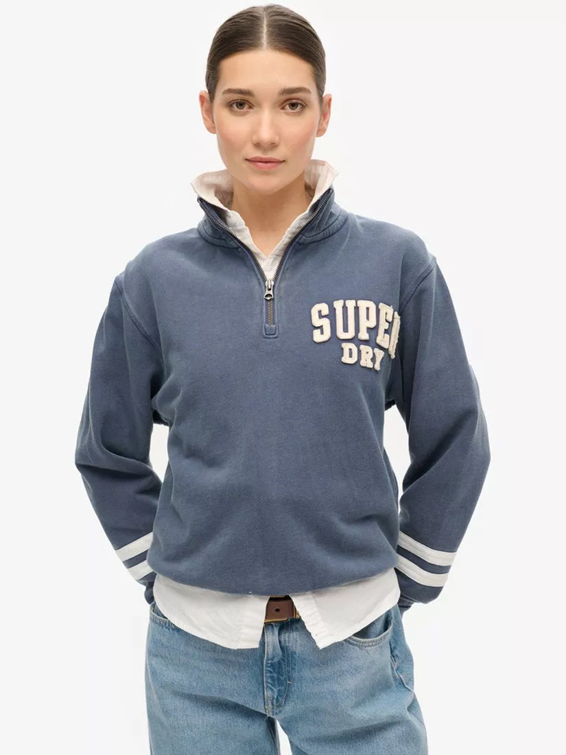 Bring a sporty feel to your wardrobe with our athletic essentials applique half zip sweatshirt. Crafted with 100% cotton for that super soft feel and finished with a dropped sleeve, loose fit and cropped cut, it will give a trendy, fresh vibe to your everyday look.