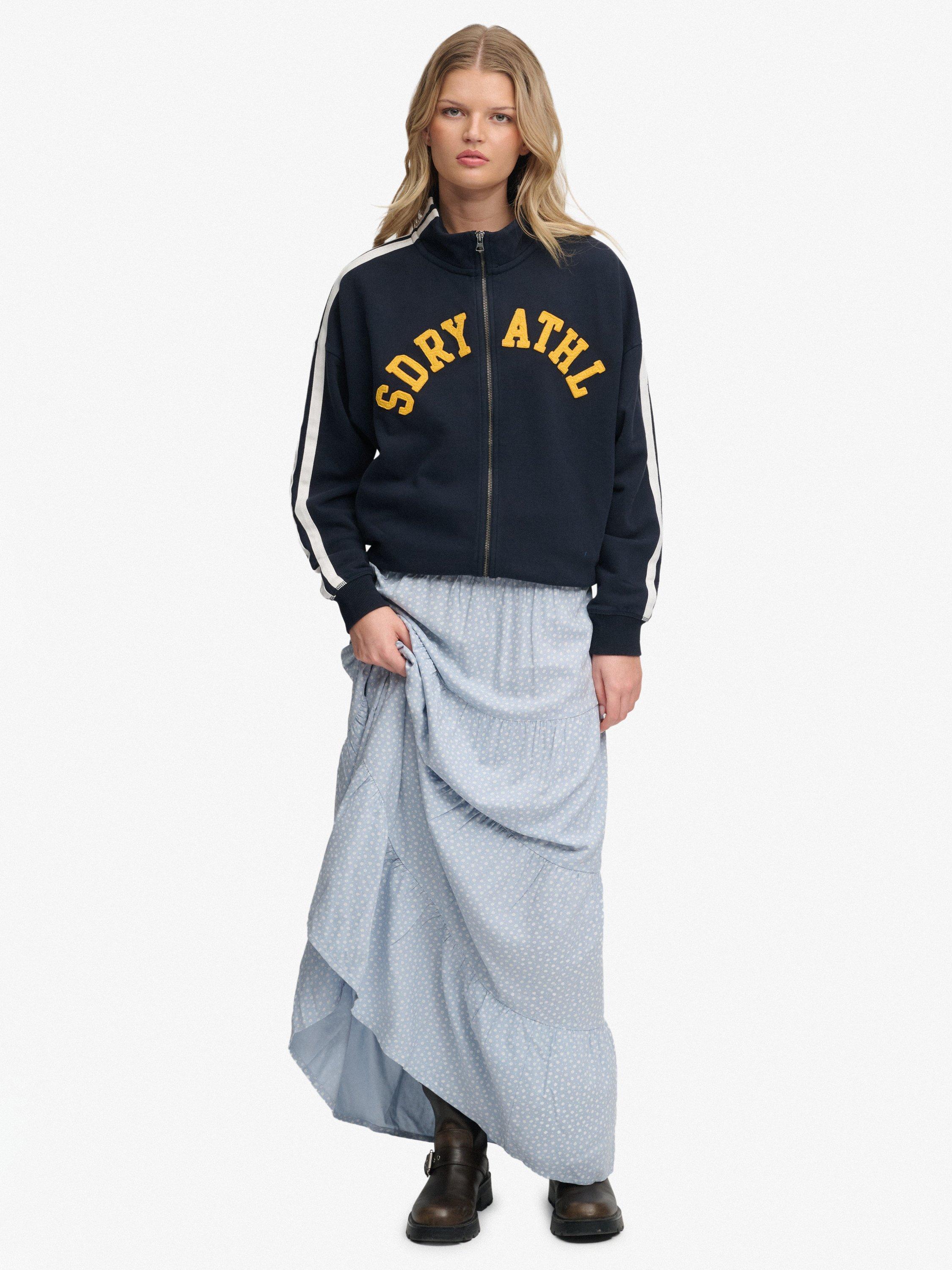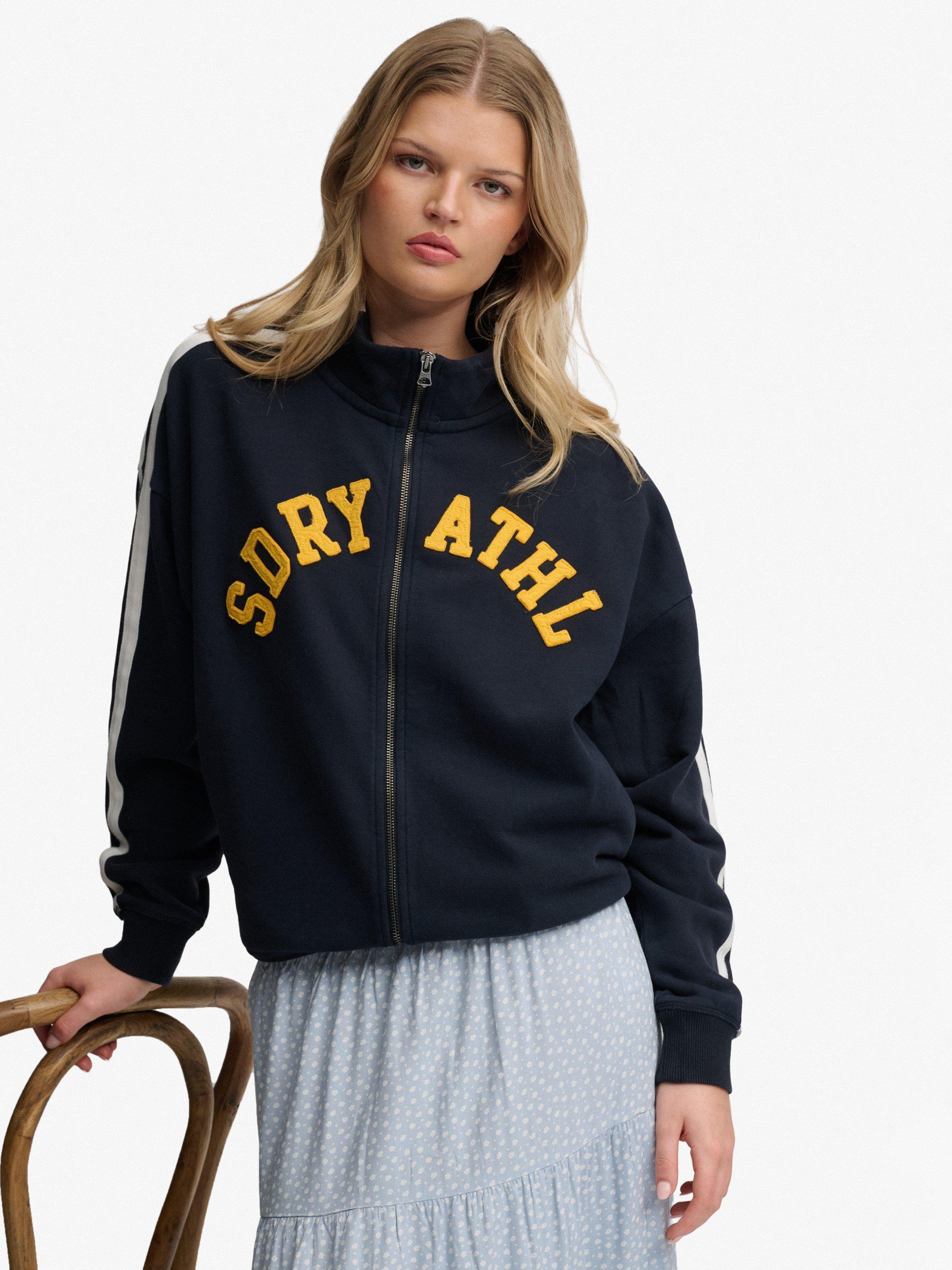 Part of Superdry's classic collection, the Athletic Essentials Appliqué Loose Zip Track Top is an elevated, cosy addition to your layering options. Crafted with a statement appliqué text across the chest and contrasting stripes on the arms, it features two external pockets with a signature tab. Cut in an oversized fit for a super relaxed look.