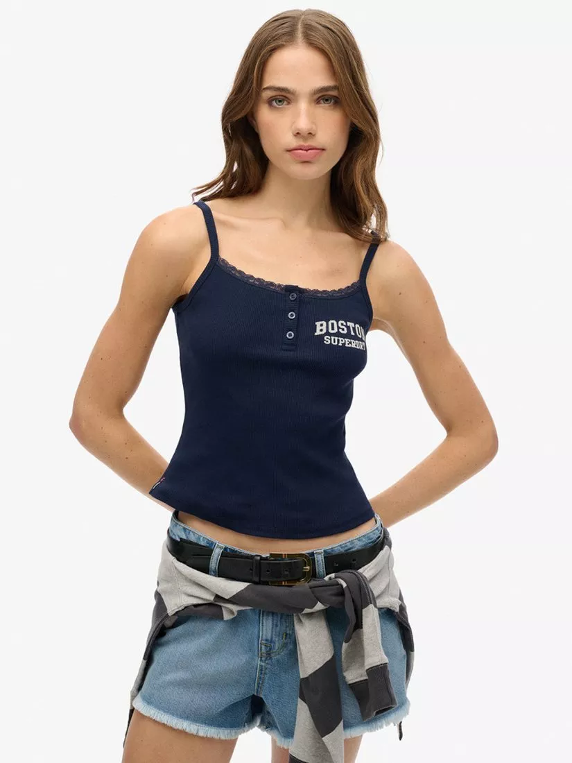 Part of our classic collection, the Athletic Essentials Graphic Button Cami Top has been delicately designed with a subtle lace trim on the neckline and a sumptuously soft, ribbed material making it stunning to wear however you like.
