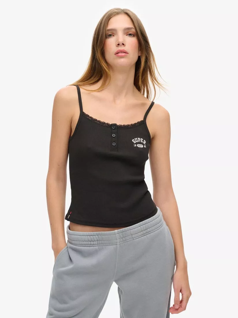 Looking for an update to your basics? Here it is! Our Athletic Essentials Graphic Button Cami has a ribbed fabric throughout and lace detailing at the top, it will soon be your favourite for your basics and layering.