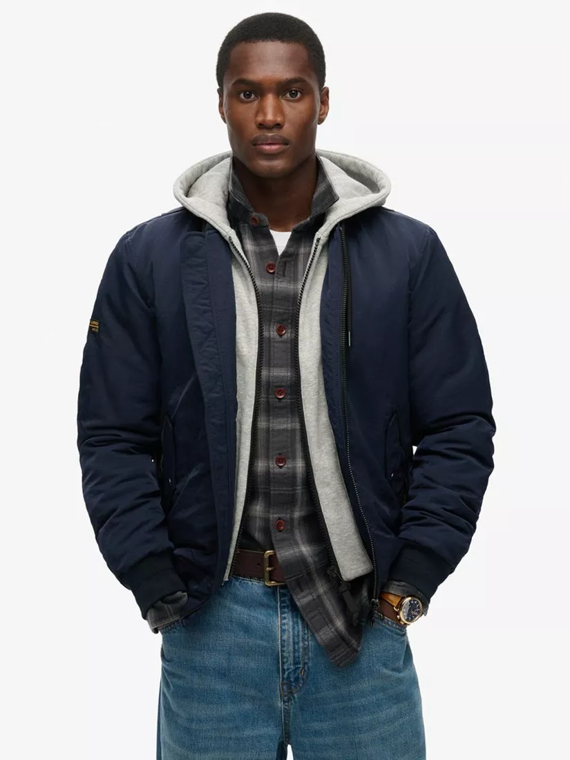 The ultimate transitional jacket. Crafted with the illusion of a hoodie, this jacket oozes cool guy vibes. With a bomber cut and sleek pockets and logo, you ll certainly stay warm and stylish all season long. Relaxed fit - the classic Superdry fit. Not too slim, not too loose, just right. Go for your normal size.