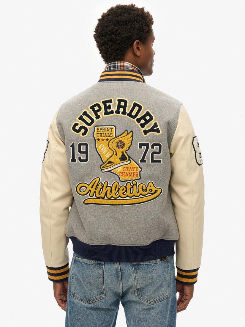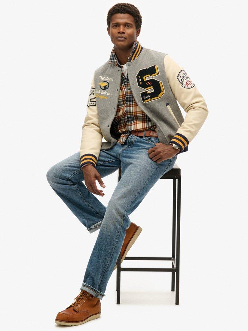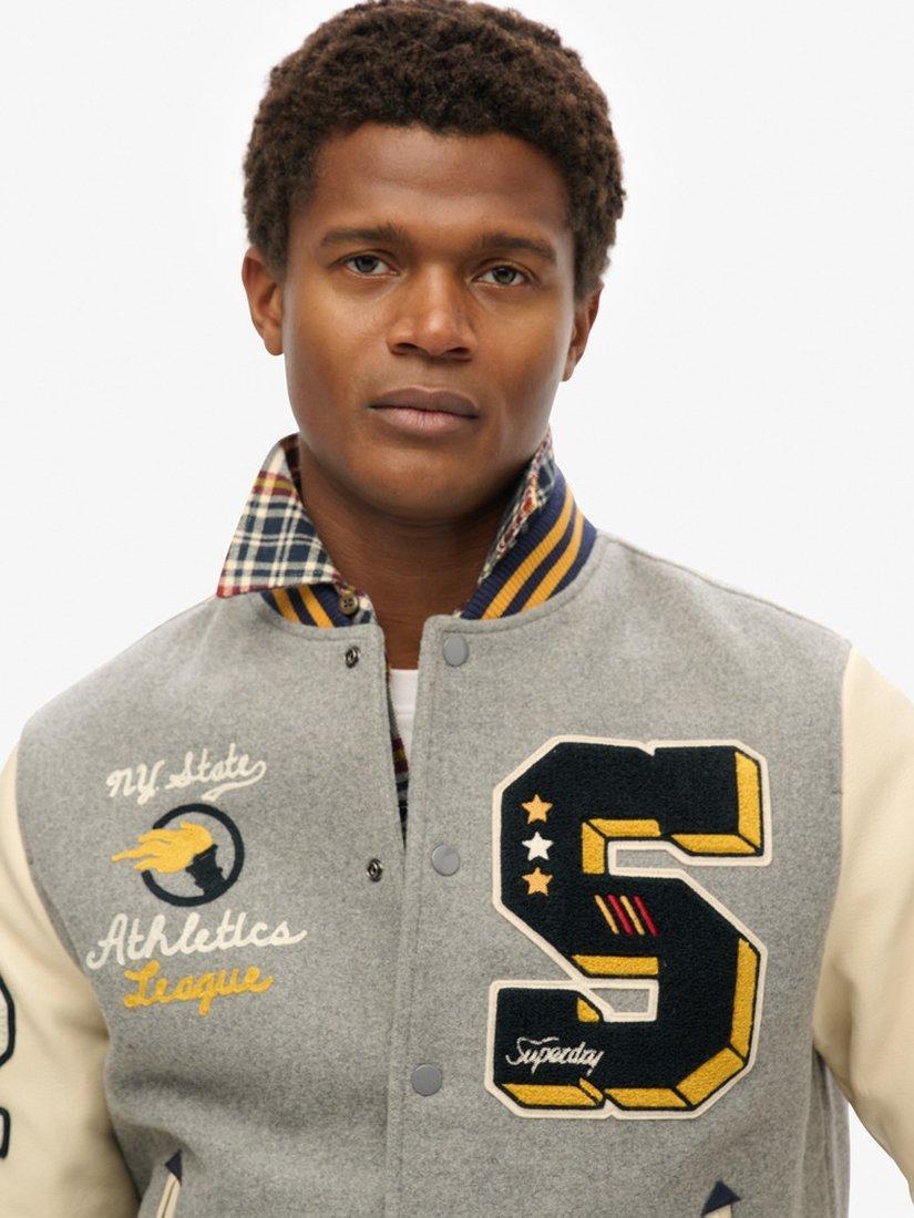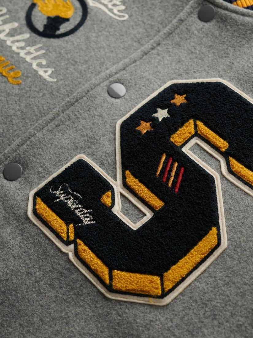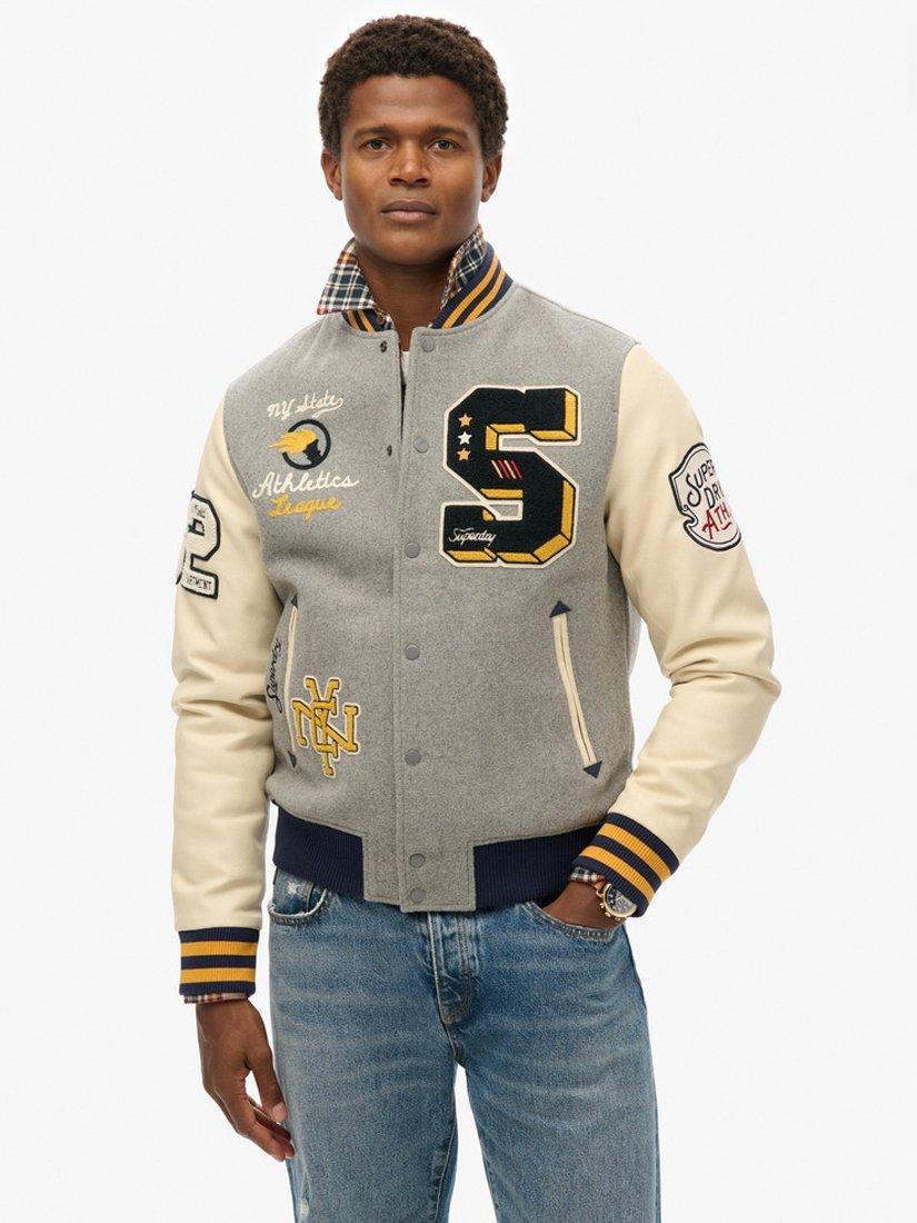 Embrace the charm of old-school American style with the College Patched Bomber Jacket. A heritage letterman-style jacket with faux leather sleeves and embroidered patches, featuring popper fastenings, two side pockets, an internal pocket and a quilted lining for extra comfort.