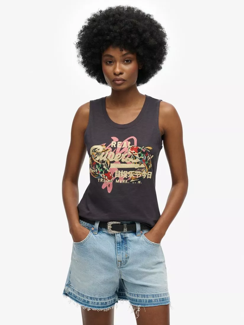 With a just right - relaxed fit, this scoop neck cotton vest top has a large embellished graphic across the chest. Inspired by Japanese culture, this vintage graphic vest is the perfect balance between style and keeping cool in the height of summer, ideal for showing off your style in an effortless way.