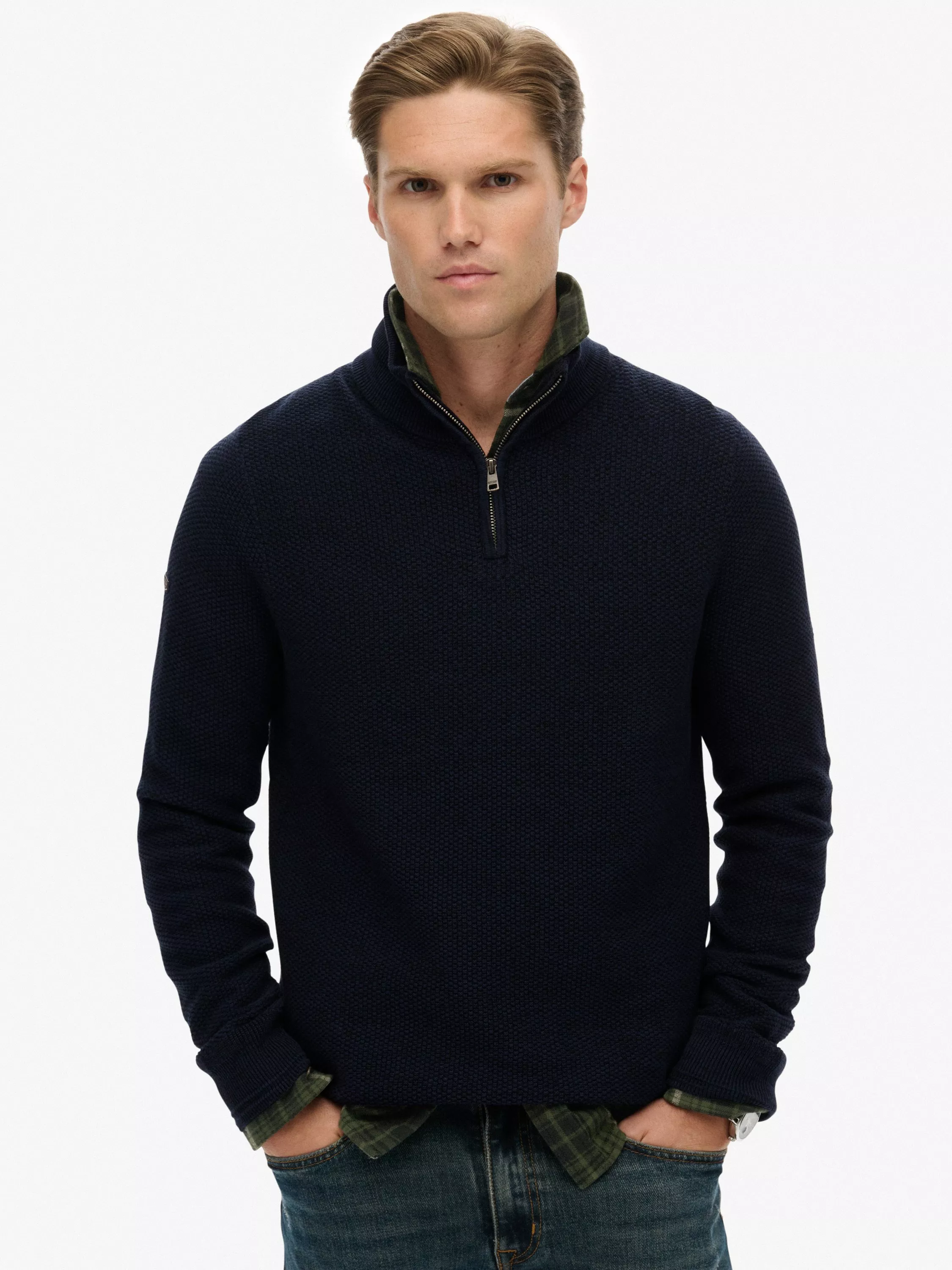 Designed for cold weather, the Cotton Texture Half-Zip Jumper is a versatile piece that will complement your existing wardrobe. With its classic Superdry relaxed fit, this jumper is perfect for layering. It features a henley collar with a zip fastening, and is finished with ribbed cuffs and hem along with a subtle metal badge on the sleeve.