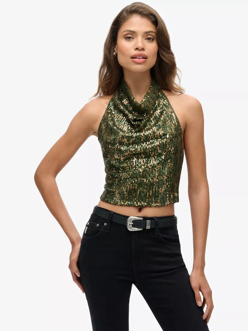 Breathe life into your wardrobe this season with our Cowl Halter Neck Sequin Top. Crafted with a chic cowl neckline and immense detailed sequins throughout, it's perfect for dressing up with a black skirt and strappy heels or keeping it elegant and casual with a pair of your favourite Superdry jeans.