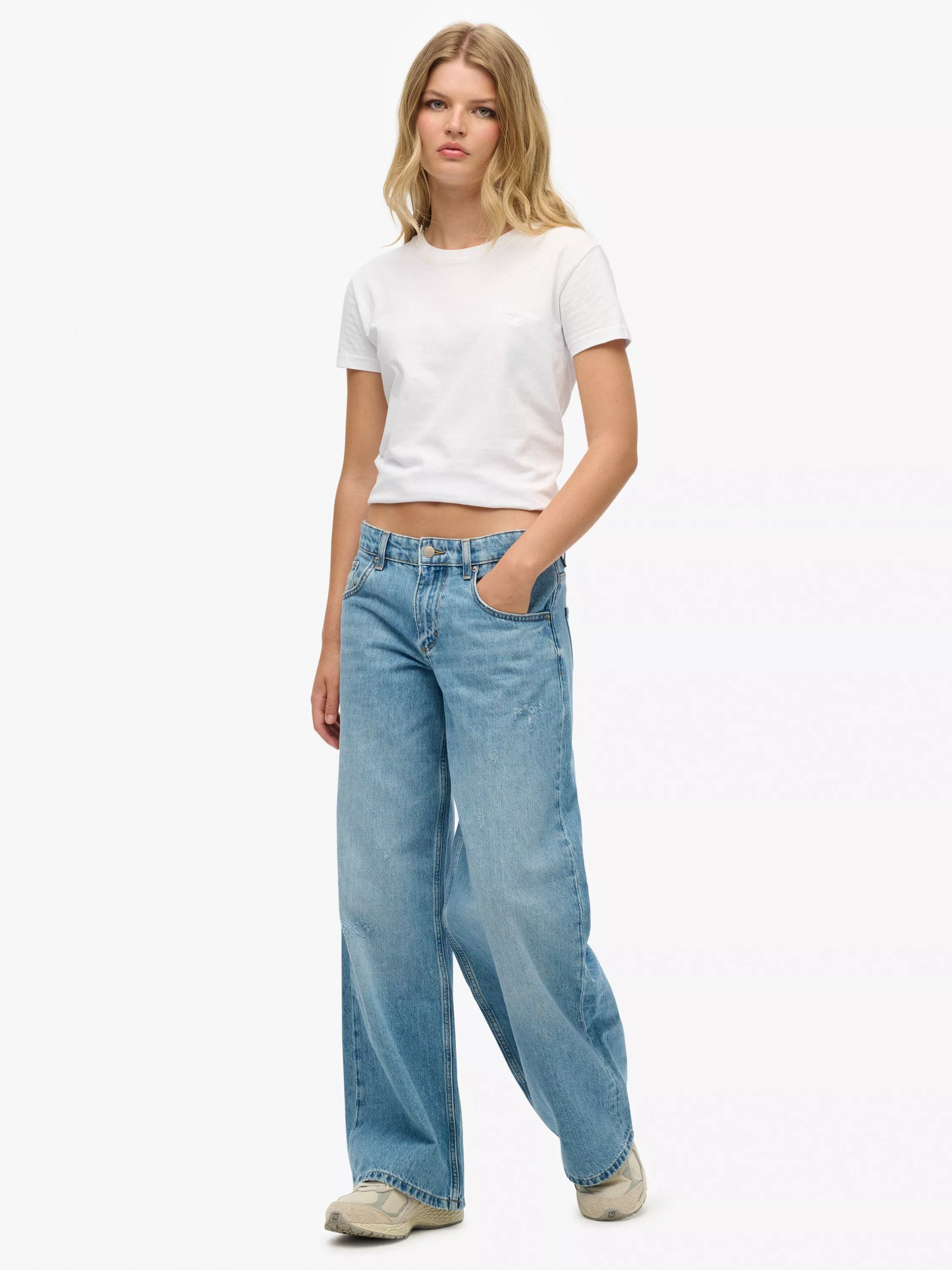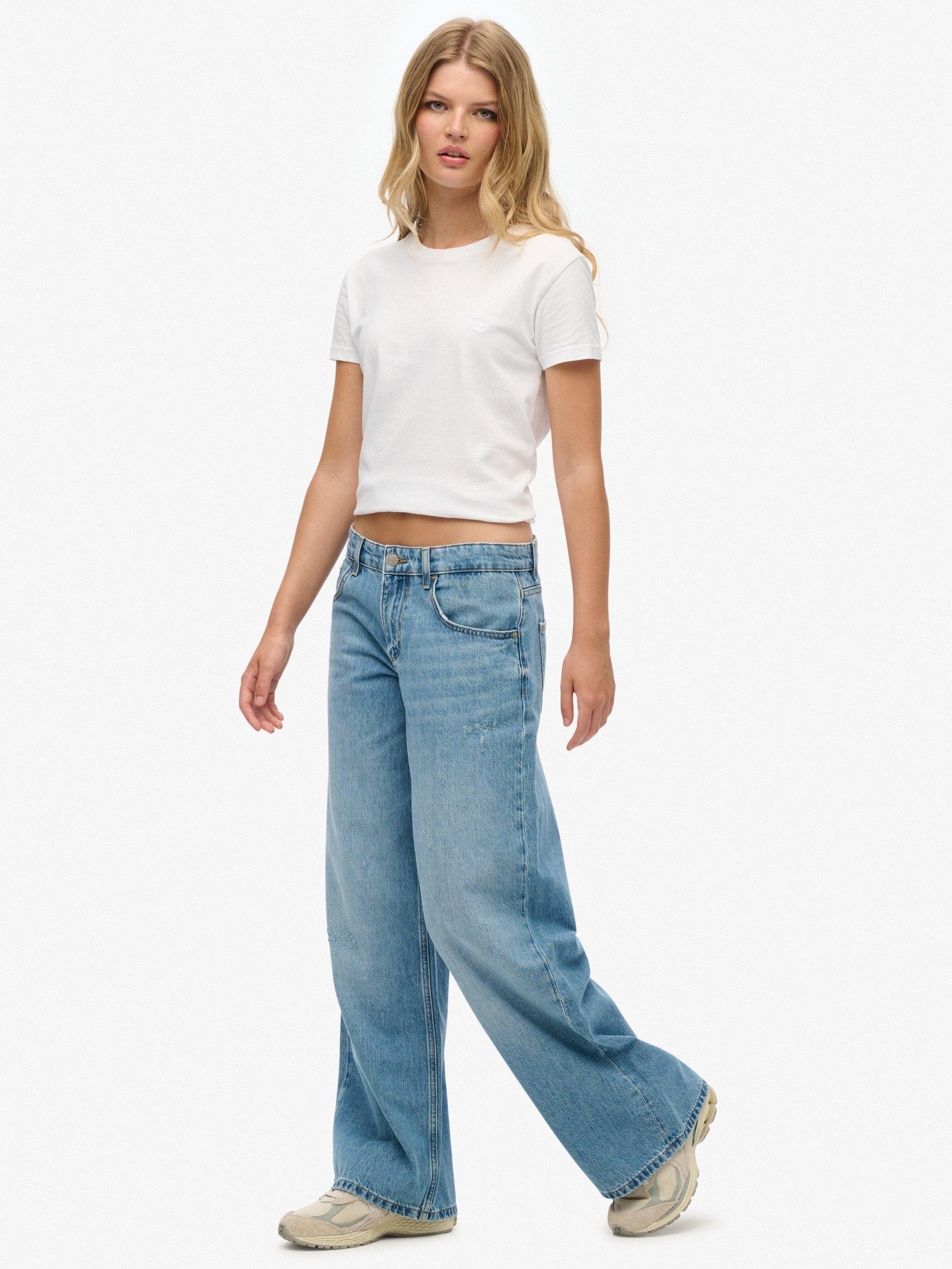 These jeans are designed for versatility and feature a mid-rise waist that's both flattering and comfortable. They have four external pockets and a unique sewn-in patch on the back, making them an ideal foundation for any outfit, whether you're keeping it casual with a basic tee or layering up with a puffer coat.