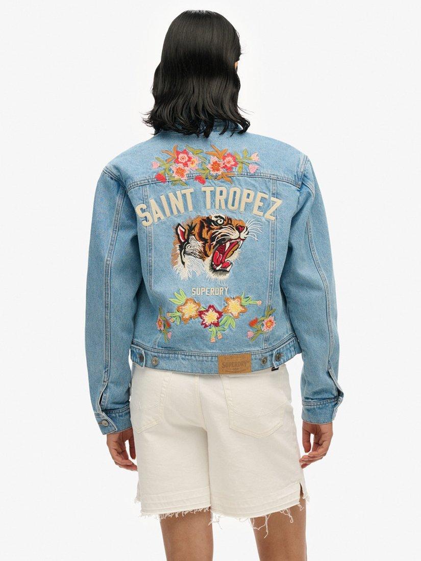 Distinctive and stylish, our Embellished Denim Jacket has been reworked with visions of serenity and creativity just for you. Crafted with a perfect relaxed fit and a colourful embroidered graphic on the back, style with denim jeans and a pair of espadrilles for the go-to look of the season.
