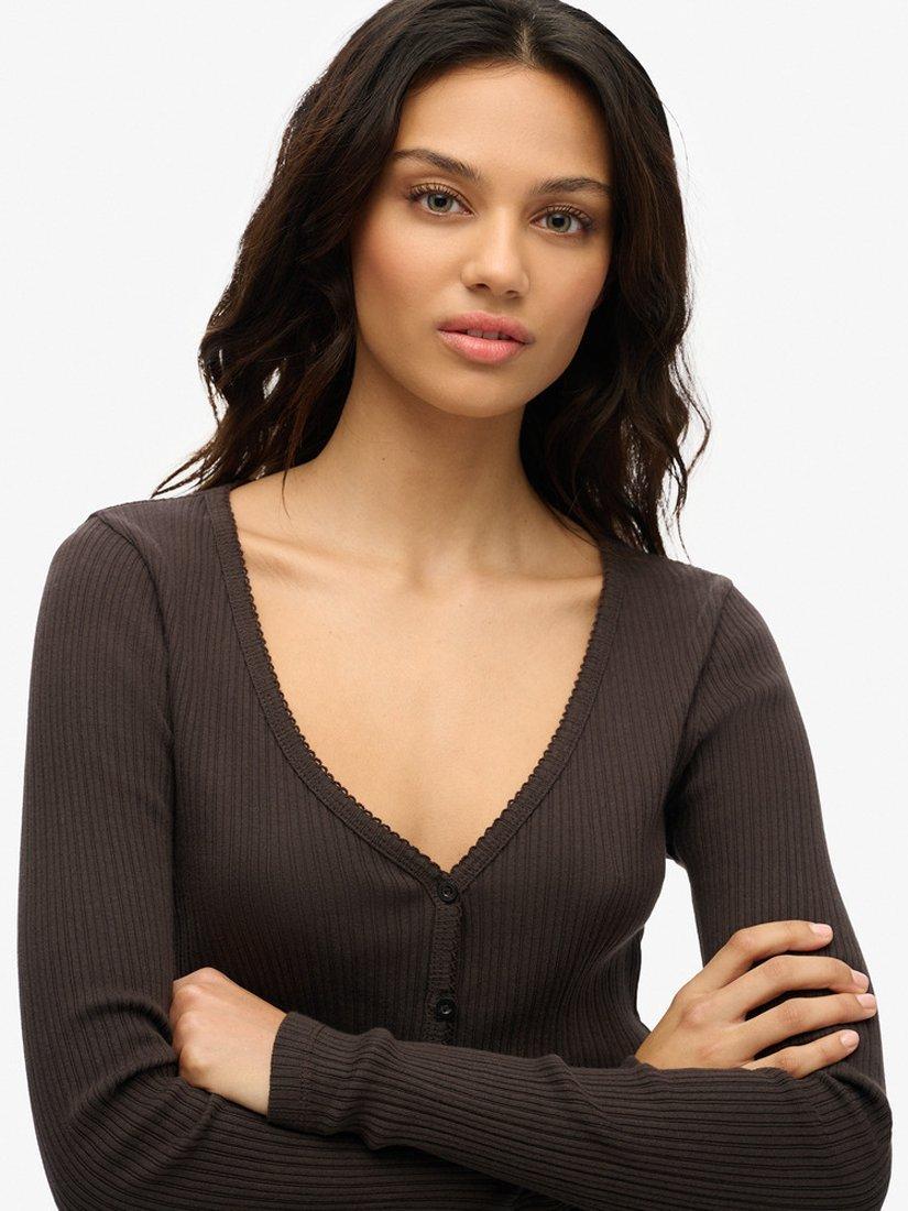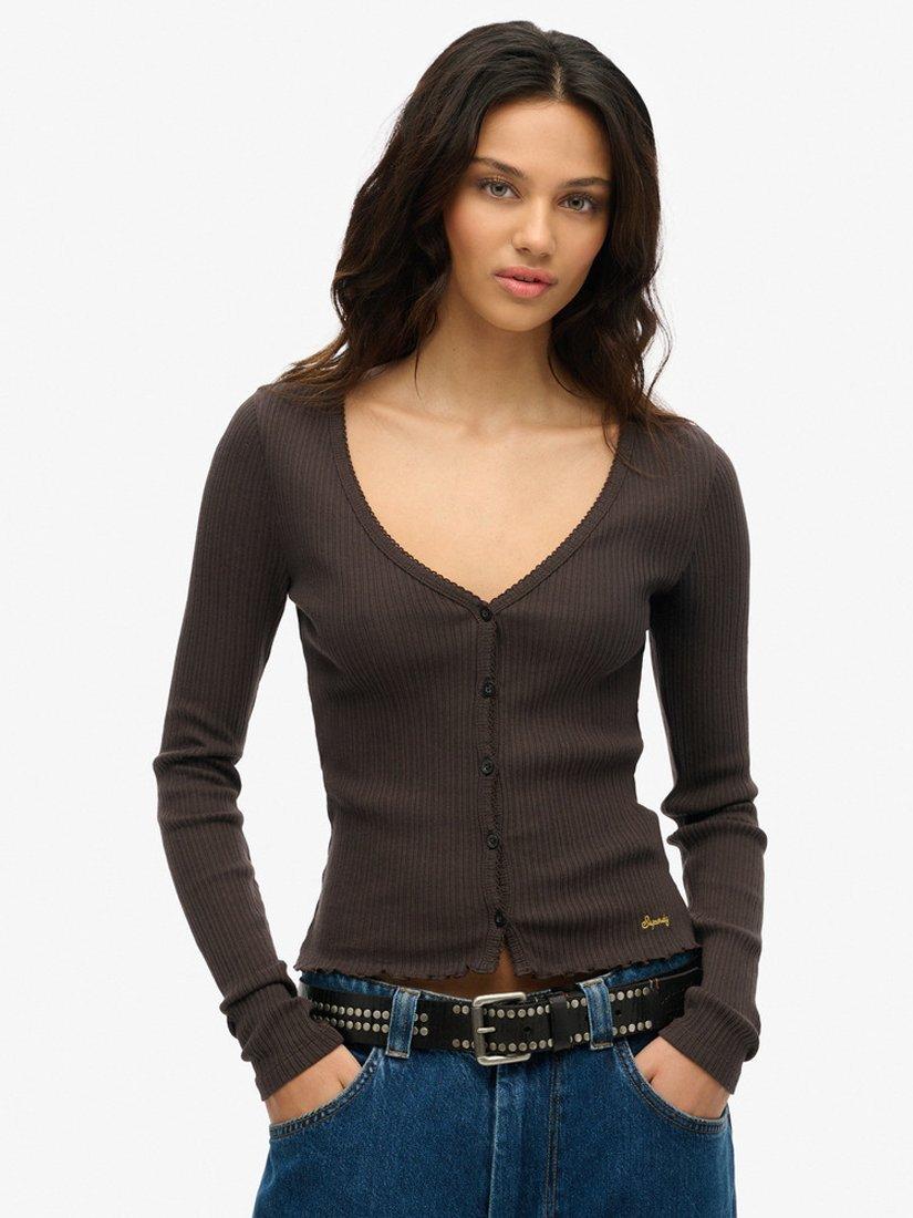 Simple and stylish, the Essential Button Through Long Sleeve Top brings a luxurious feel to your authentic style, crafted from a soft ribbed material. A subtle elevated staple guaranteed to become your favourite wardrobe staple, finished off with lettuce trim hem and embroidered logo offering a premium touch that ensures every outfit is perfect.