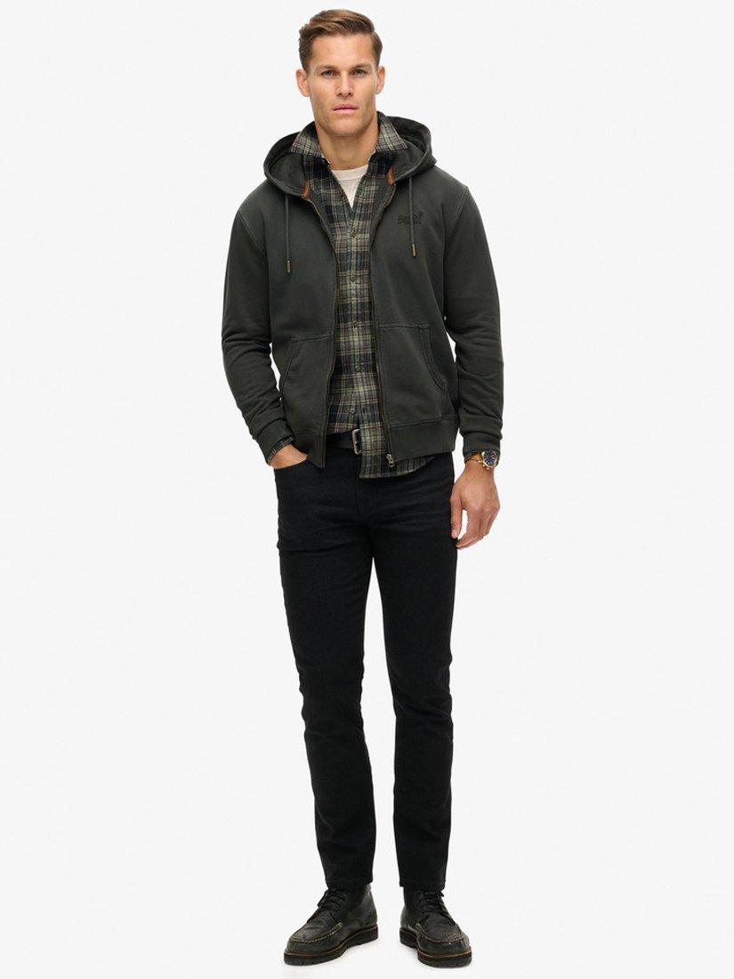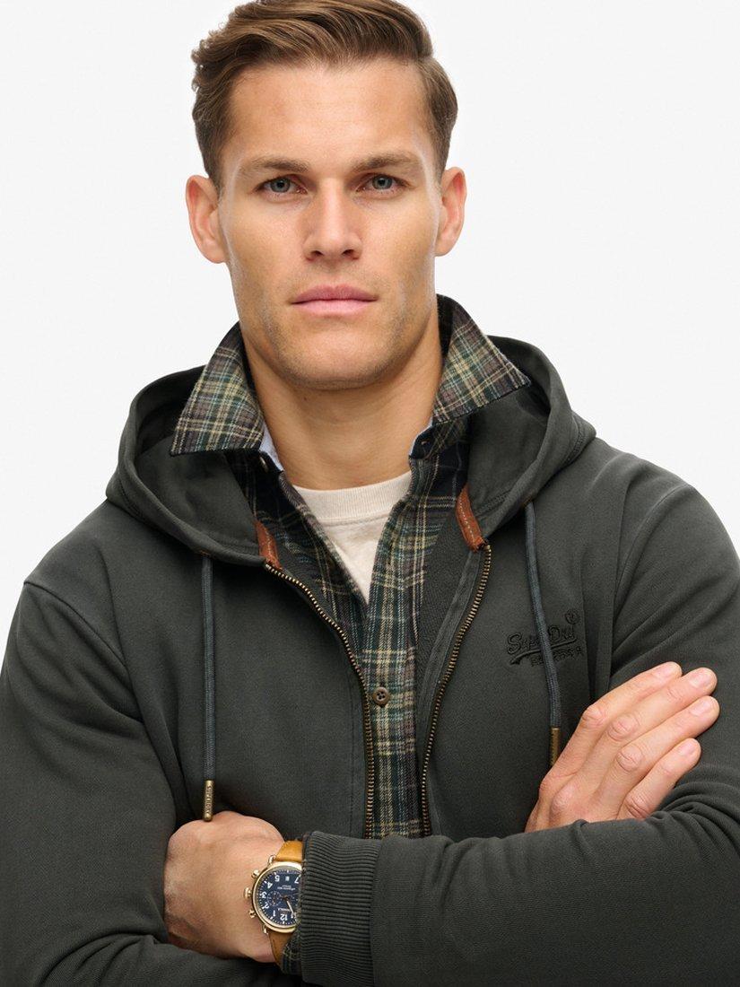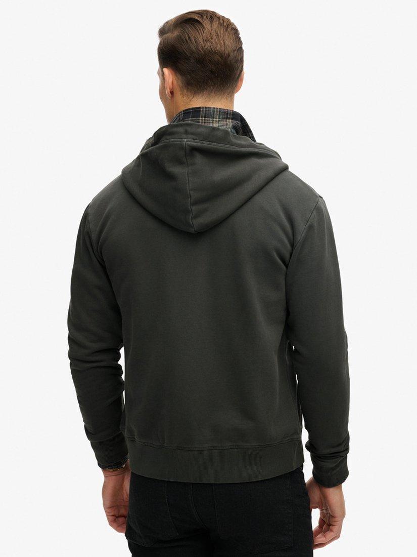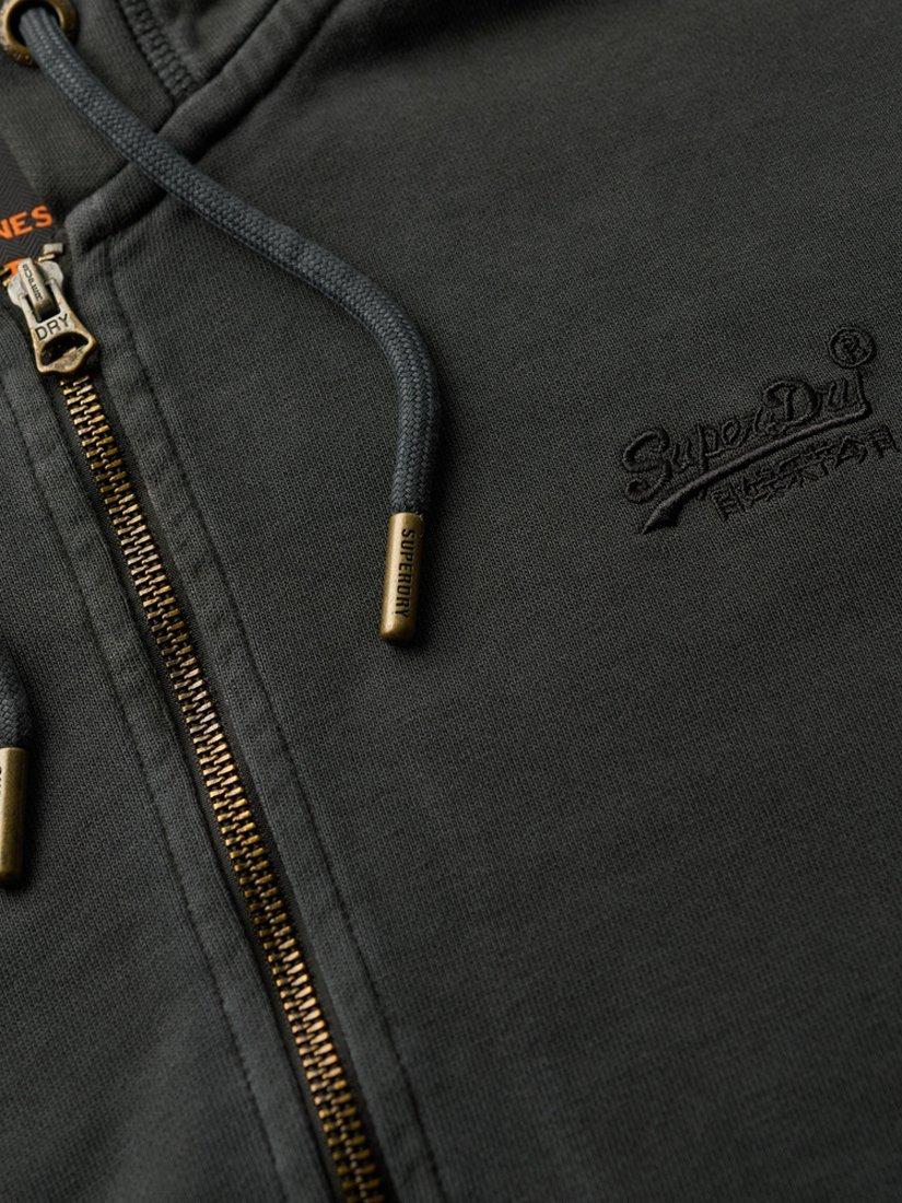 Features a hood with adjustable drawcords, zip-through, two external pockets, ribbed cuffs and hem, lightly brushed lining, contrast Superdry embroidered logo on the front, and sewn-in Superdry tag on the side. Loose fit.