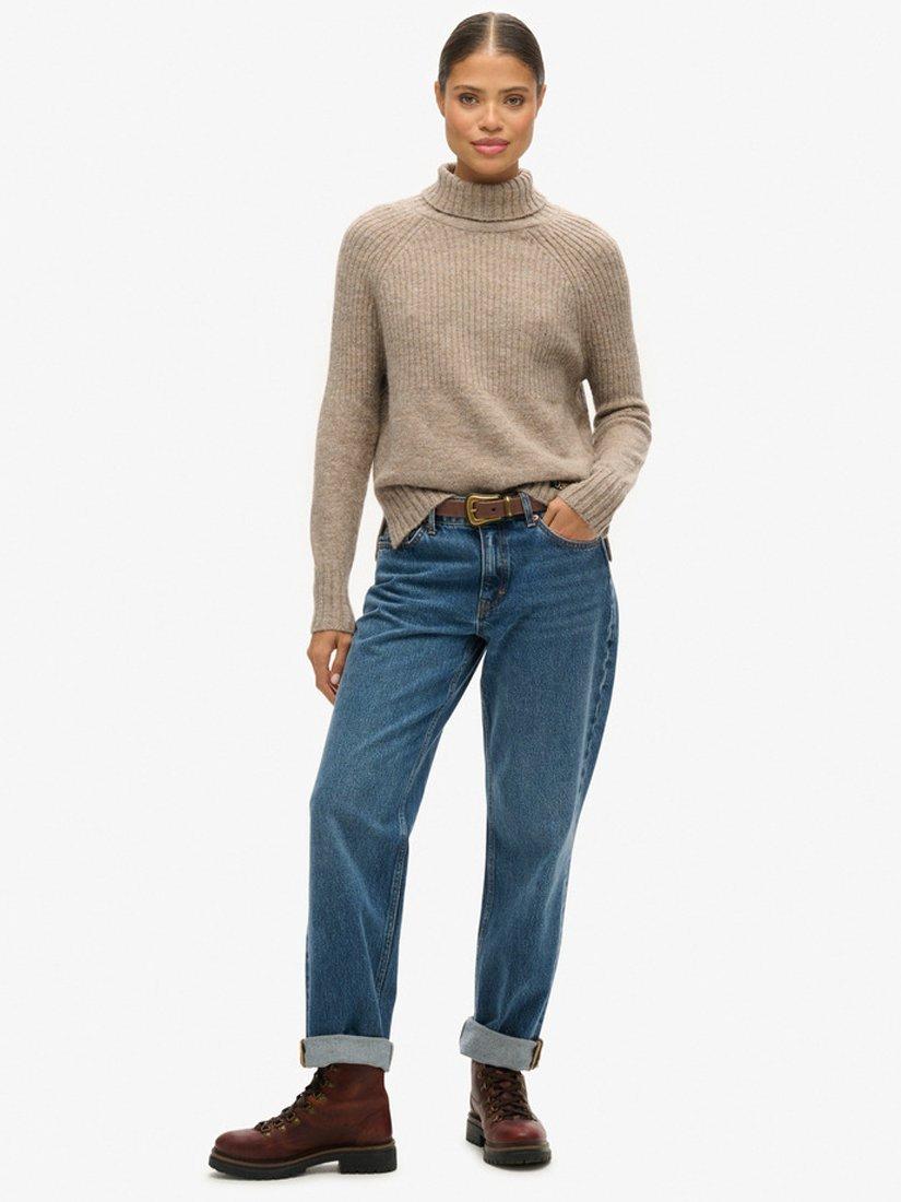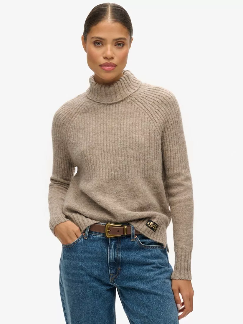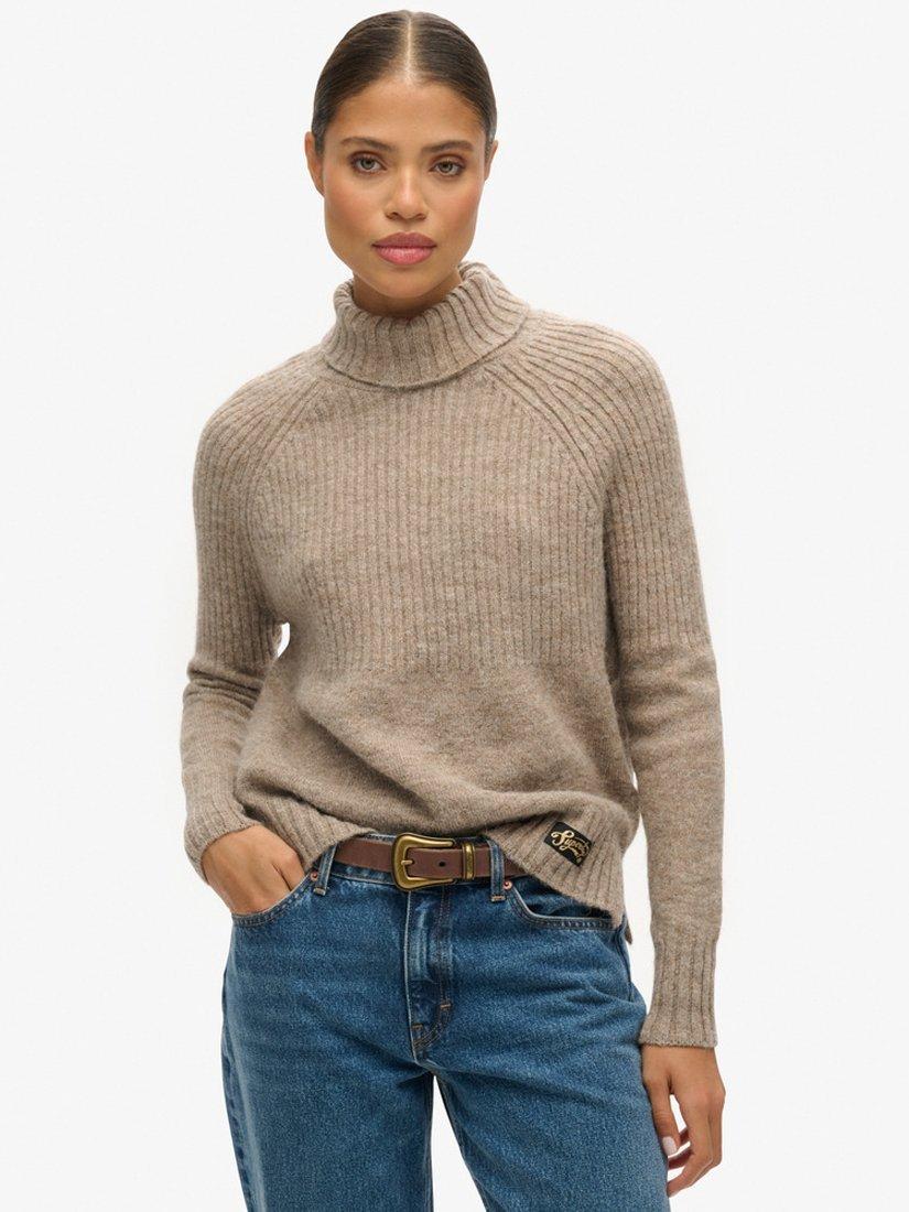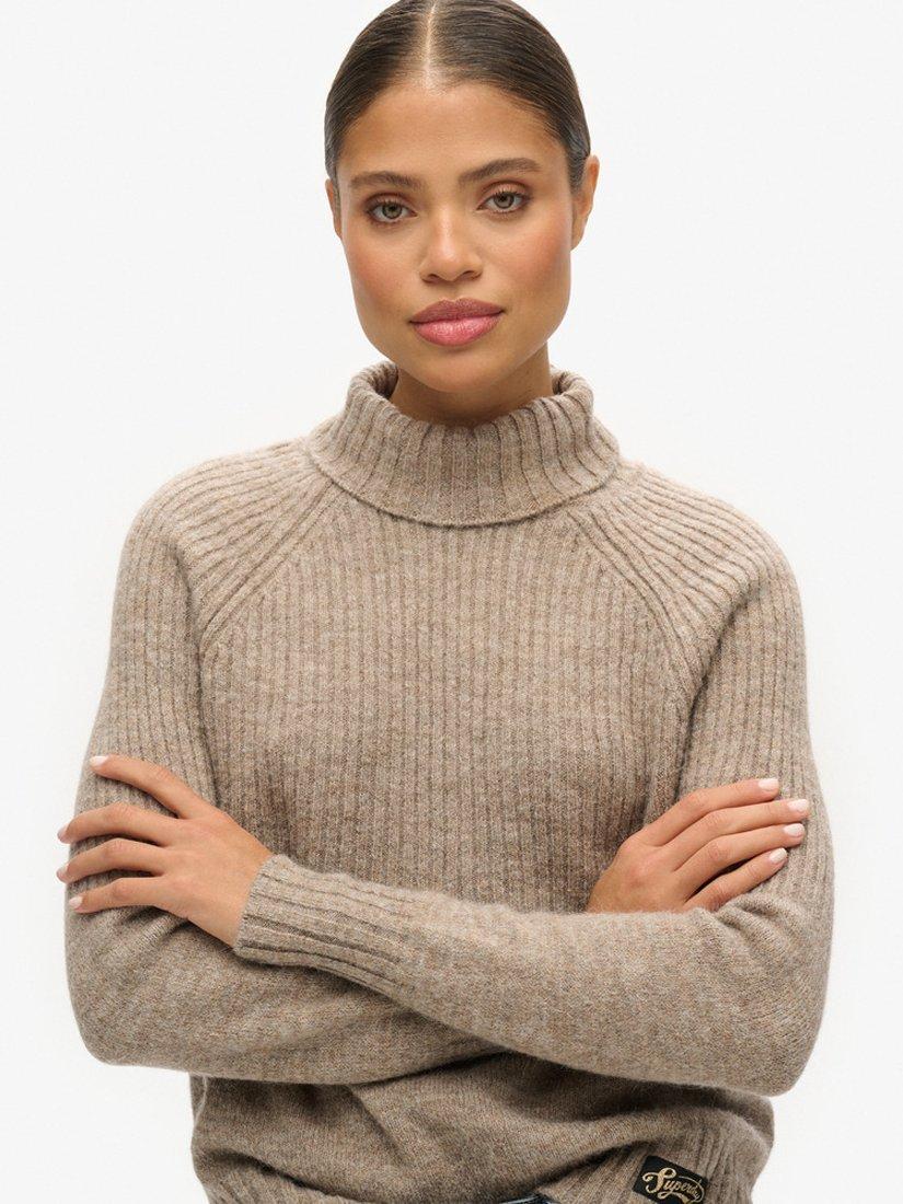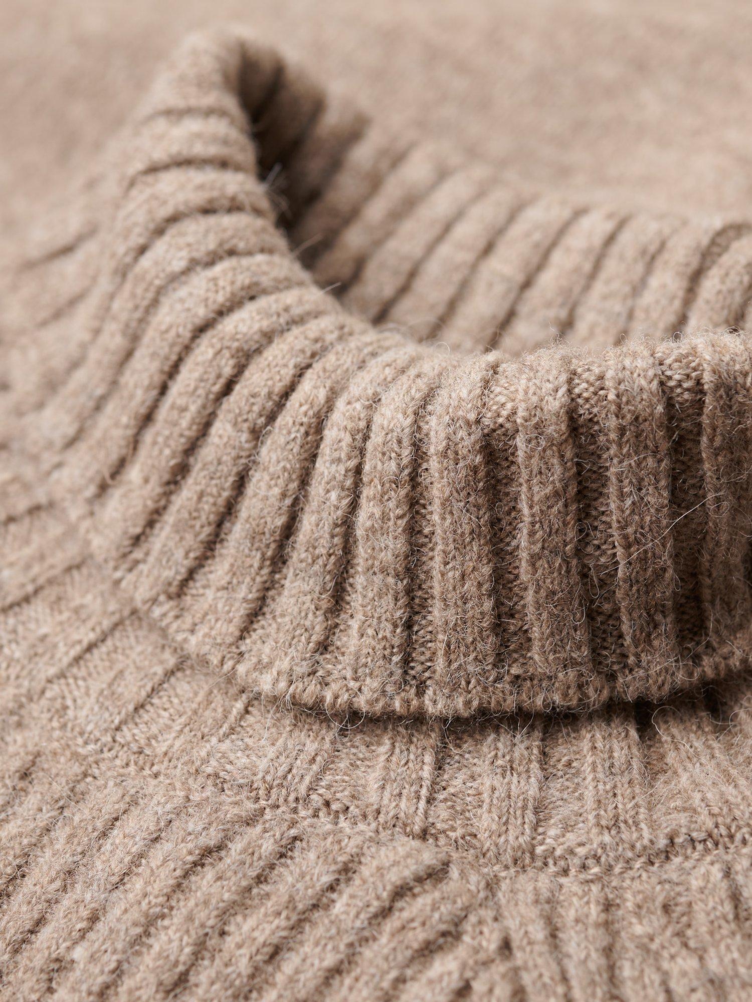Accented with a high neckline and long sleeves, it is spun from a wool blend for a warm and comfortable feel and pairs well with chunky knits in wintery months.
