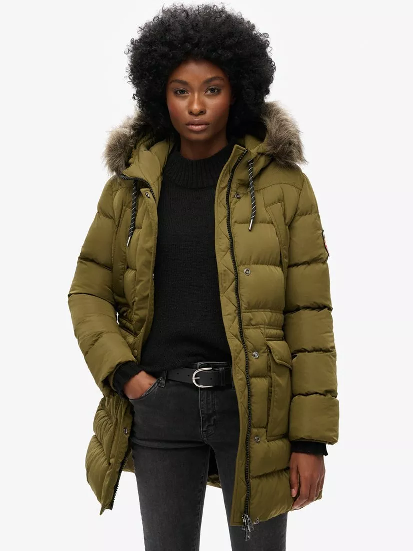SuperdryEverest Mid Faux Fur Puffer Jacket, Dark Olive