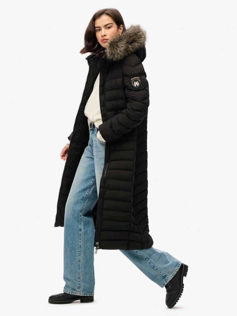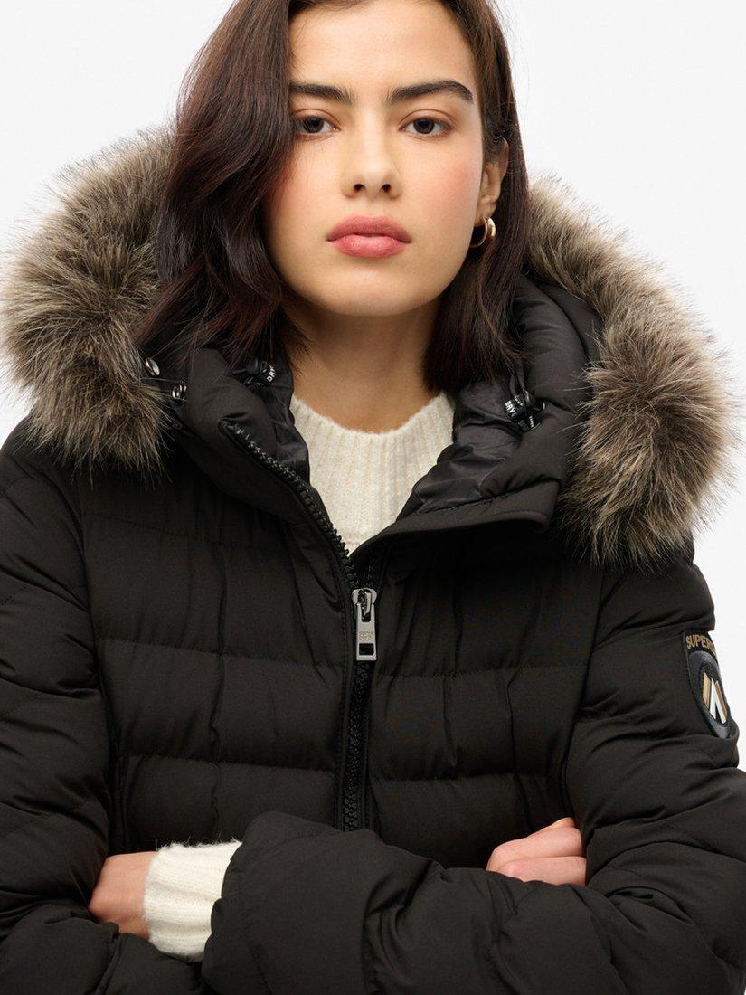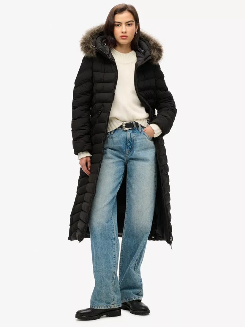 Padded throughout and featuring a removable faux fur trim, we've crafted it to fit in with your chic dress sense. Two front zip pockets. One internal pocket. Elasticated cuffs. Hem side splits with popper fastening. Sewn-in Superdry logo on the side arm.