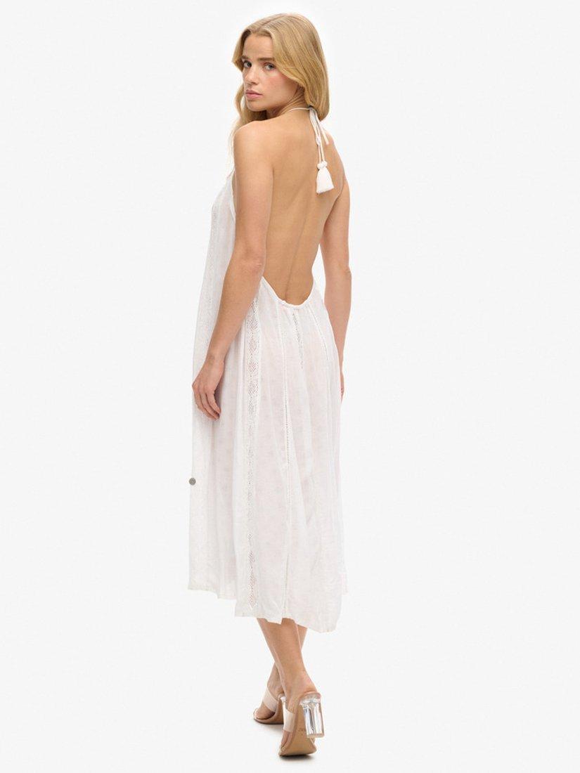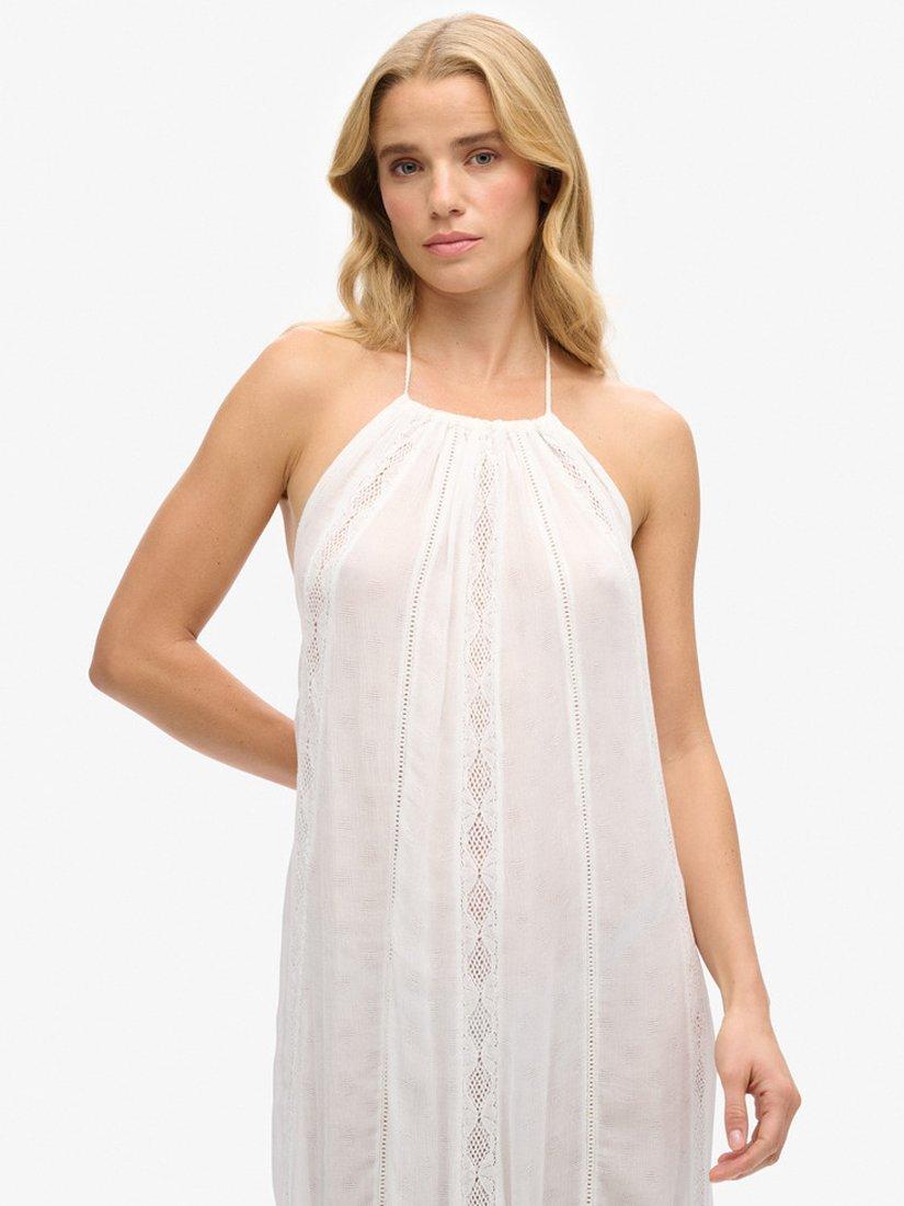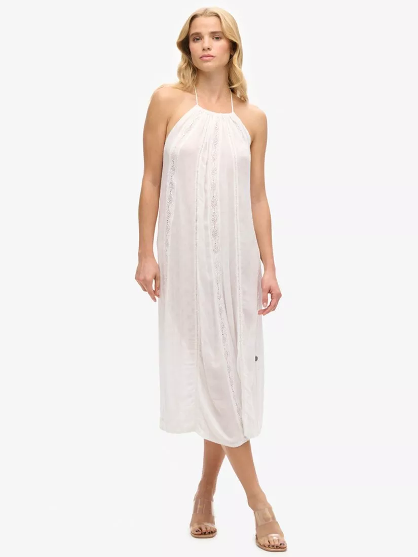 In a flattering fit that accentuates the waist, this mid-length dress from Superdry is dreamt up from a whisper-weight viscose blend. With a neat halter neck, this sleeveless style looks to intricate lace for all its detail.