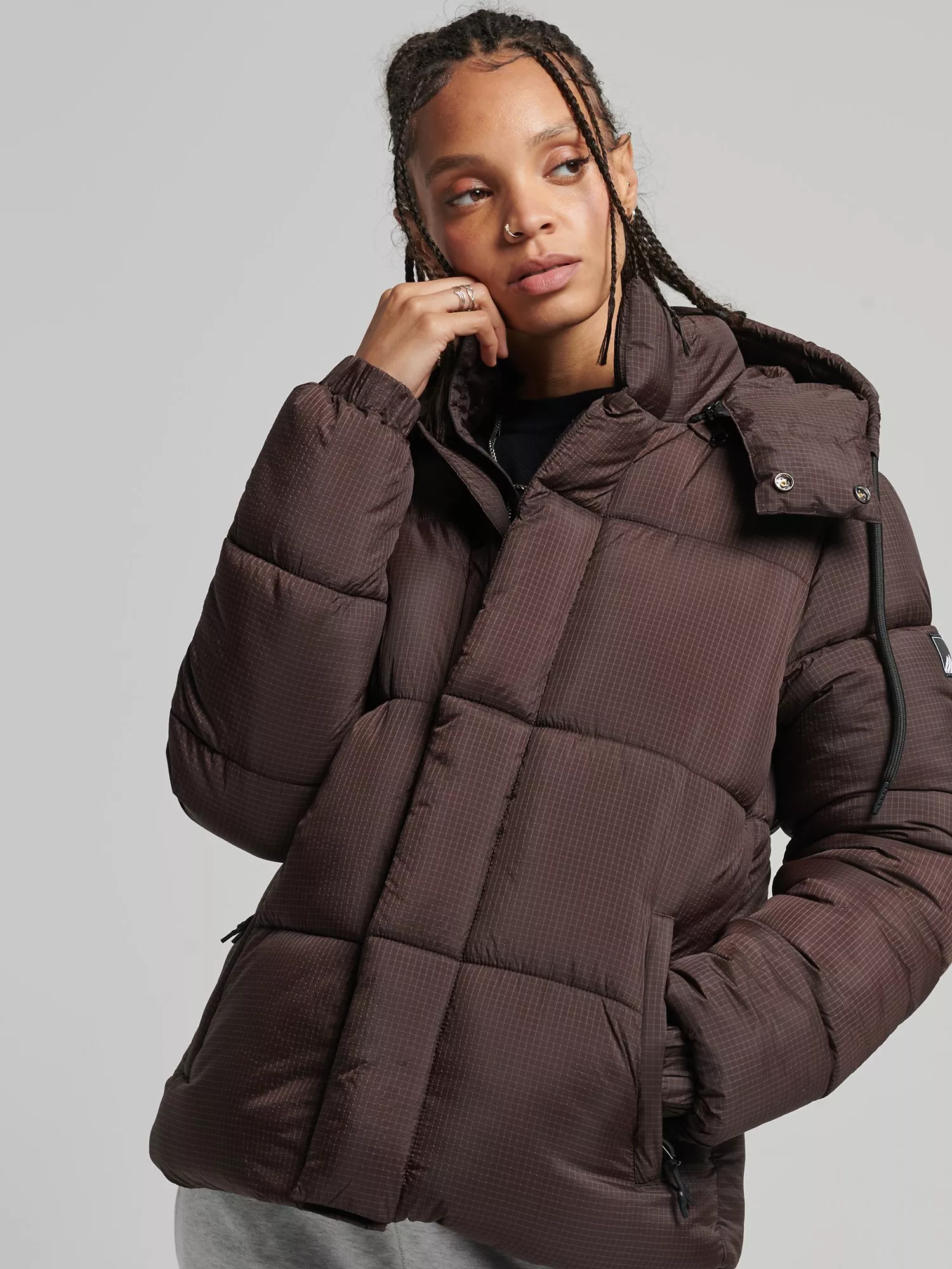 A wardrobe staple for winter weather, this puffer coat from Superdry falls to a regular length.