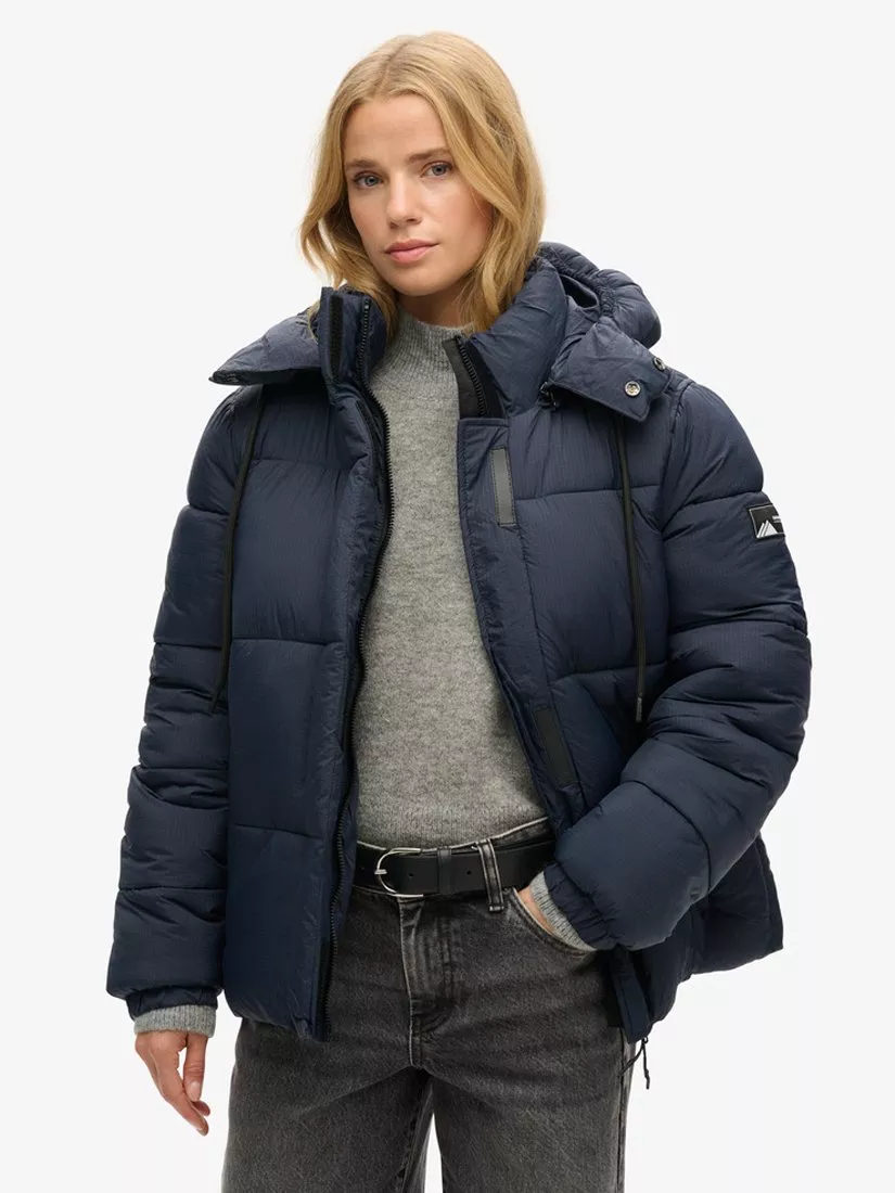 A wardrobe staple for winter weather, this puffer coat from Superdry falls to a regular length.