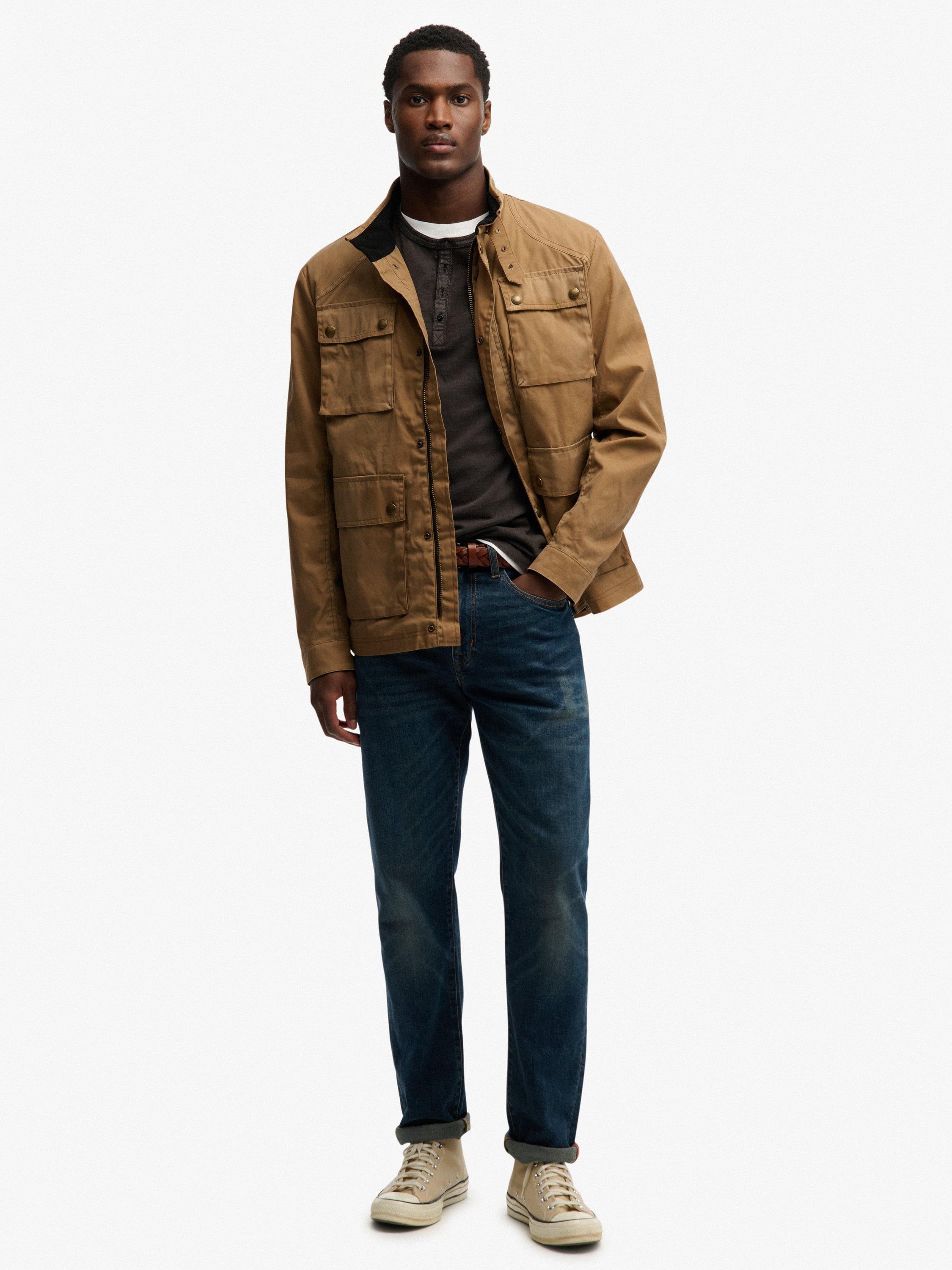 This jacket has adjustable popper cuffs, one inner pocket and four outer pockets, which have a branded button fastening. The jacket has both a dual zip and popper fastening, and a sewn-in metal Superdry badge on the right sleeve.