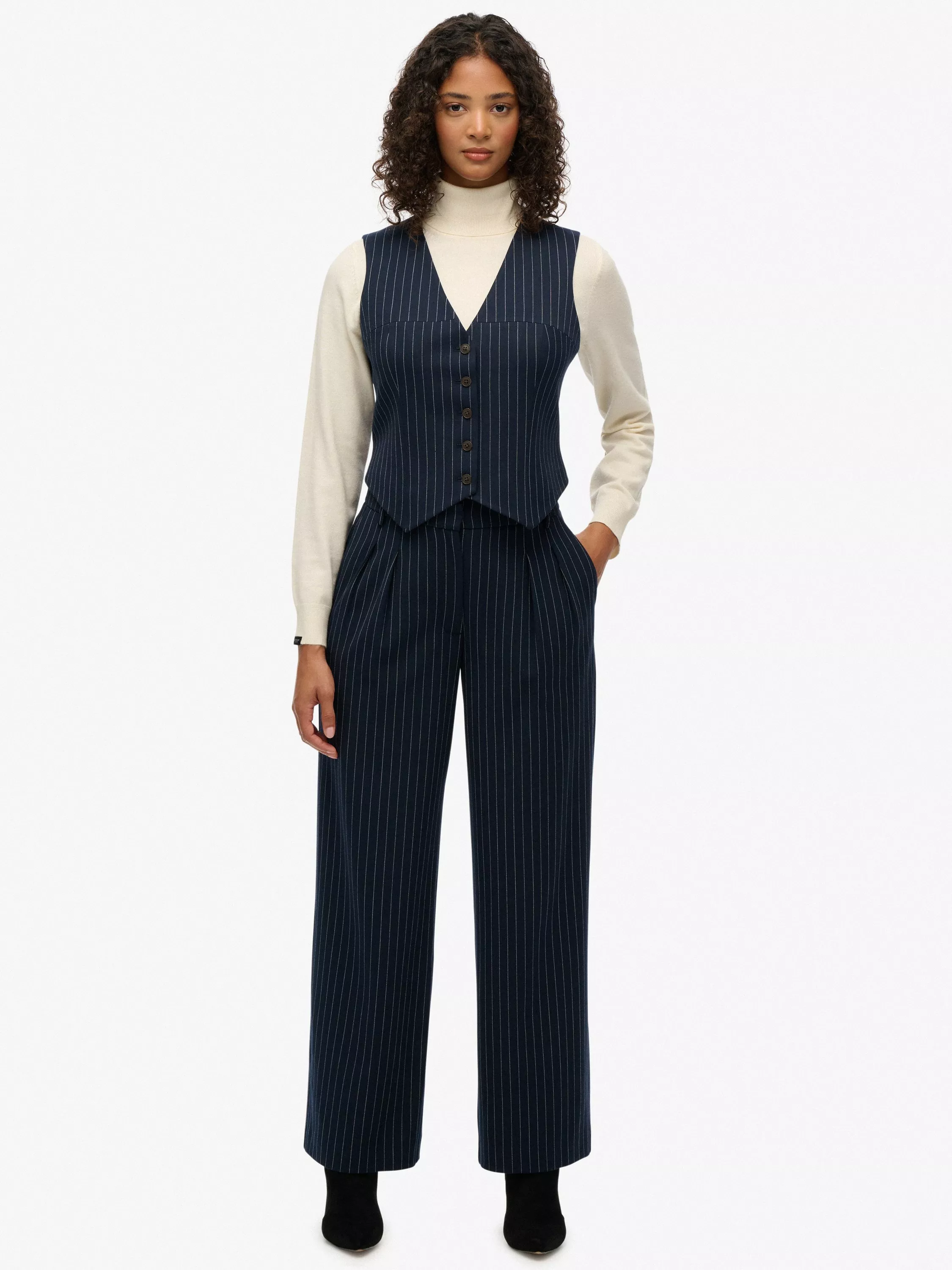 SuperdryMid Rise Wide Tailored Trousers, Navy Pinstrp