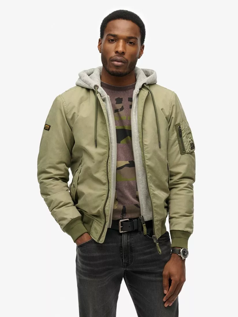 An urban twist on a Superdry classic. The Military MA1 Bomber Jacket has been curated with only the finest details, an attached hood gives the illusion of layering and the rugged patches on both sleeves only add to the worn, vintage vibe.