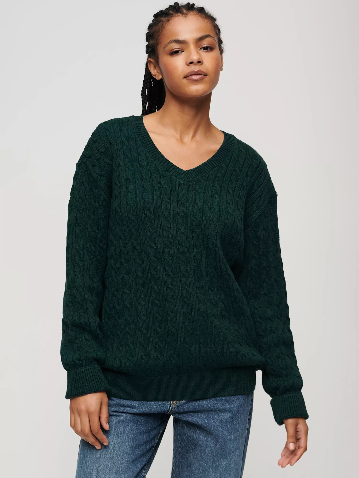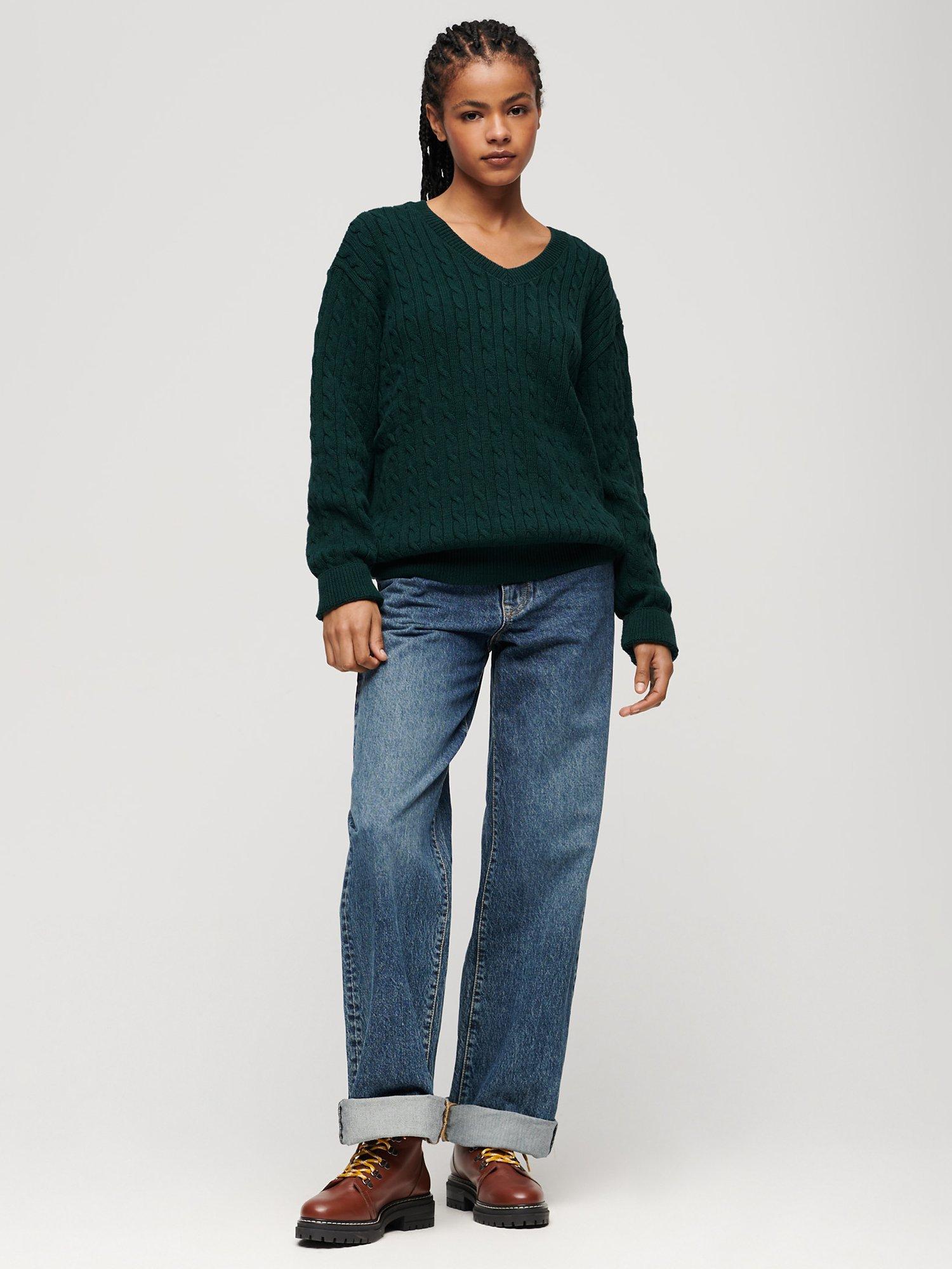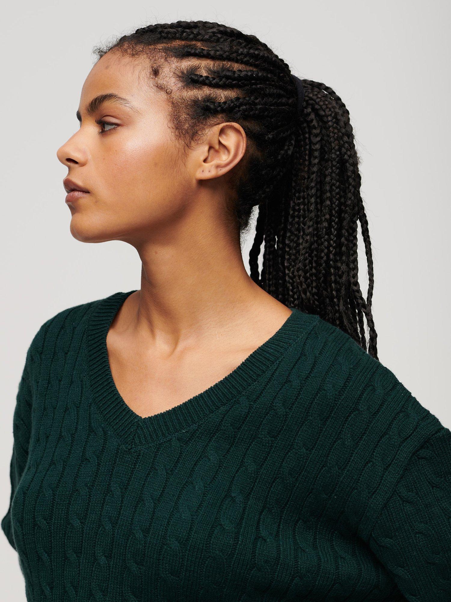 SuperdryOversized V-Neck Cable Knit Jumper, Dark Pine Green