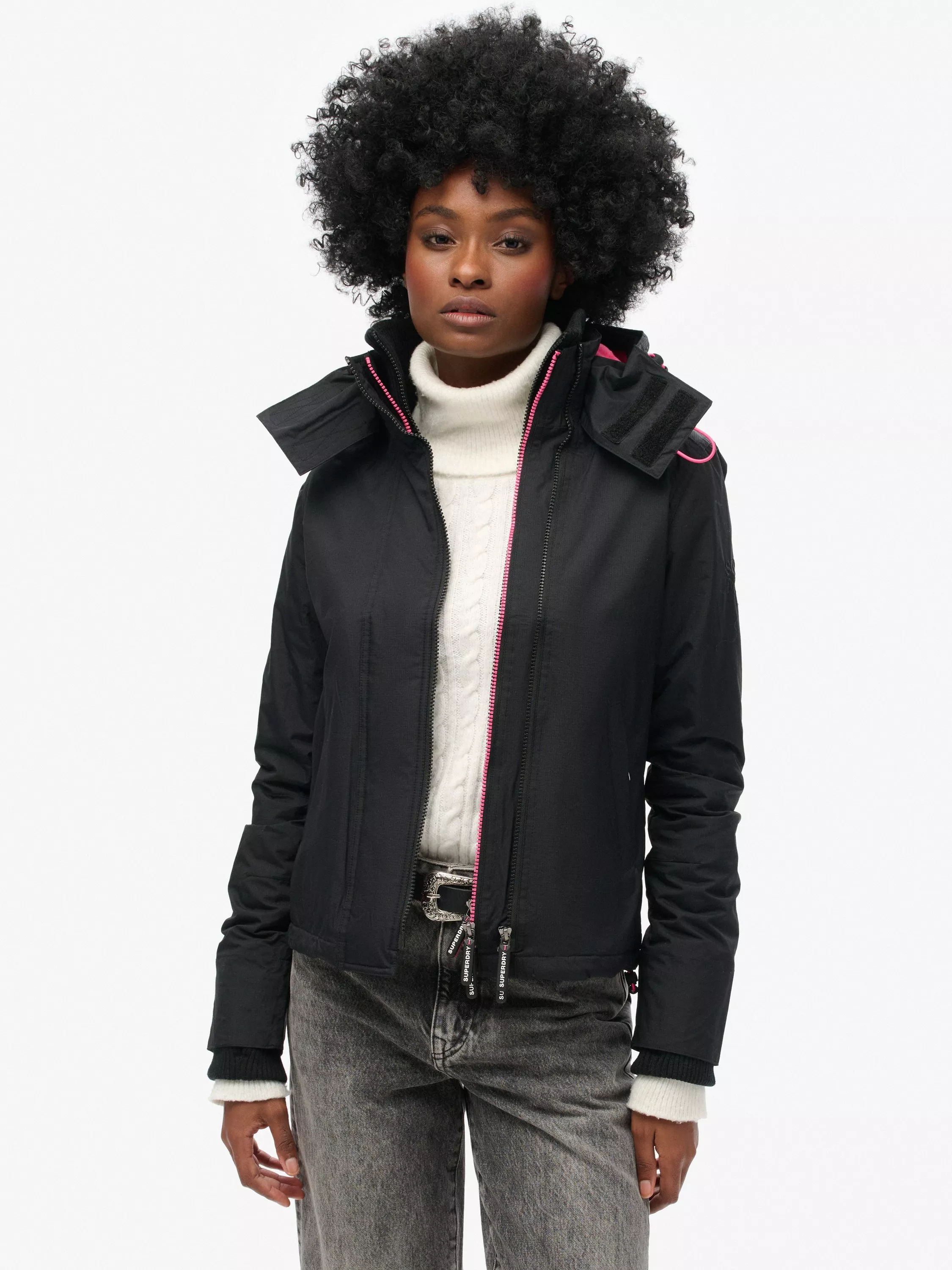 SuperdryPop Zip Hooded Arctic SD-Windcheater Jacket, Black/Punk Pink