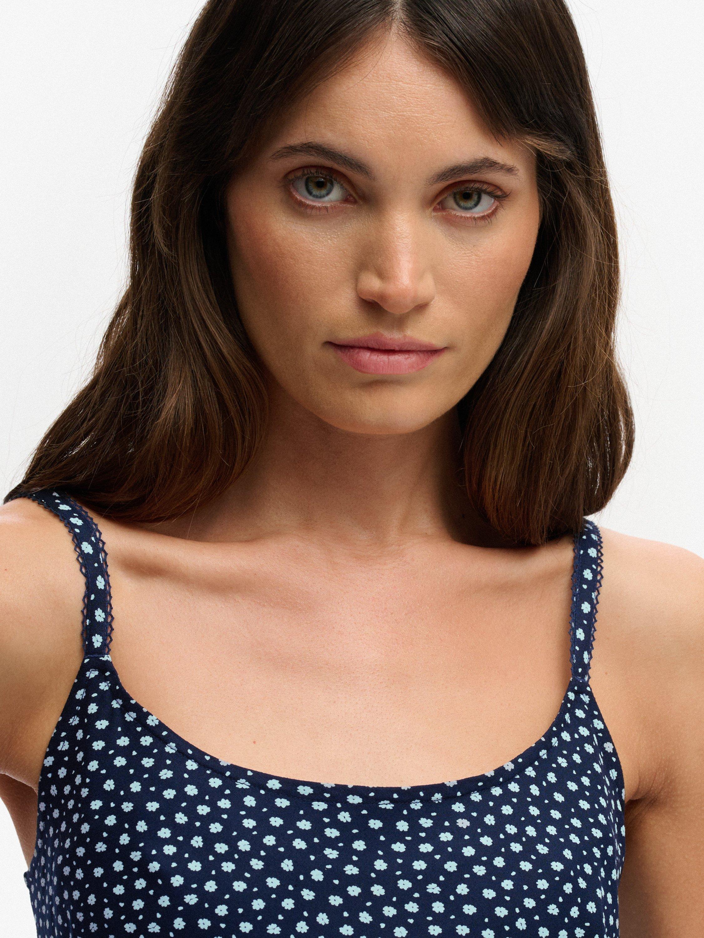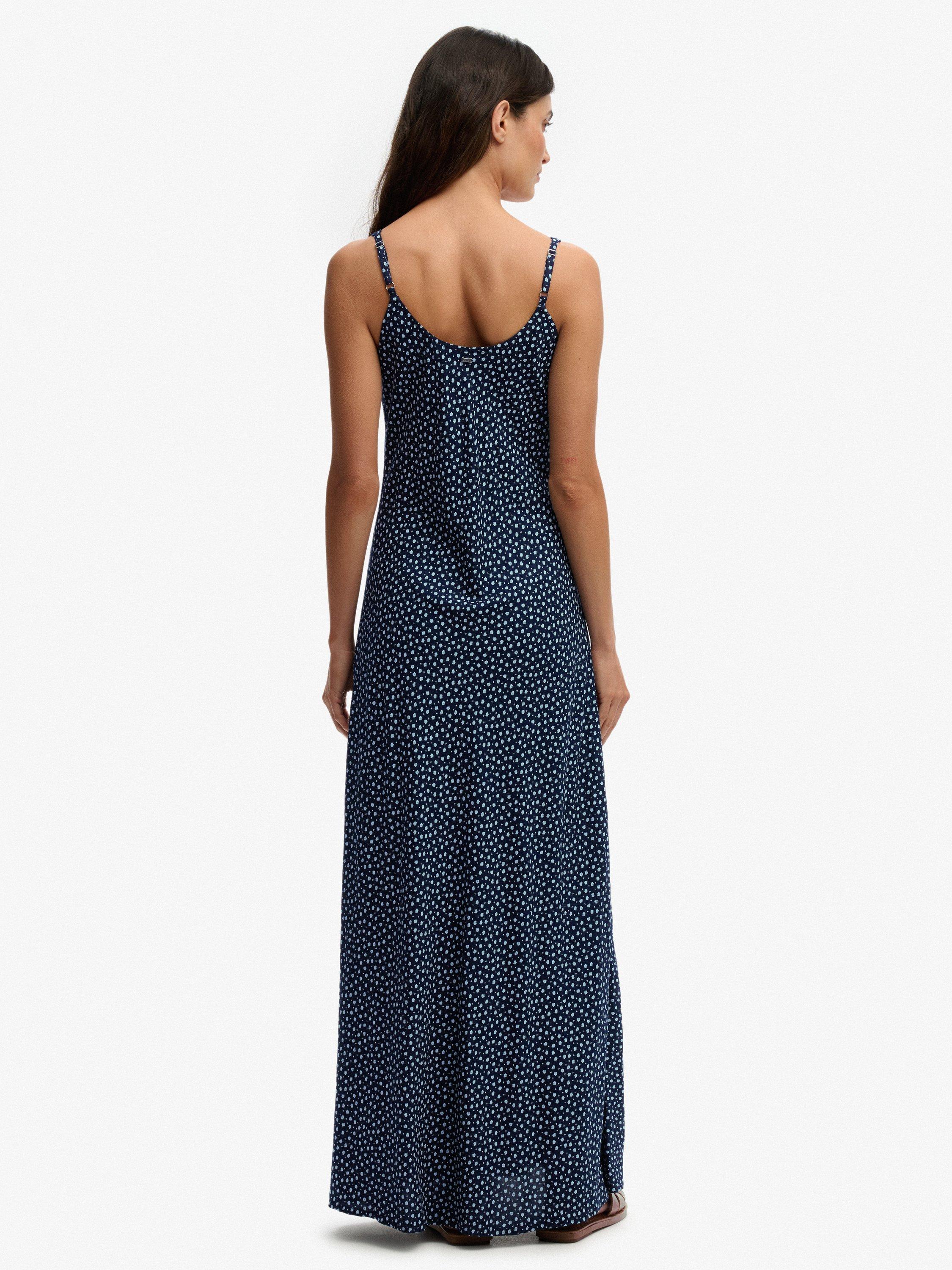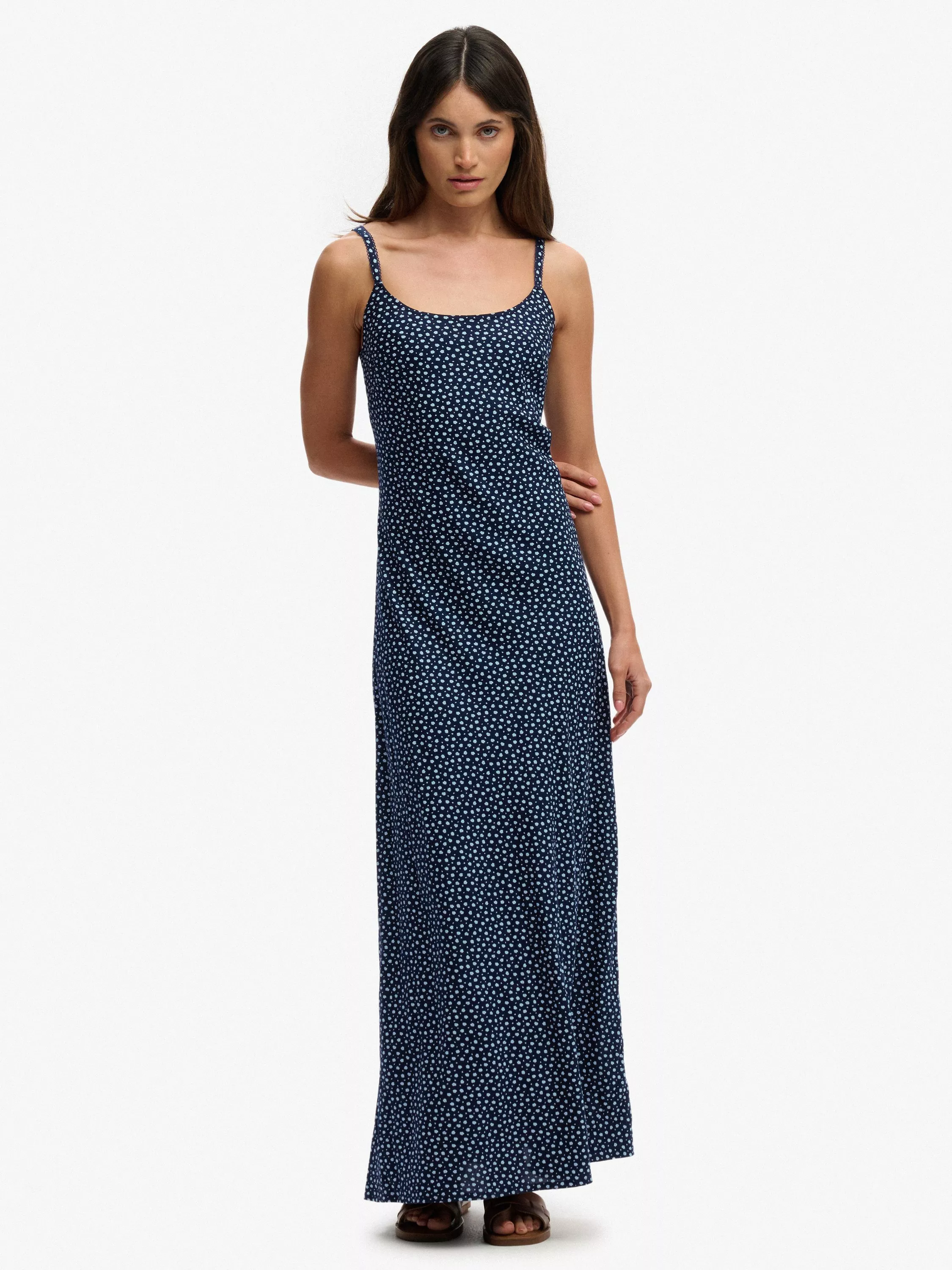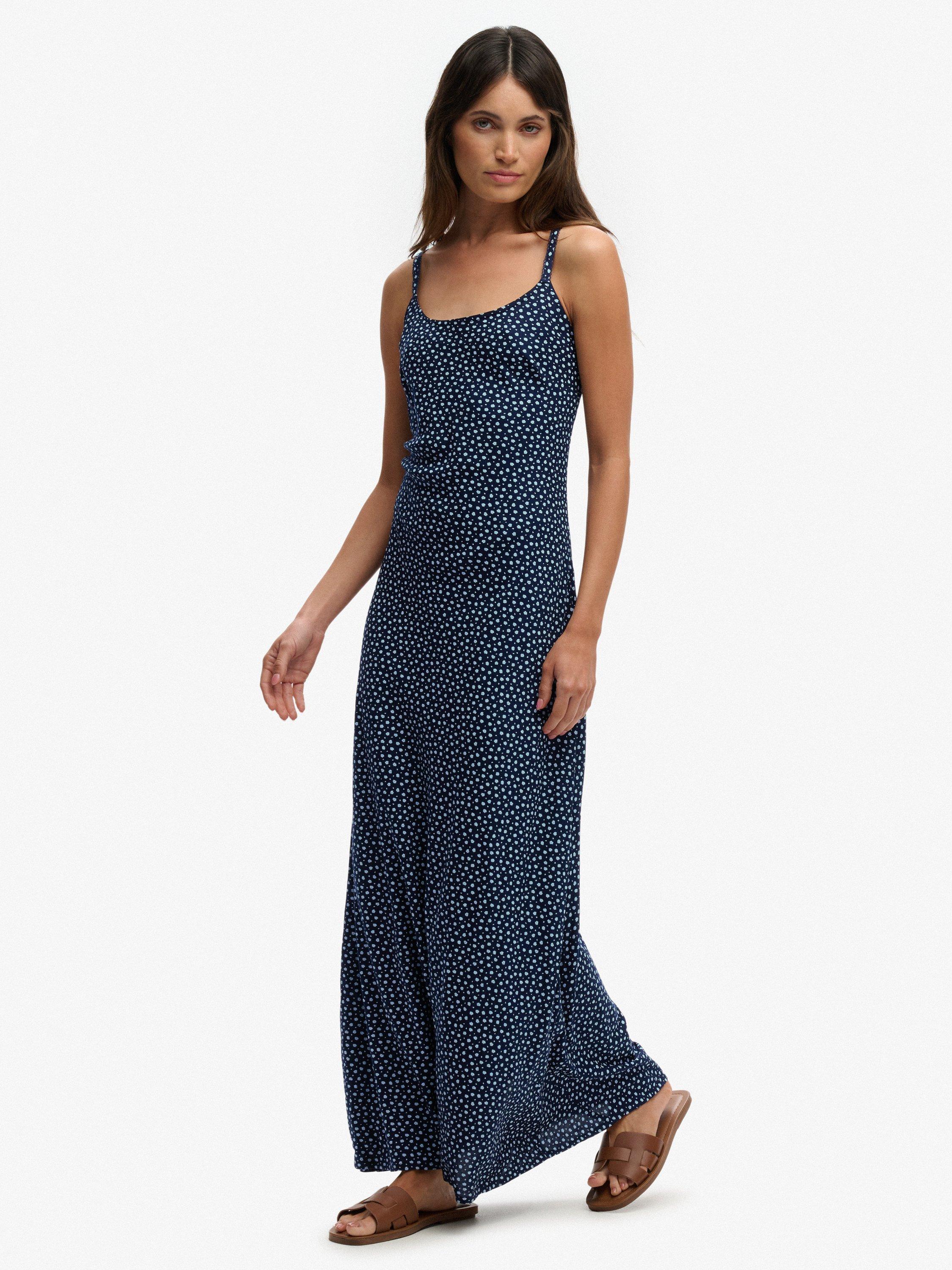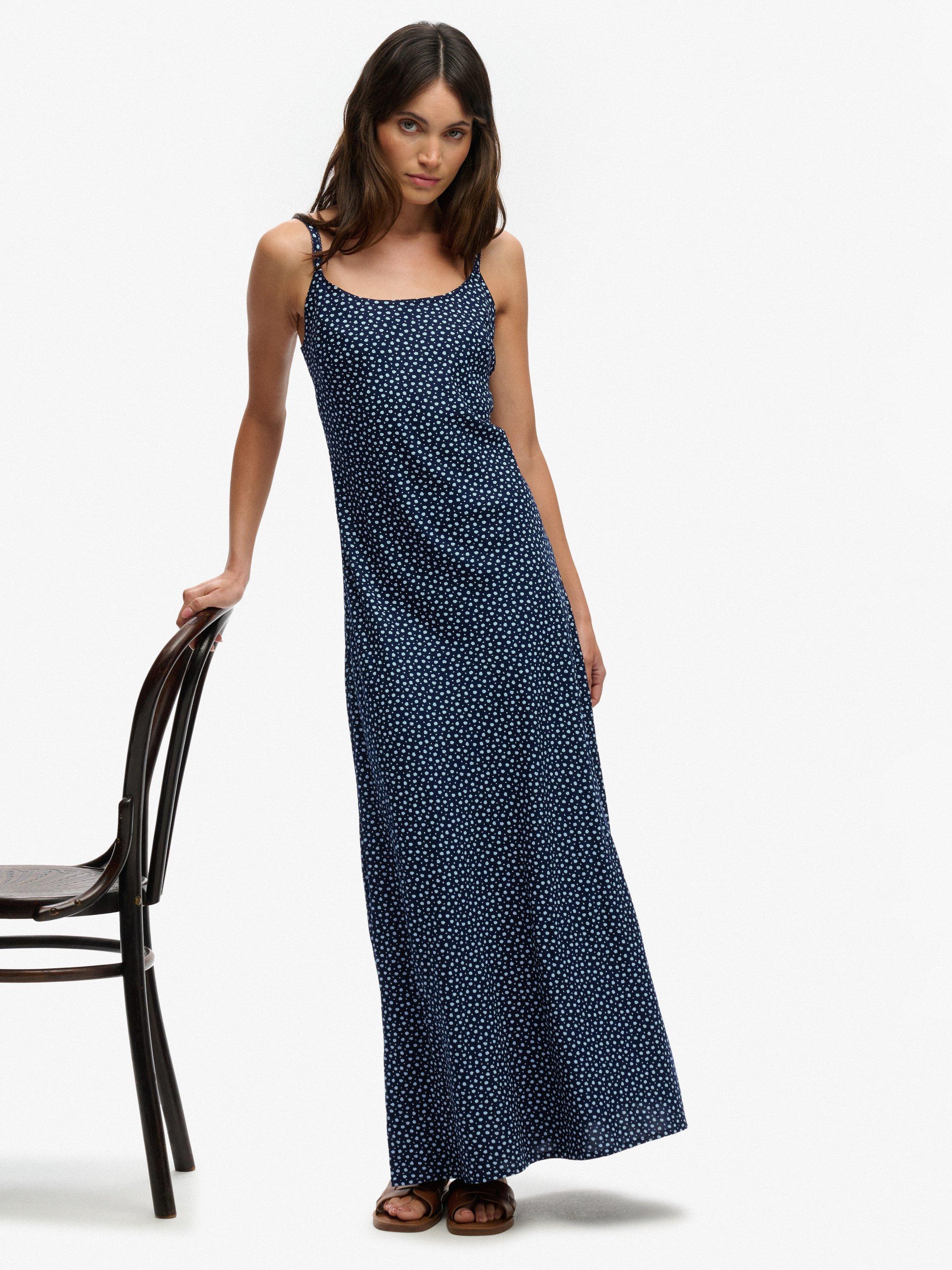 Designed with a feminine slim fit, maxi length and adjustable spaghetti straps, this dress is complete with a signature metal tab on the back neckline.
