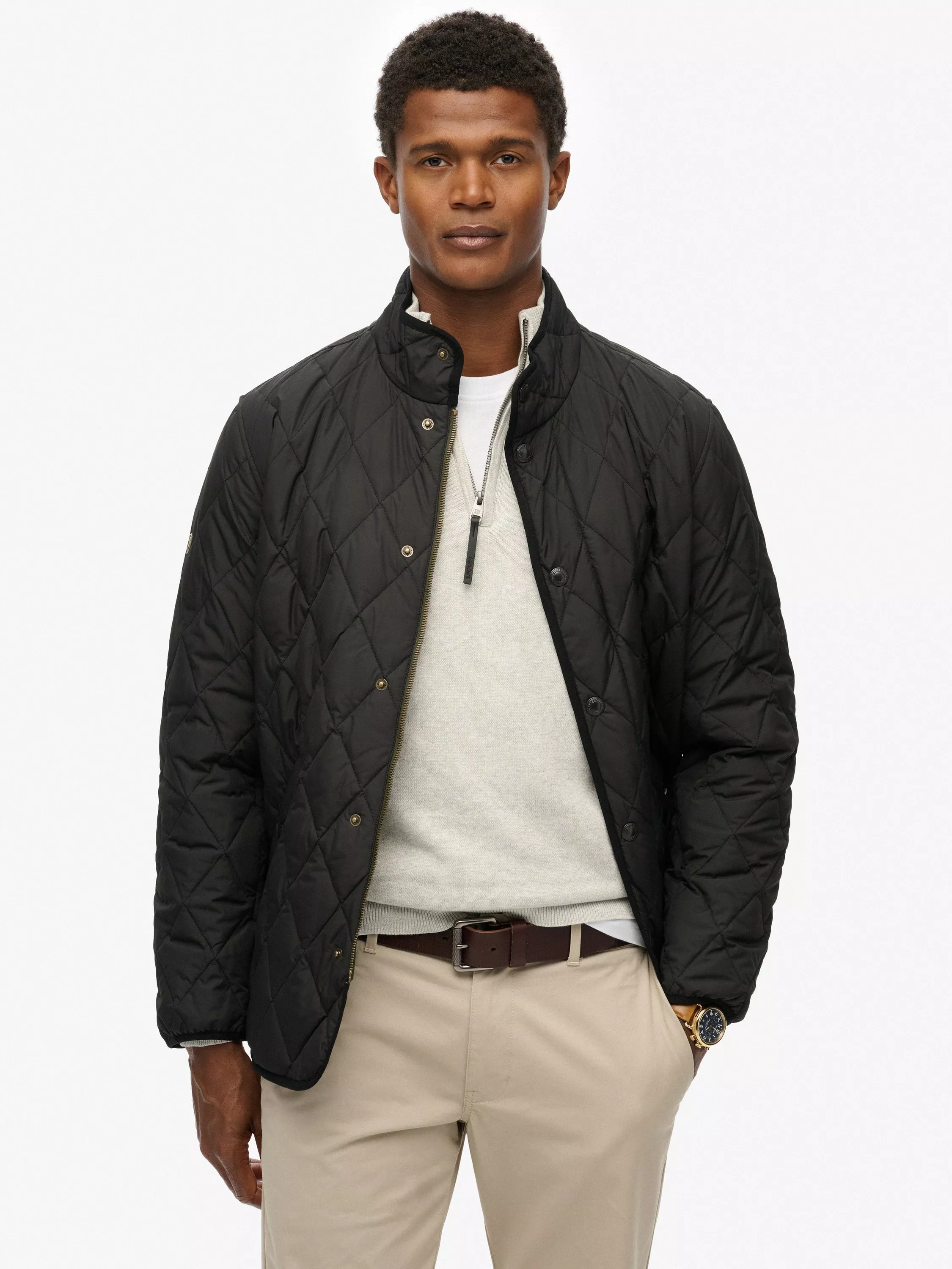 Quilted estate jacket cut in a slim fit, designed to fit closer to the body for a more tailored look. Dual zip and popper fastening. Two external popper pockets. Corduroy collar. Elasticated cuffs. Sewn in metal Superdry badge on right sleeve. Embroidered Superdry logo on chest.