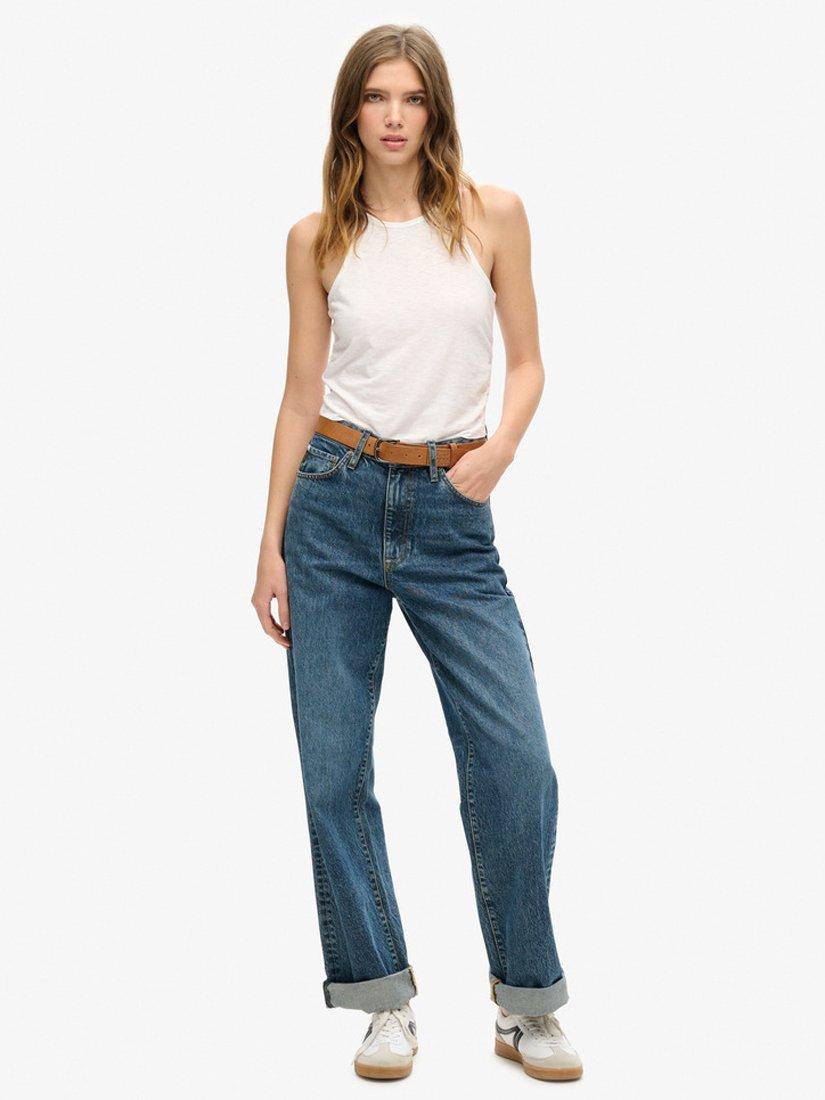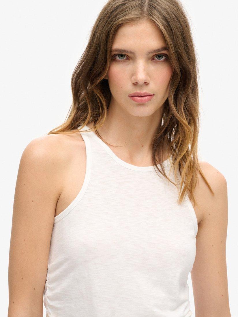 Simply cut with a round neck and a sleeveless design, it is made from a soft cotton blend and slips on well with tonal denim ready for the summer.