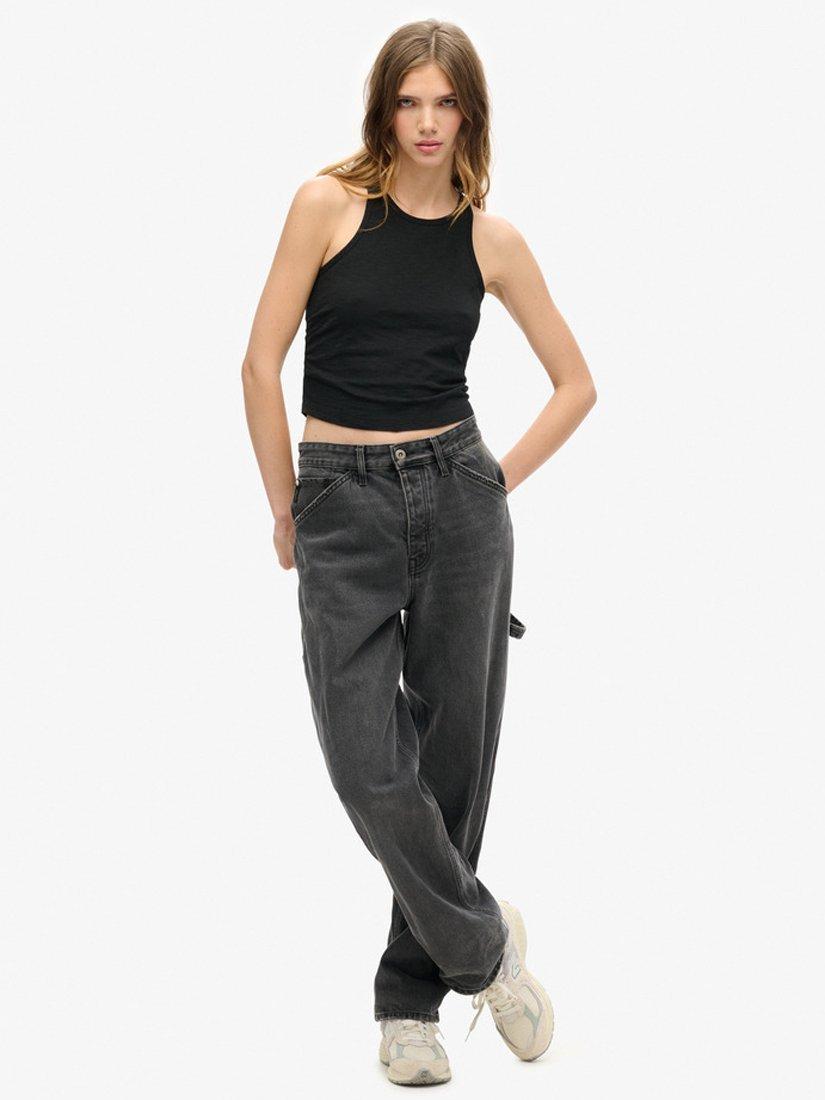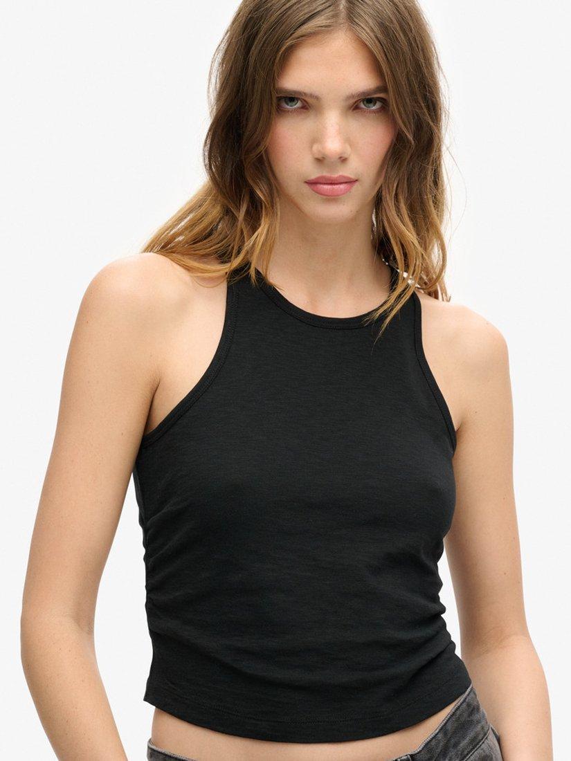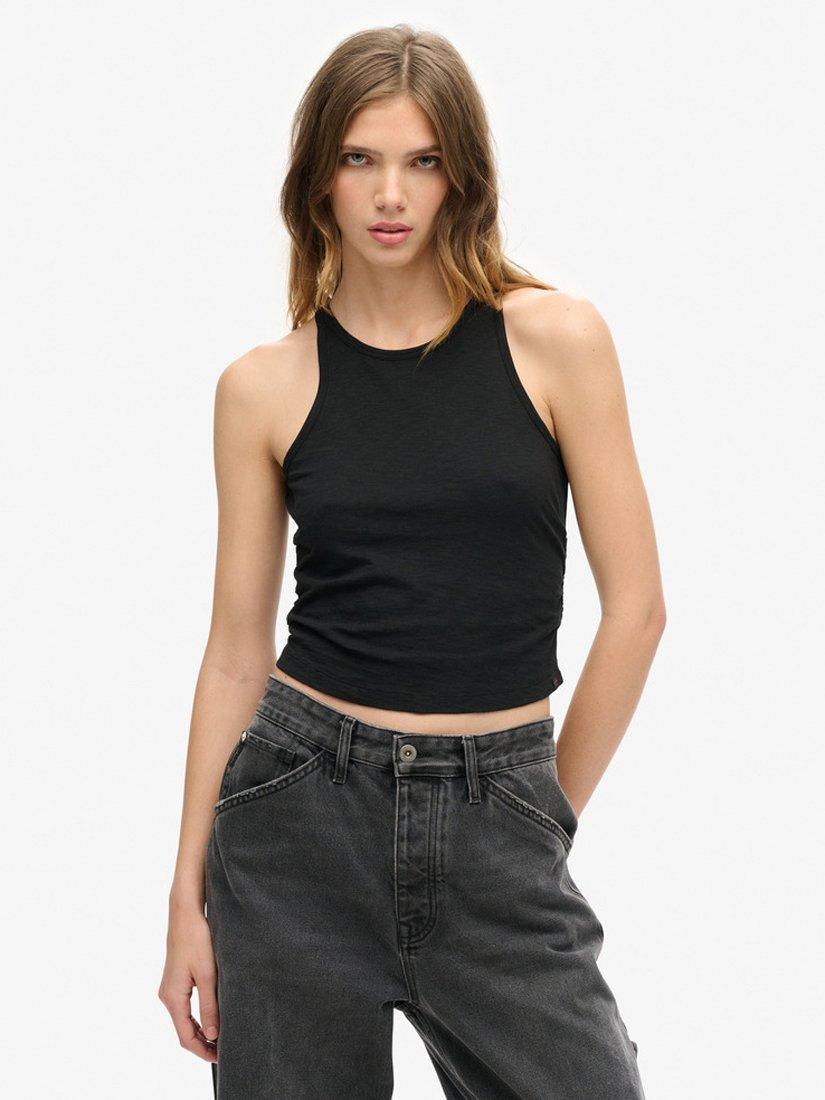 Simply cut with a round neck and a sleeveless design, it is made from a soft cotton blend and slips on well with tonal denim ready for the summer.