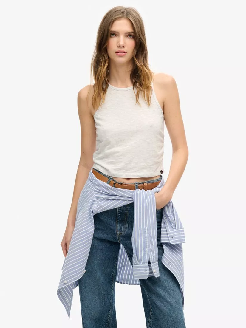 Simply cut with a round neck and a sleeveless design, it is made from a soft cotton blend and slips on well with tonal denim ready for the summer.