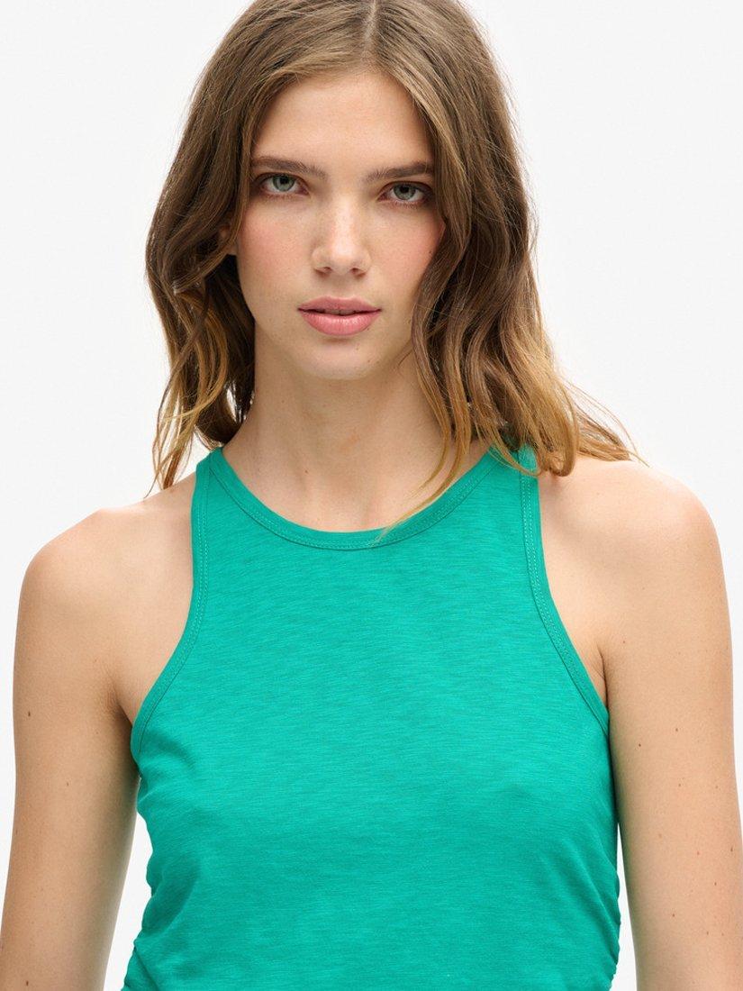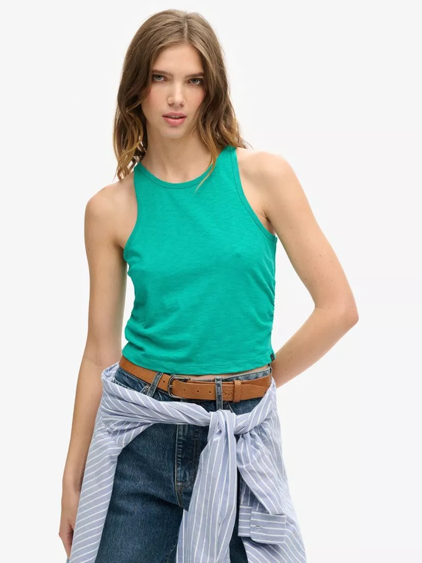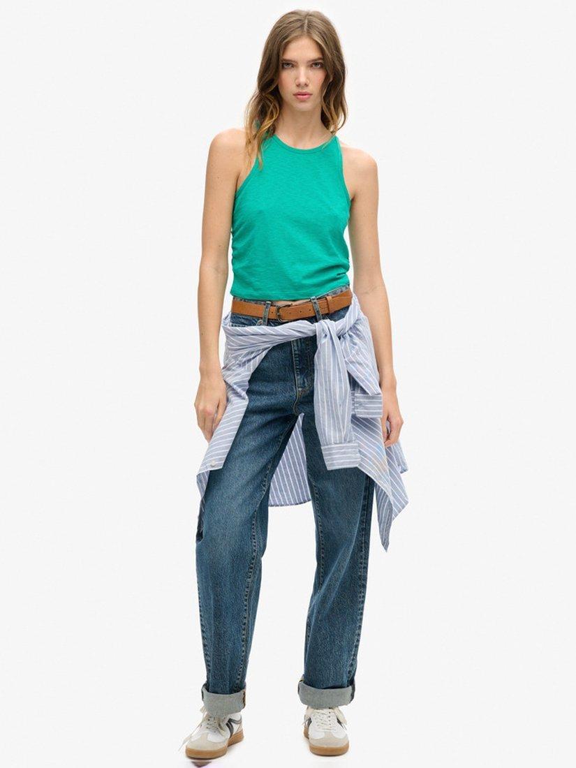 Simply cut with a round neck and a sleeveless design, it is made from a soft cotton blend and slips on well with tonal denim ready for the summer.