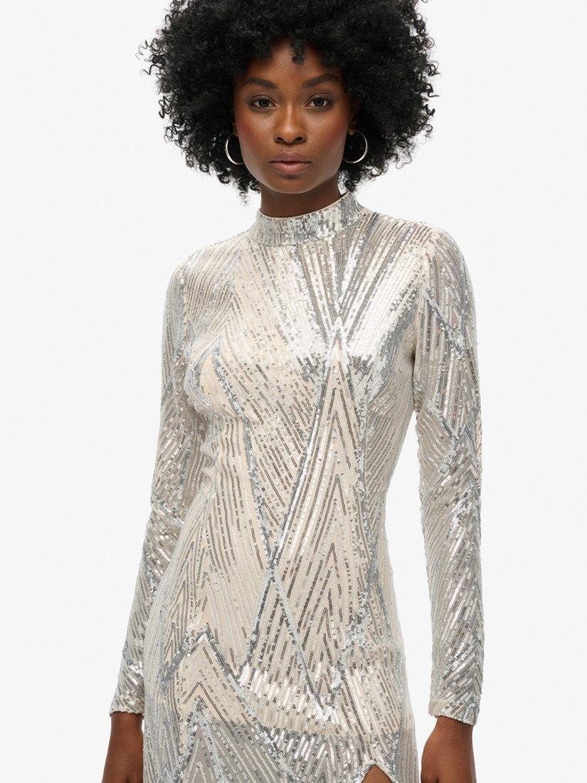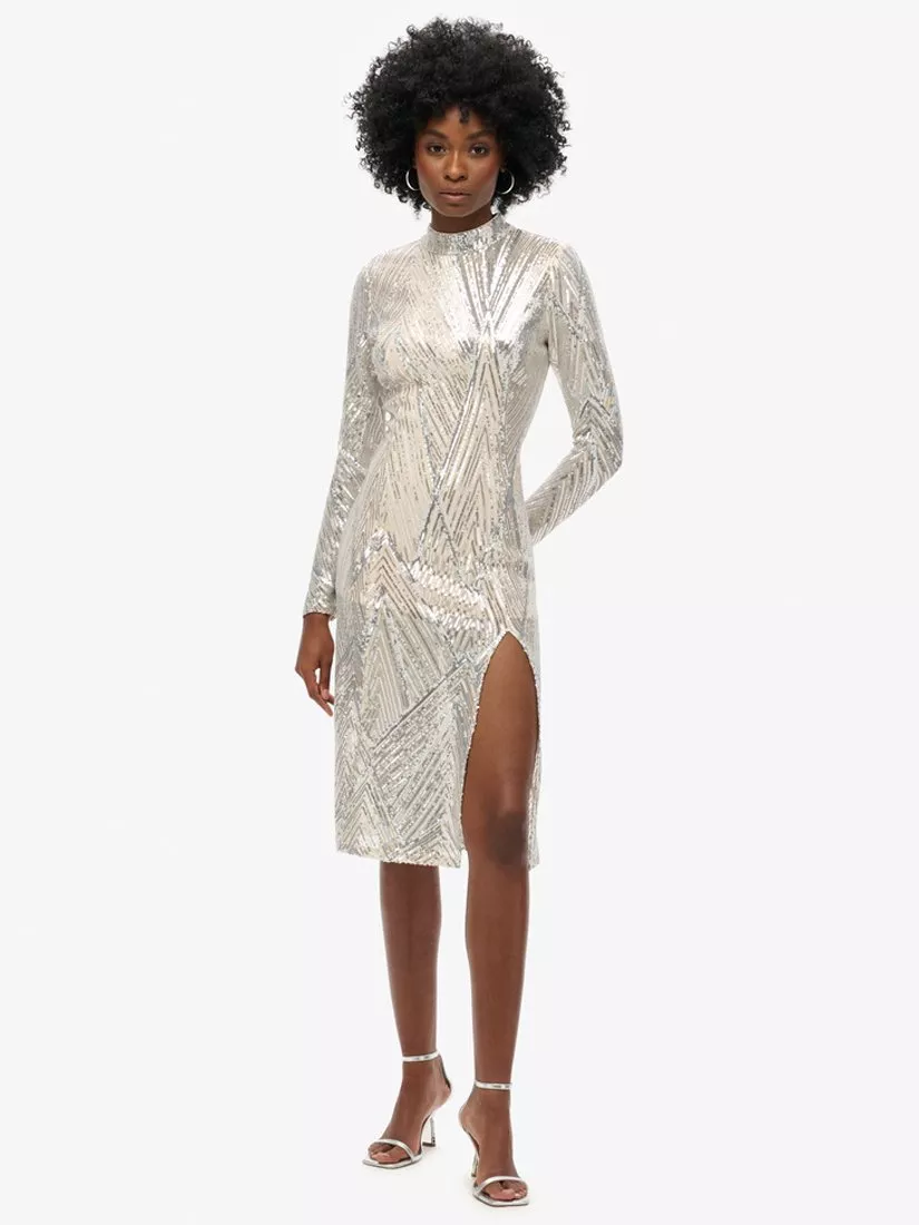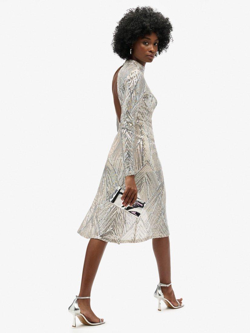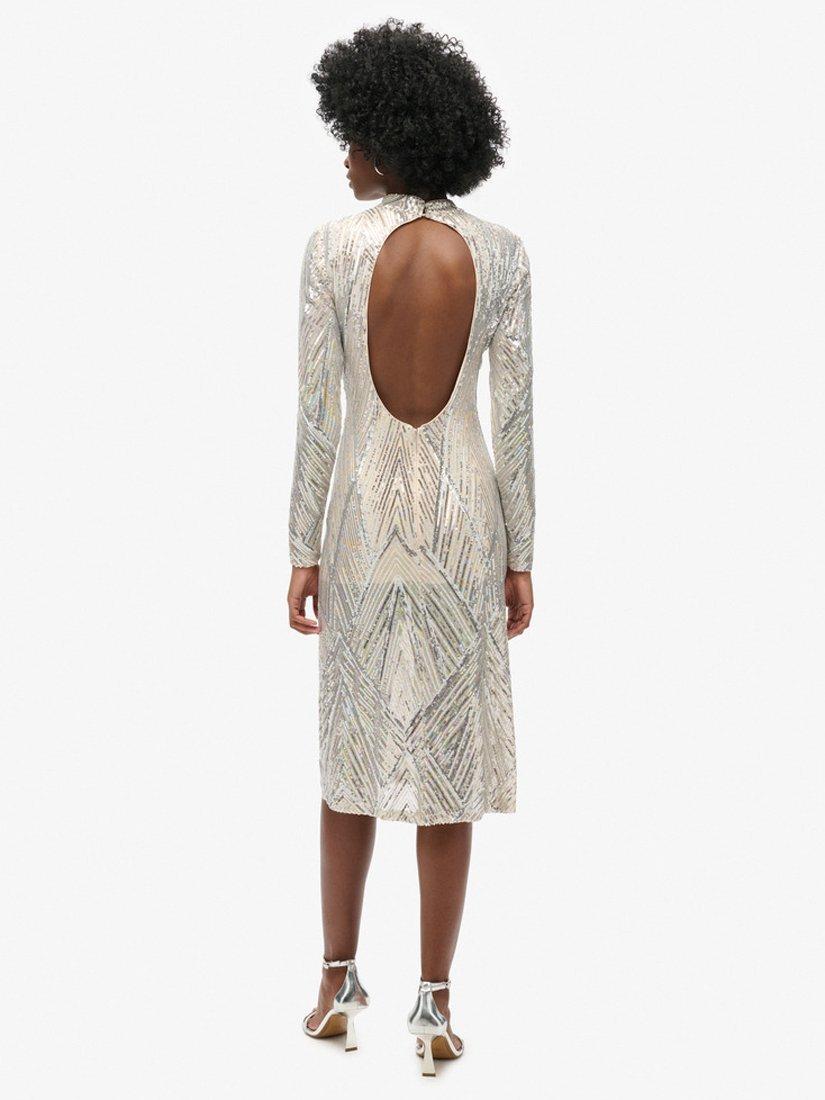 Feel and look stunning this season with our Open Back Long-Sleeved Midi Dress. Crafted with a slim fit and an open back, you'll be turning heads all season long and, let's not forget, lighting up the room with the gorgeous embroidered sequin details.