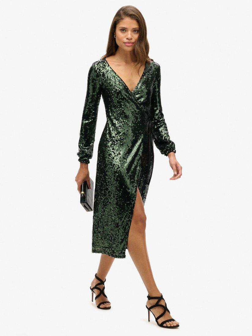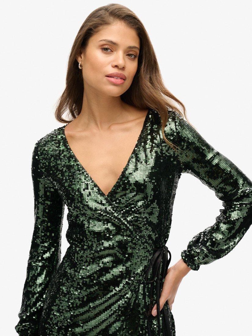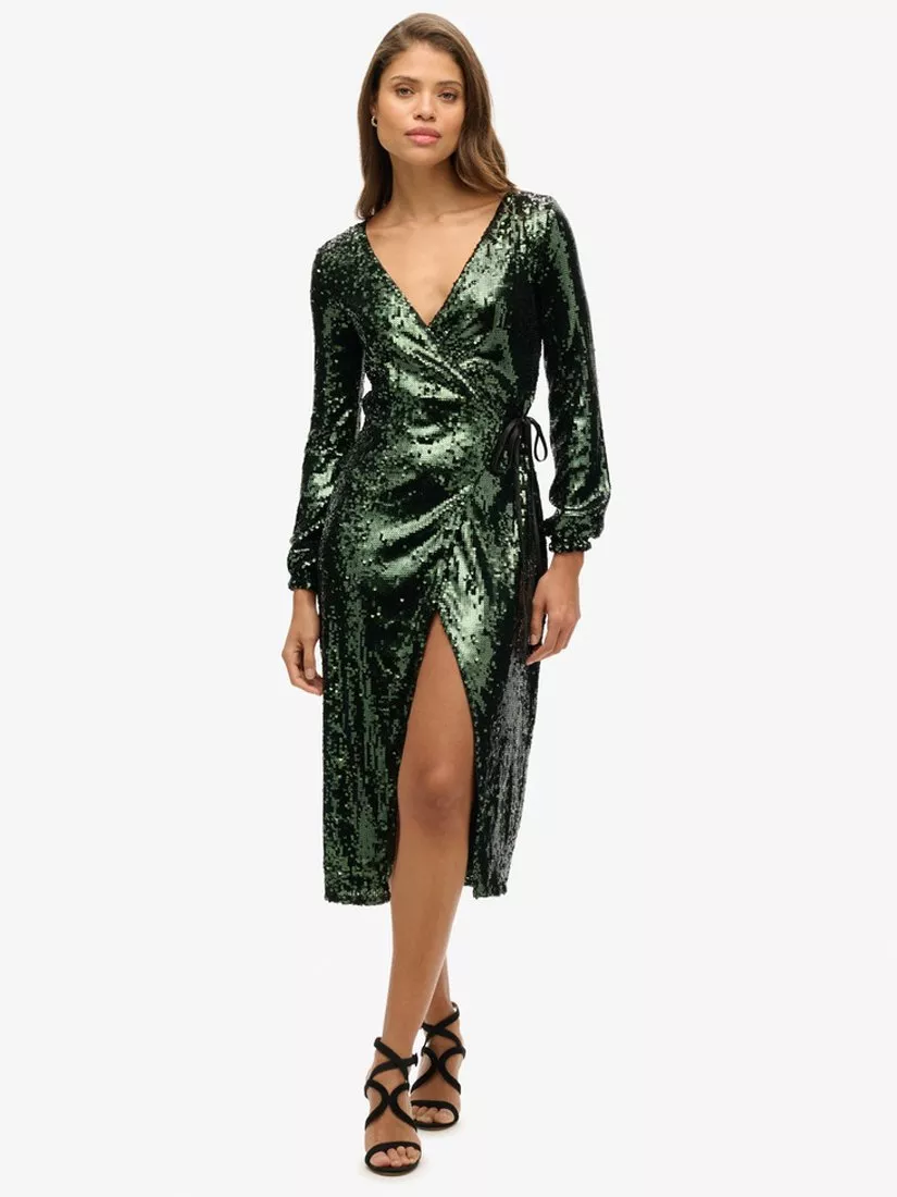 In a shape that really flatters, this floor-length dress from Superdry is crafted from a blend of fabrics. A classic option thanks to the wrap over neckline and long sleeves, it comes in a profusion of twinkling embellishments.