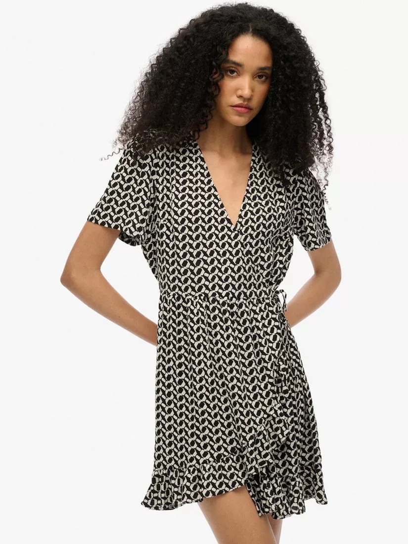 The Short Sleeve Printed Mini Wrap Dress has been carefully curated with a frilled hemline and a woven material to become your go-to for summer activities and holidays. The wrap style creates a stunning silhouette and makes it easy to style with your favourite sandals or trainers this season.
