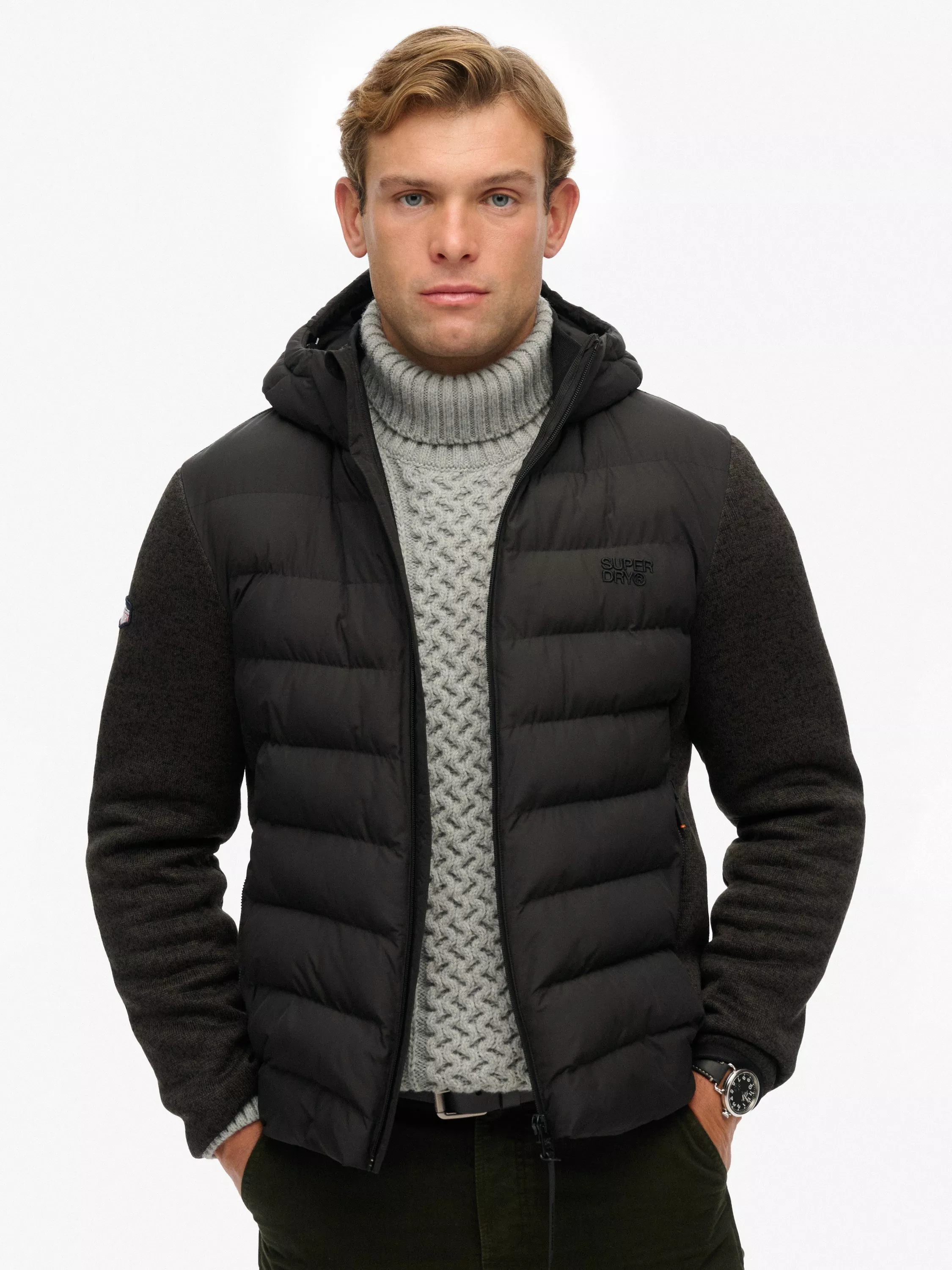 Designed for a tailored silhouette, this jacket has a slim fit. It is lightly padded on the front panels and hood for extra warmth, while the jersey sleeves and back panel allow for movement and comfort. The jacket has elasticated cuffs, a ribbed inner collar, and a bungee cord adjustable hood. It's a functional and stylish piece with a zip fastening and three pockets – two external zip pockets and one internal mesh pocket. An embroidered badge on the right sleeve adds a subtle branded finish.
