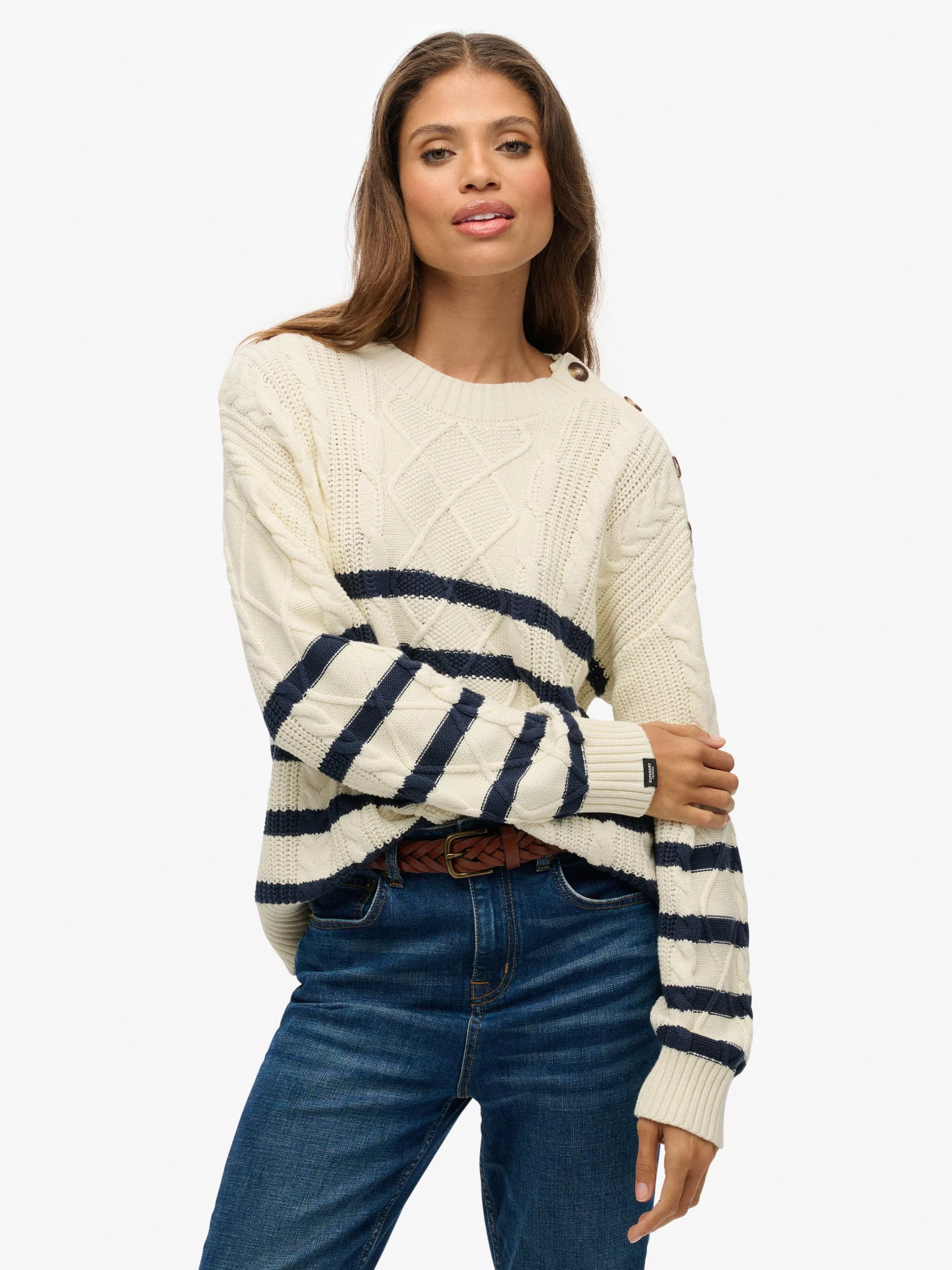 The Cable Crew Neck Jumper is the perfect autumnal addition to your wardrobe rotation. Expertly designed with gorgeous dropped sleeves and a chunky cable knit material, you can style the jumper however you like to achieve an effortless, versatile look.