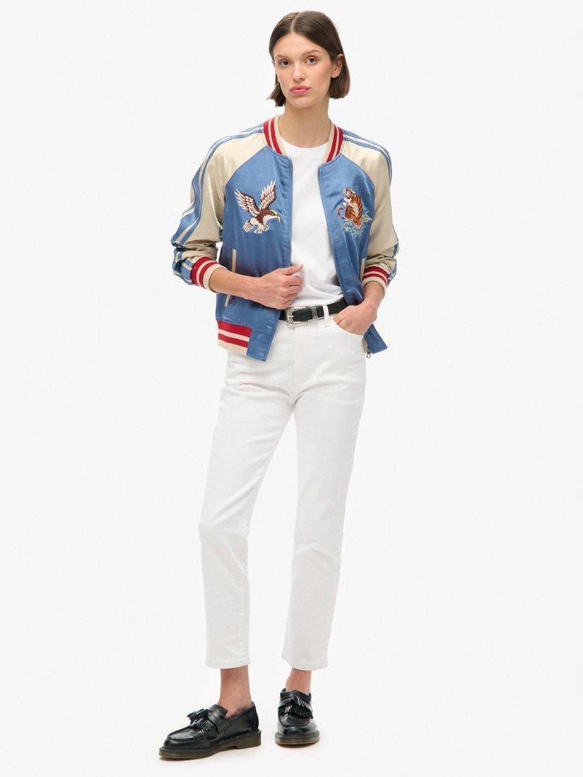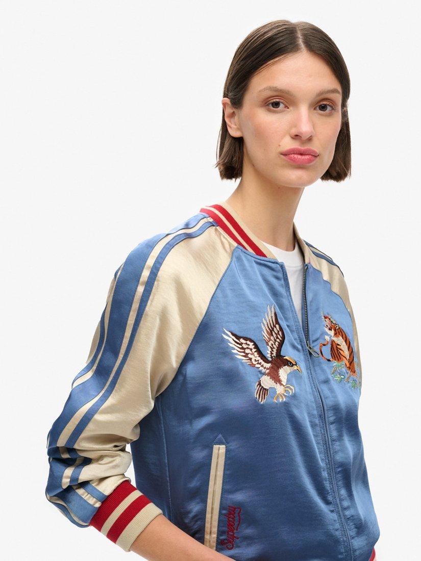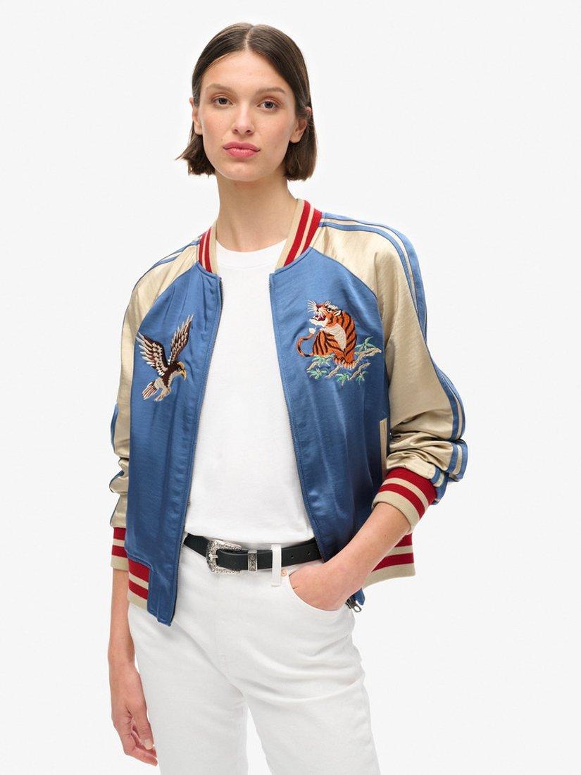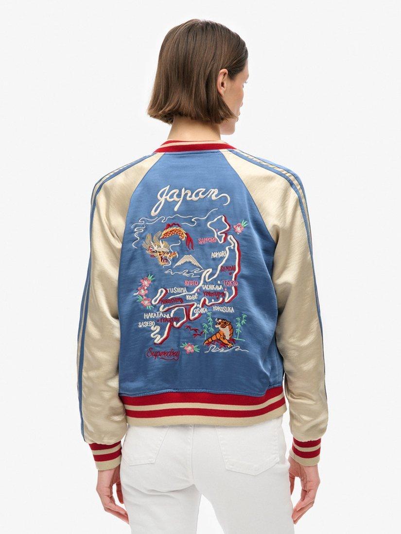 Crafted with heritage and attention to detail. Our Sukajan Embroidered Bomber jacket pays homage to Japanese and American varsity jackets whilst still being distinctively Superdry. The material has a soft, comfortable silk feel; it is embroidered with a map of Japan on the back and embroidered images on the front to showcase its mixed culture of Japan and America.