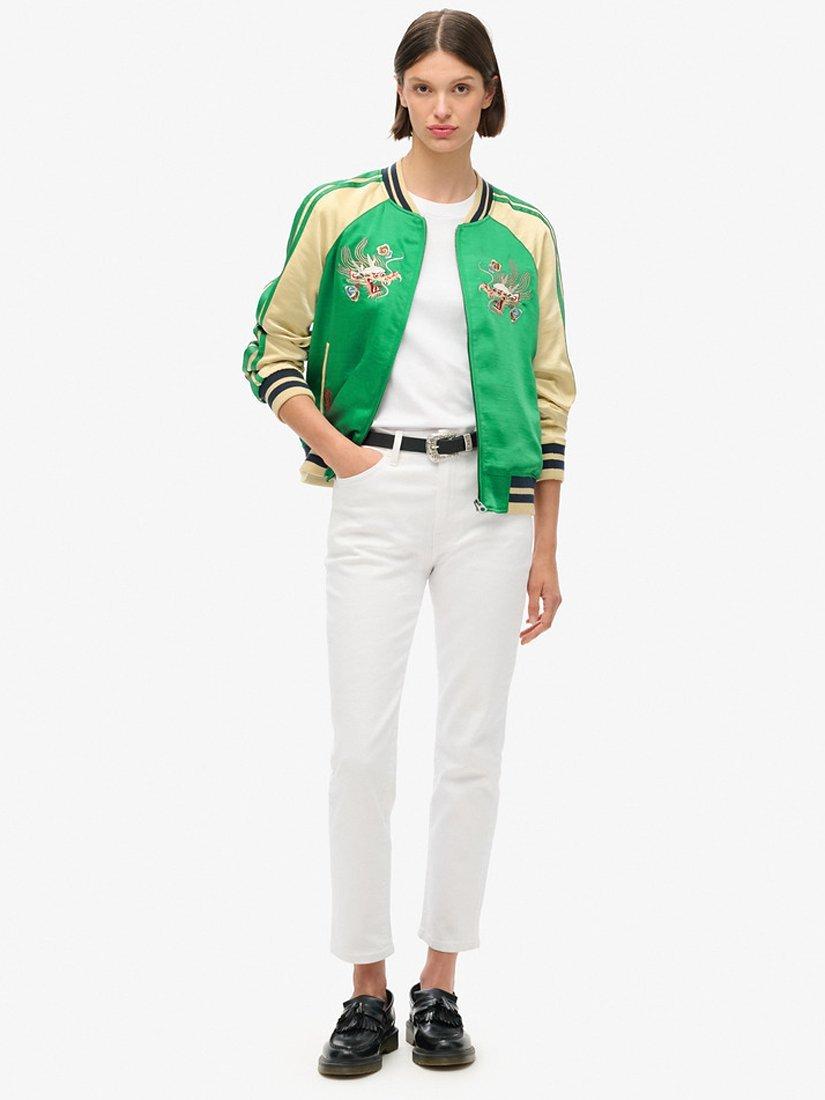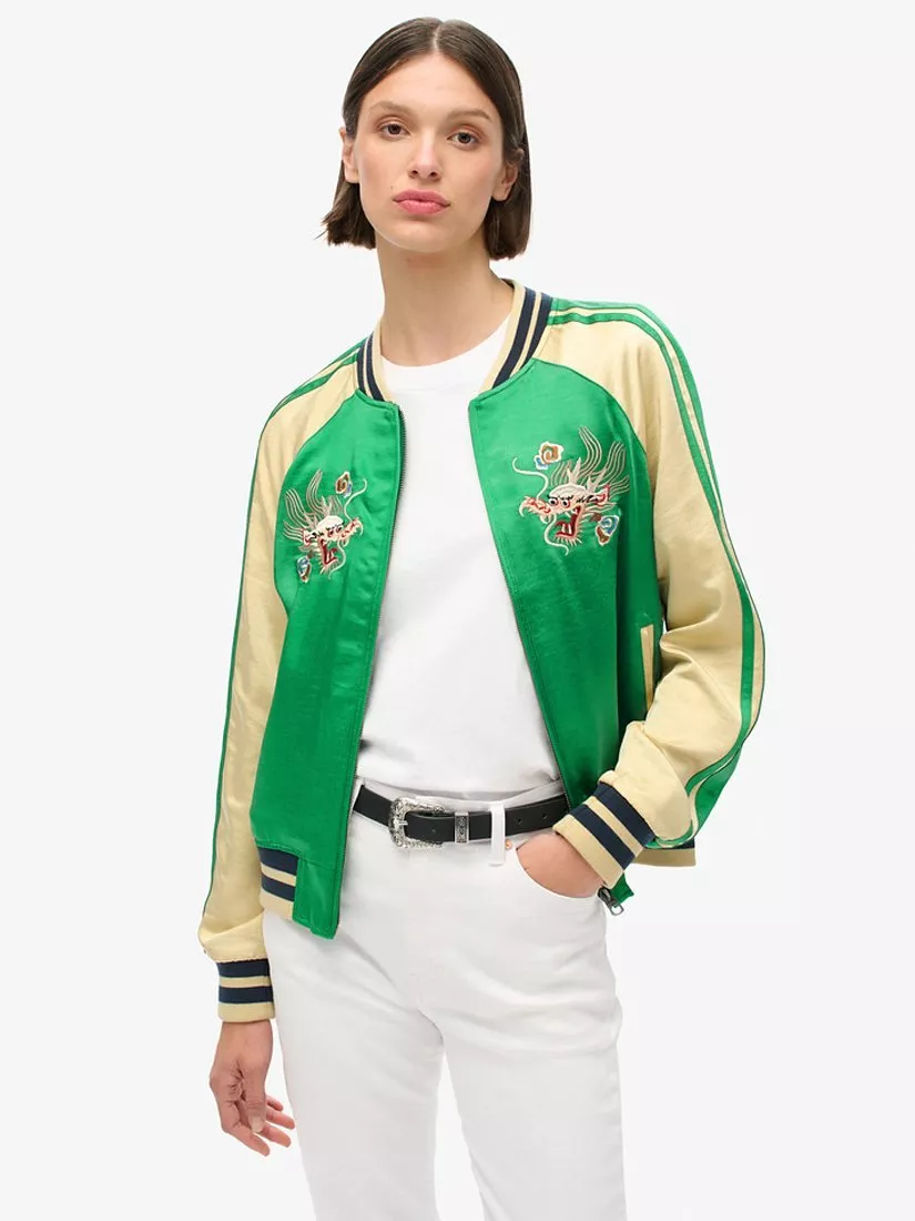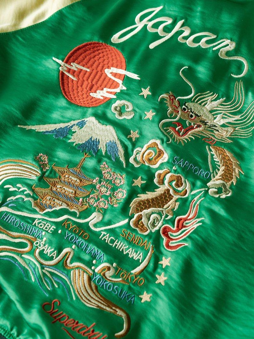Crafted with heritage and attention to detail. The Sukajan Embroidered Bomber jacket pays homage to Japanese and American varsity jackets whilst still being distinctively Superdry. The material has a soft, comfortable silk feel to it. Embroidered with a map of Japan on the back and embroidered images on the front to showcase its mixed culture of Japan and America.