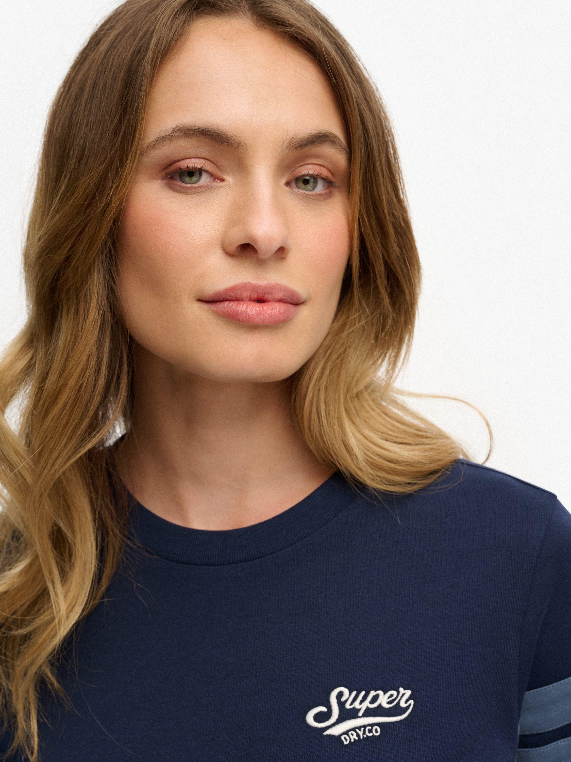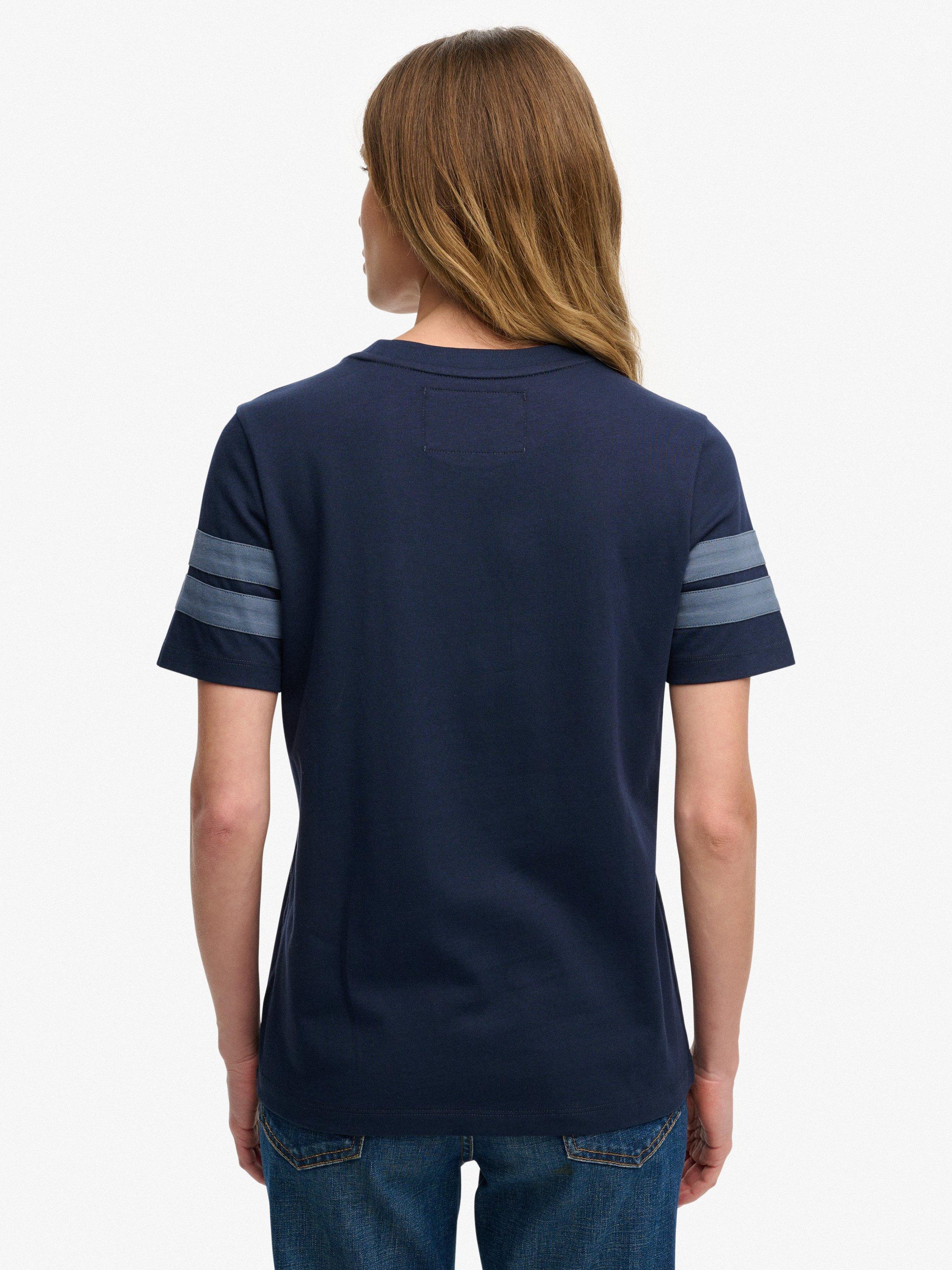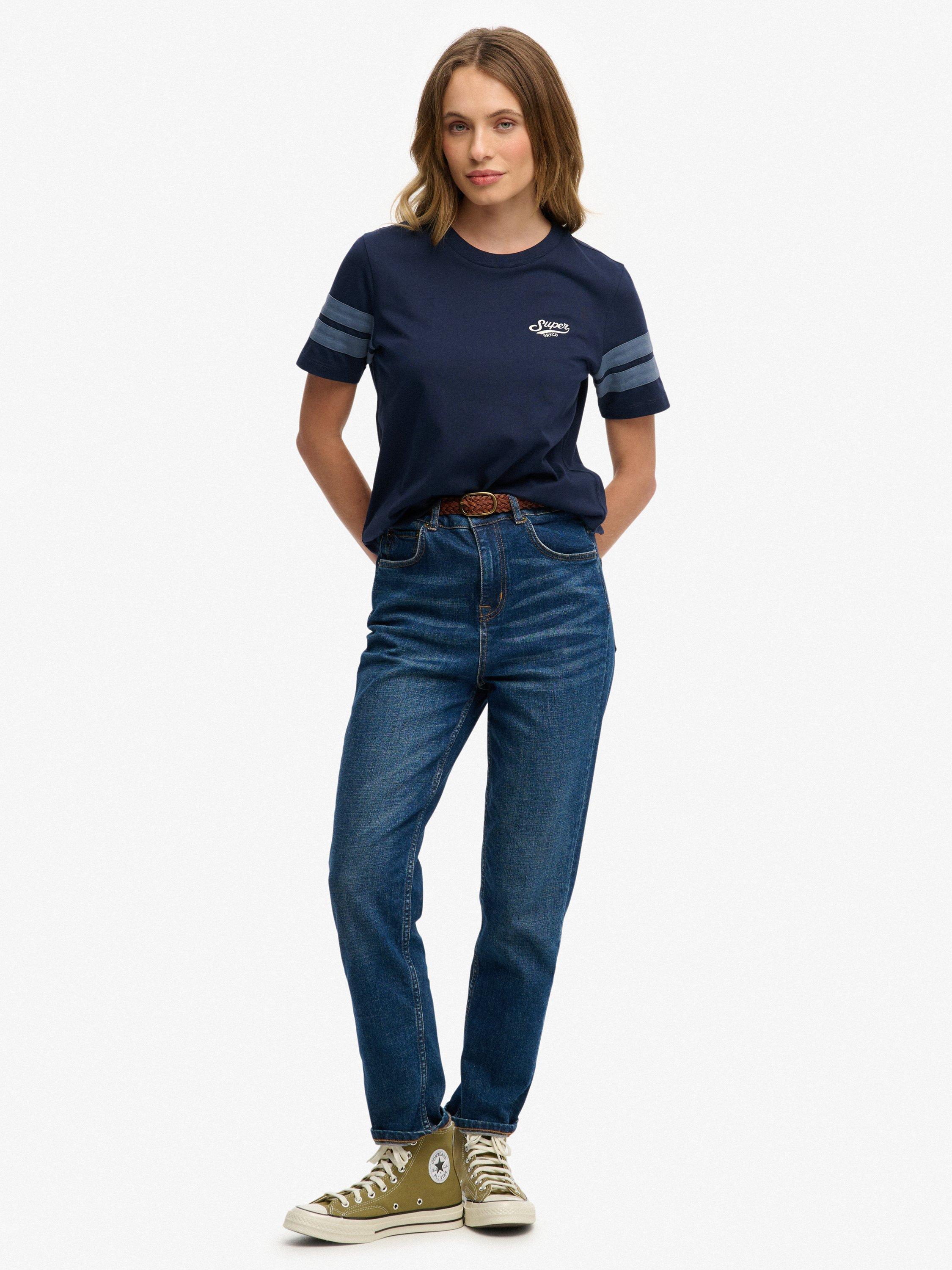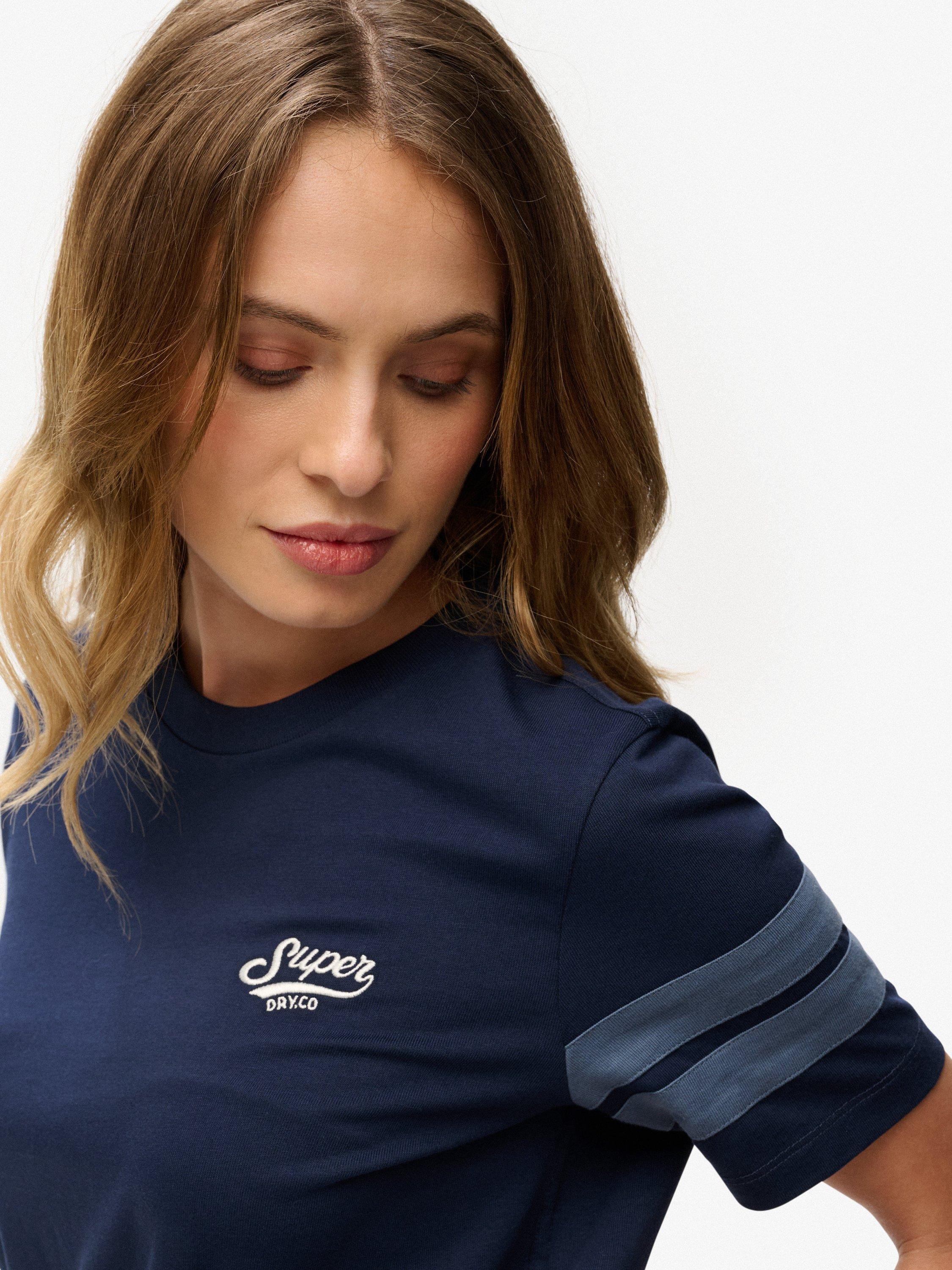 The Varsity Stripe Script T-Shirt has been gorgeously crafted with contrasting stripes on the sleeves and an embroidered logo on the chest, allowing you to create depth and style in every outfit.
