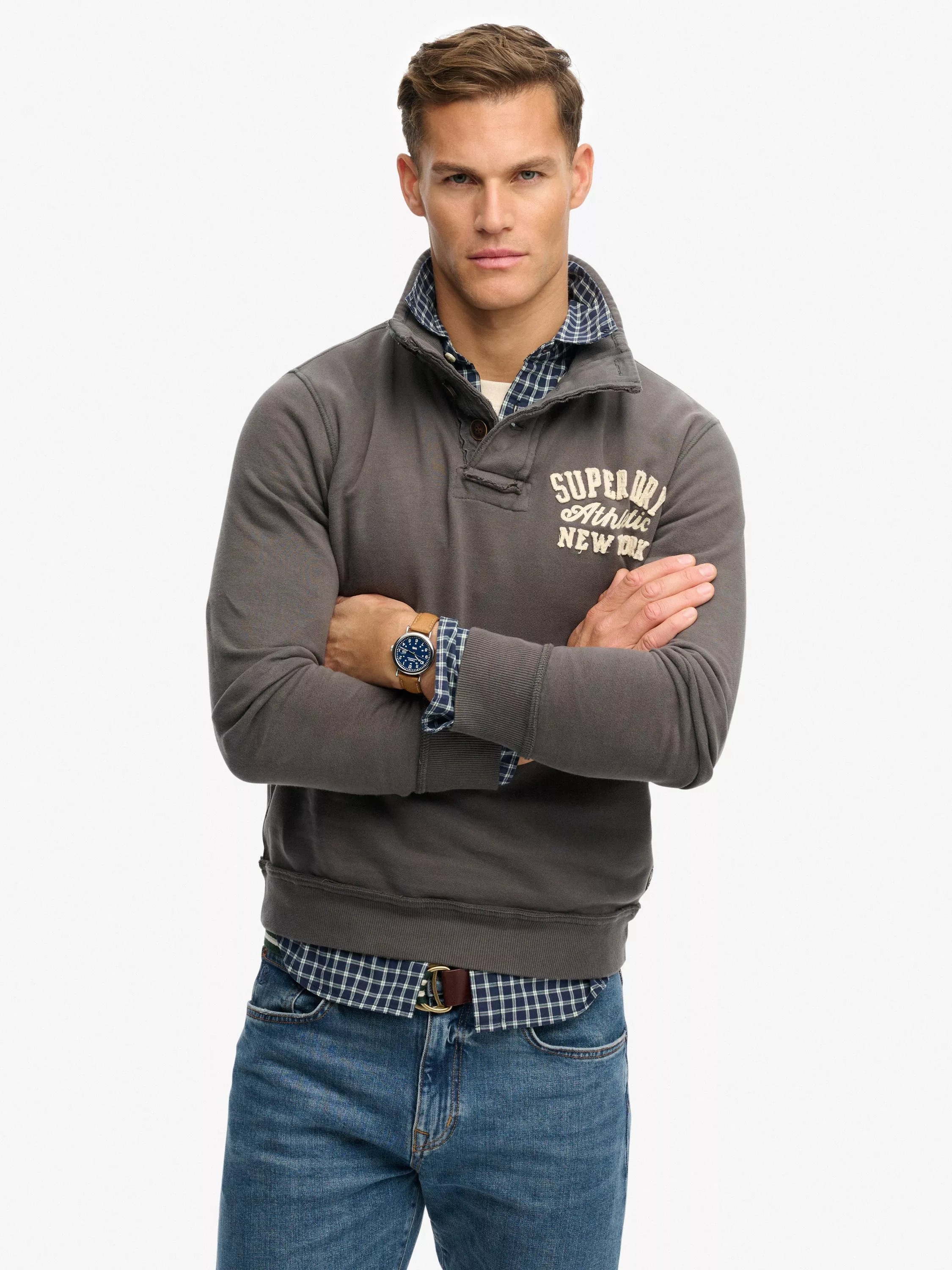 Celebrating the best of Superdry's heritage, this classic sporty style is cut in relaxed fit with a lightly brushed lining so you're comfortable throughout the seasons. Designed with applique text on the chest, ribbed cuffs and hemline, a high collar with button fastening and a distressed finish.