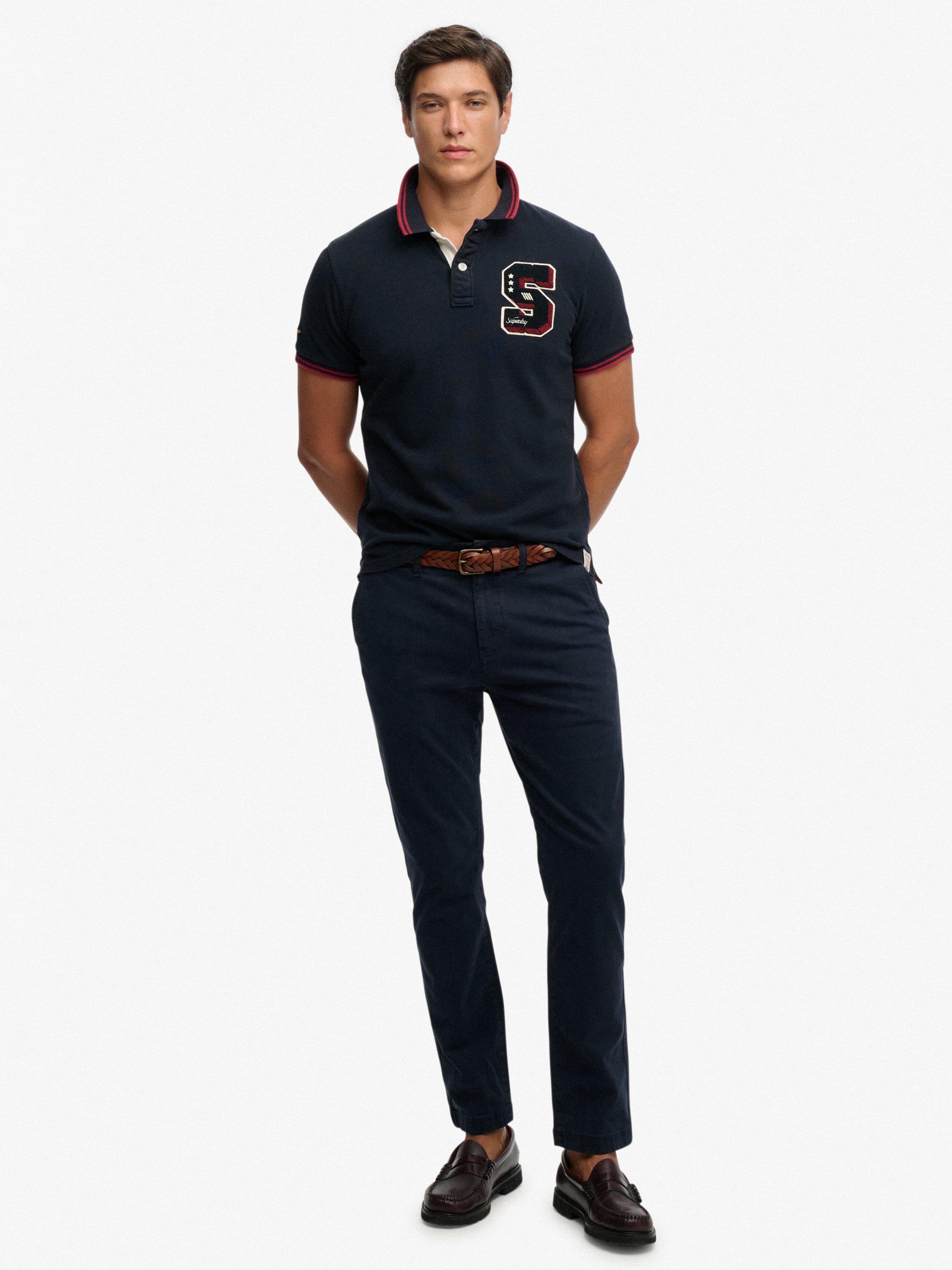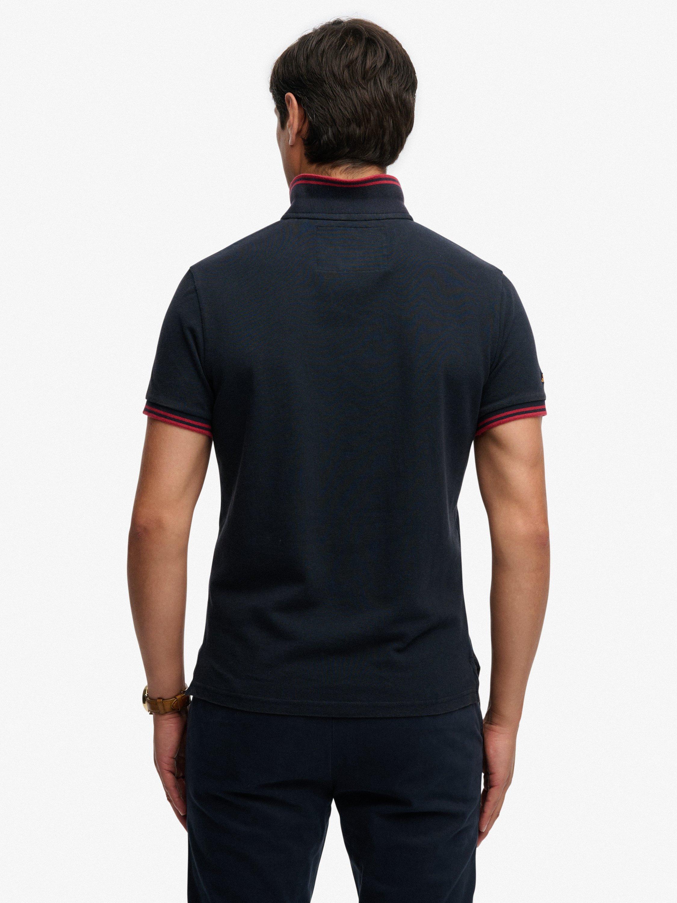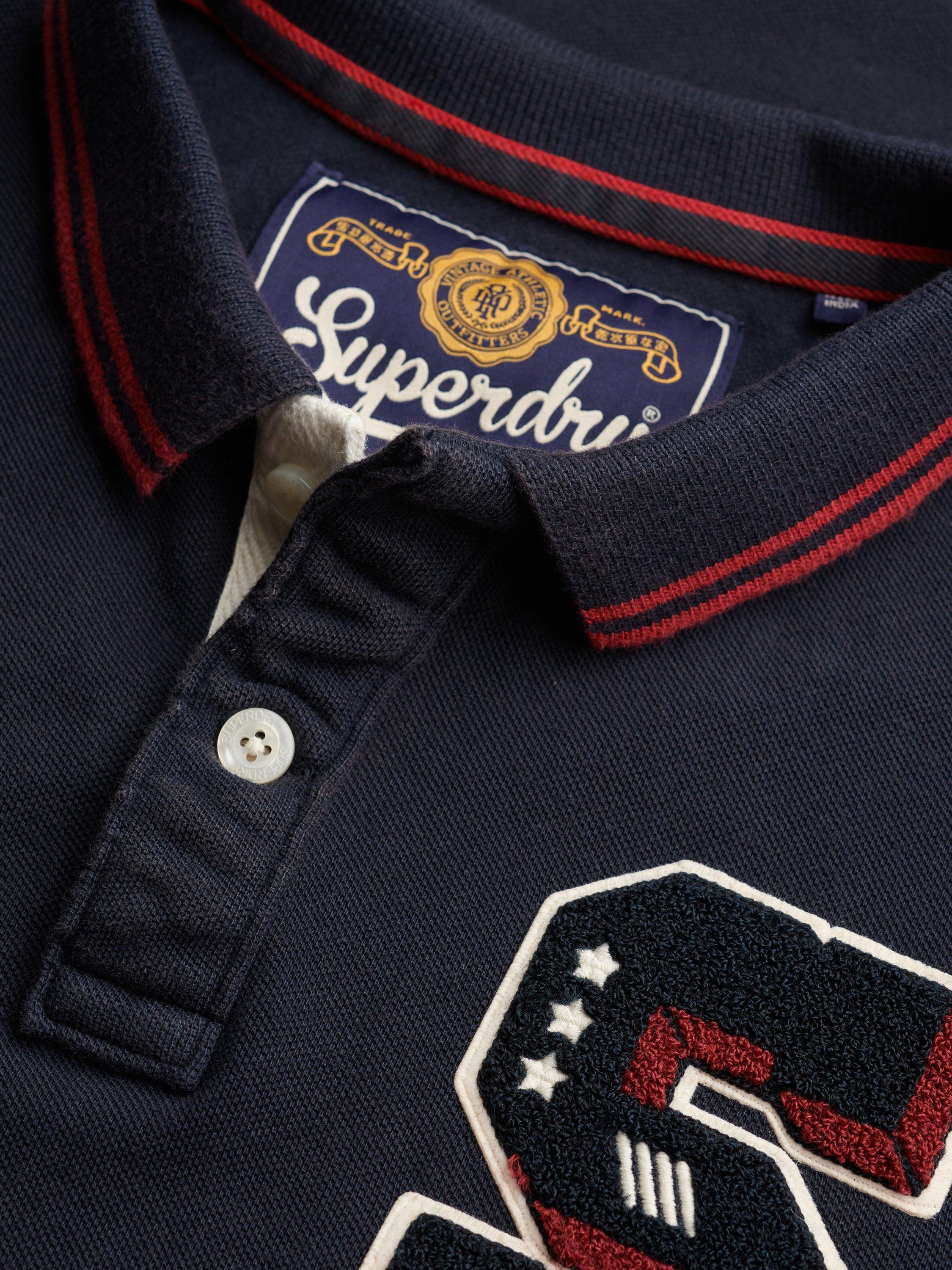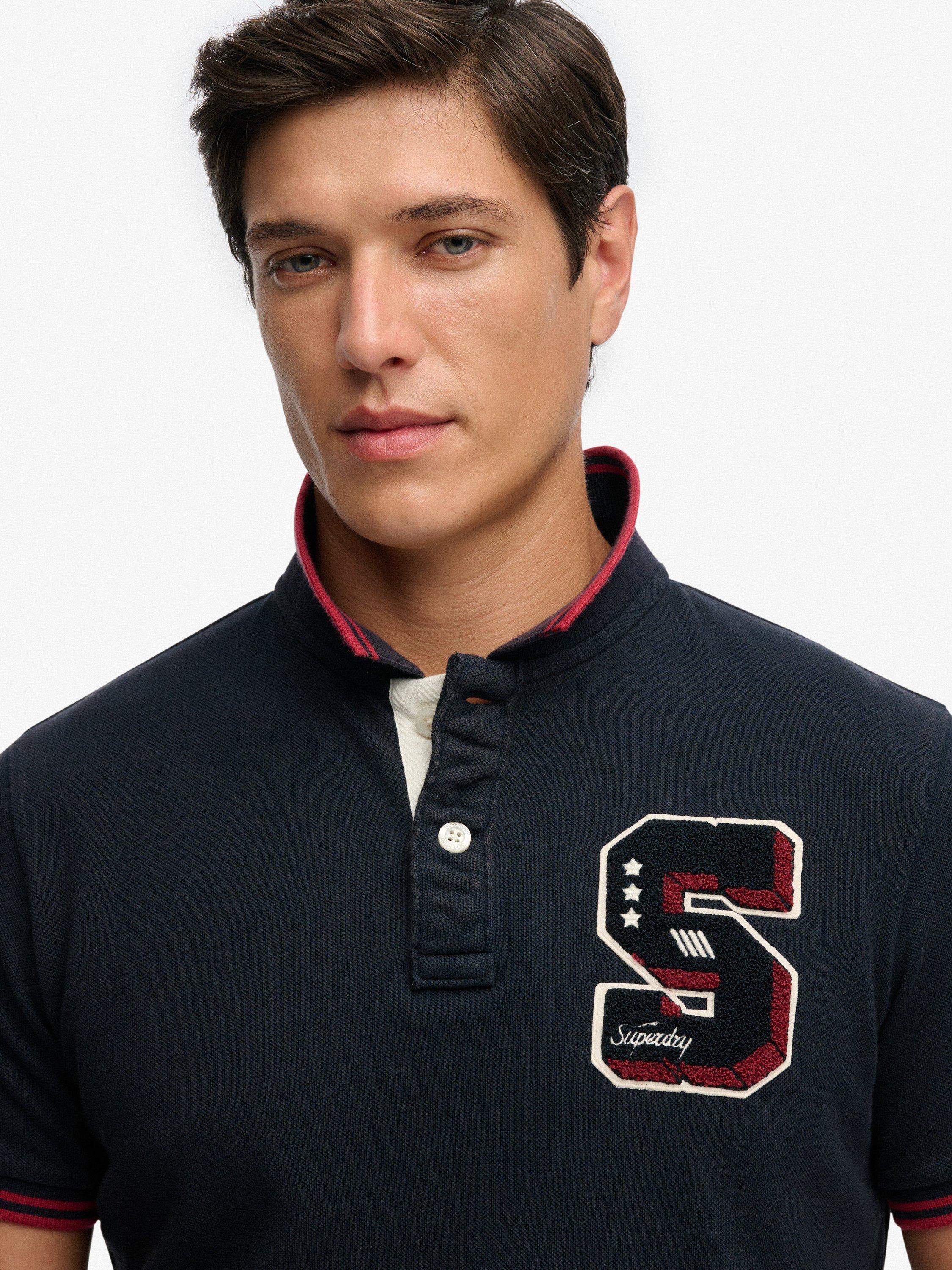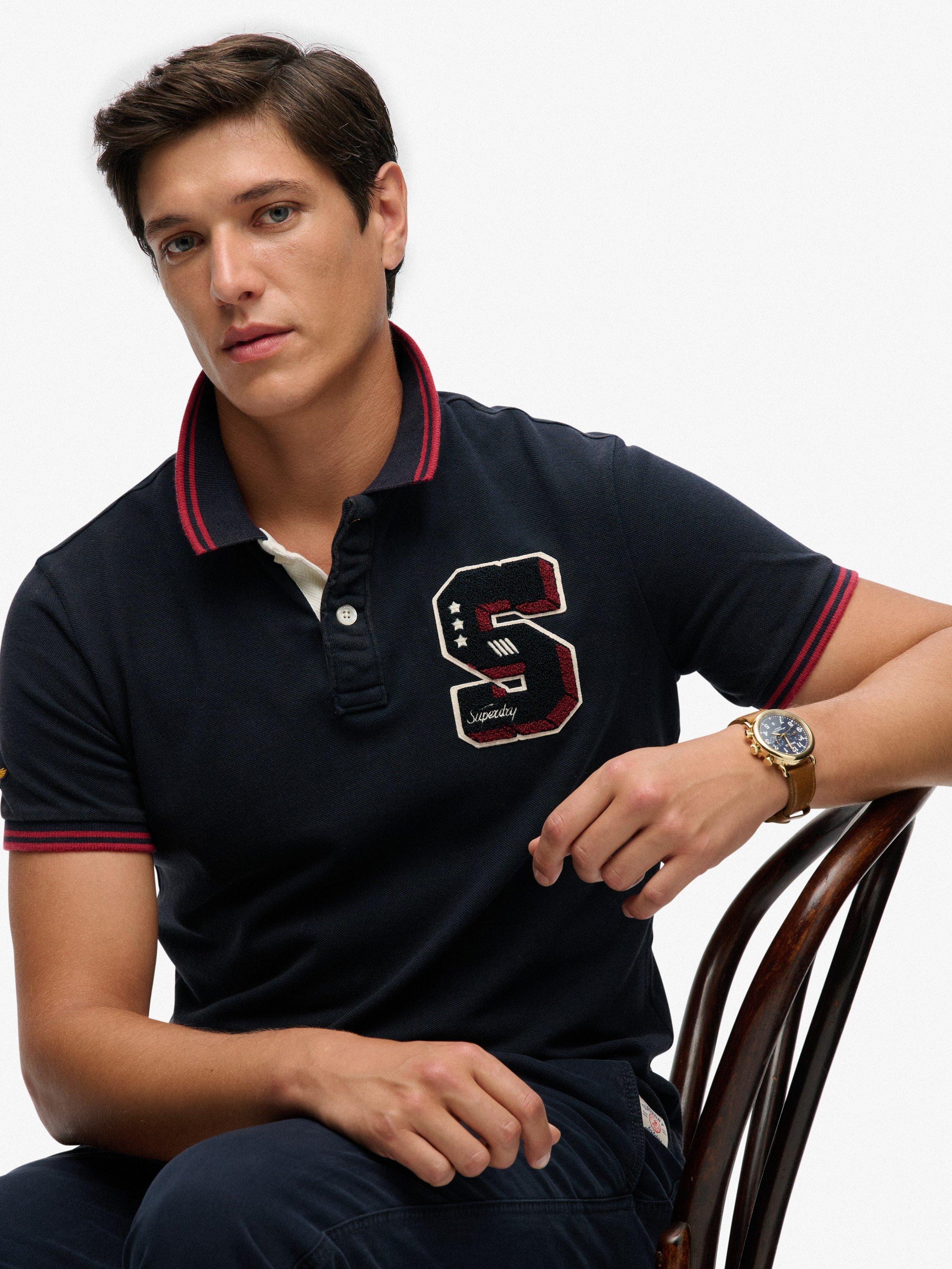 Elevate your wardrobe with this vintage-inspired polo and its retro athletic feel. It features a collar with a button fastening, ribbed trims on the sleeves and split side seams. Finished with an embroidered logo on the right sleeve and a signature Superdry tab on the hem. Pair with jeans for a confidently classic look.