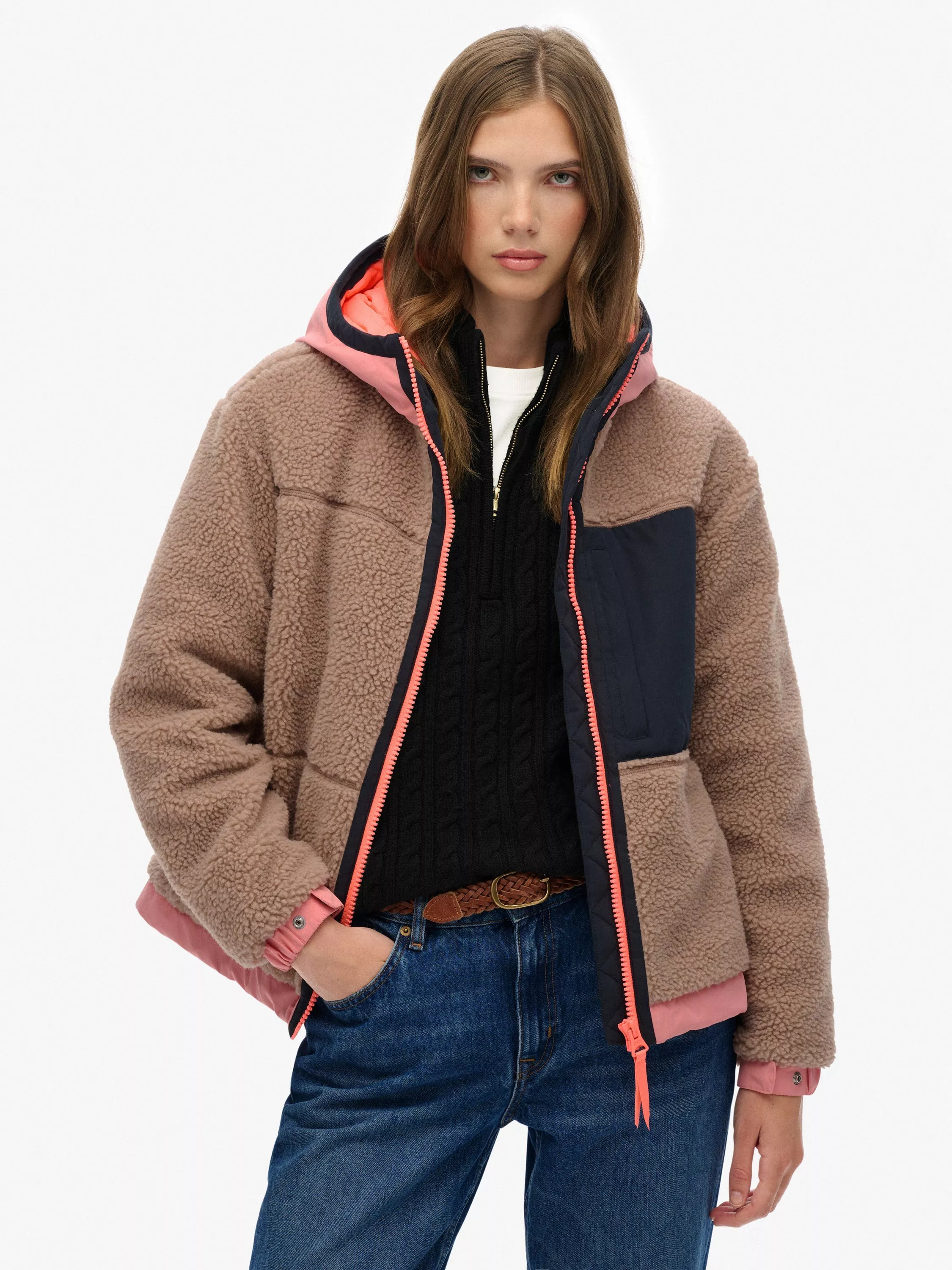 Crafted with a sumptuous sherpa external lining and light padding throughout, the comfort it offers is unmatched, while the colourful panels and relaxed silhouette allow you to showcase your authentic style with ease.