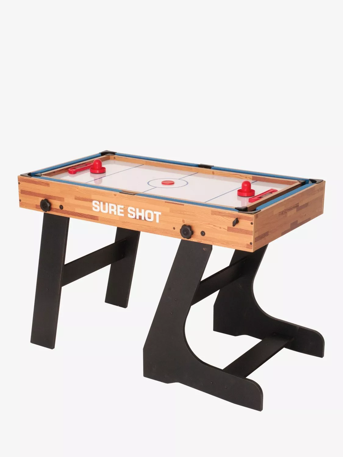 The Sure Shot folding 5-in-1 games table has an interchangeable top that lets you play table tennis, pool, foosball, air hockey and basketball. The table can be folded and stored vertically making it ideal for small spaces. Basketball can be easily attached to the air hockey top and features a backboard, hoop, ball and landing area.