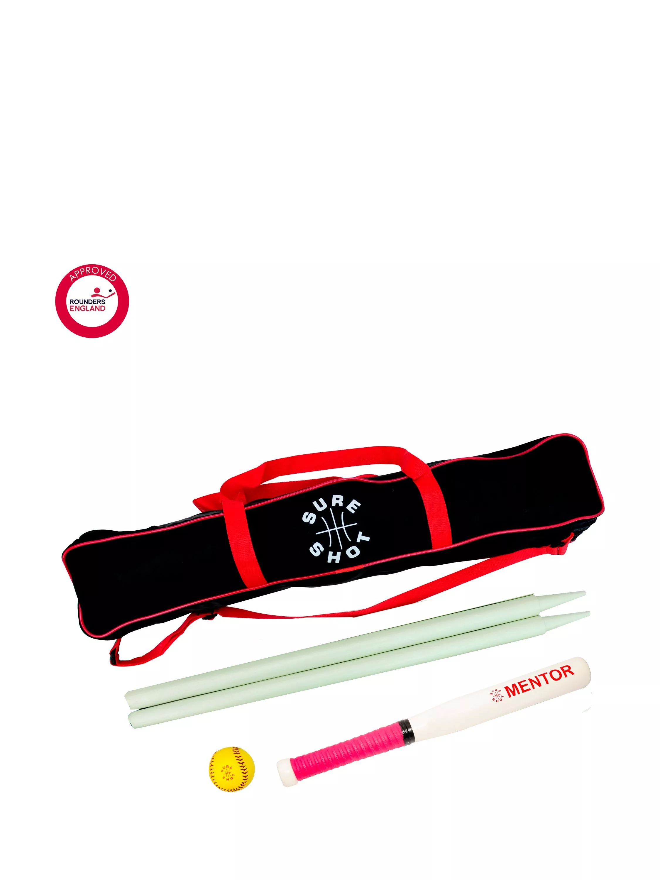 The set consists of 1 x durable Mentor bat for use by all the family. These bats are highly durable wood bats and come with a soft rubber grip. Also included are 1 x Safety ball with soft core centre suitable for all ages. To complete the set it also includes wooden posts for marking the pitch. All equipment comes complete in its own Sure Shot Carry case and is approved by Rounders England.