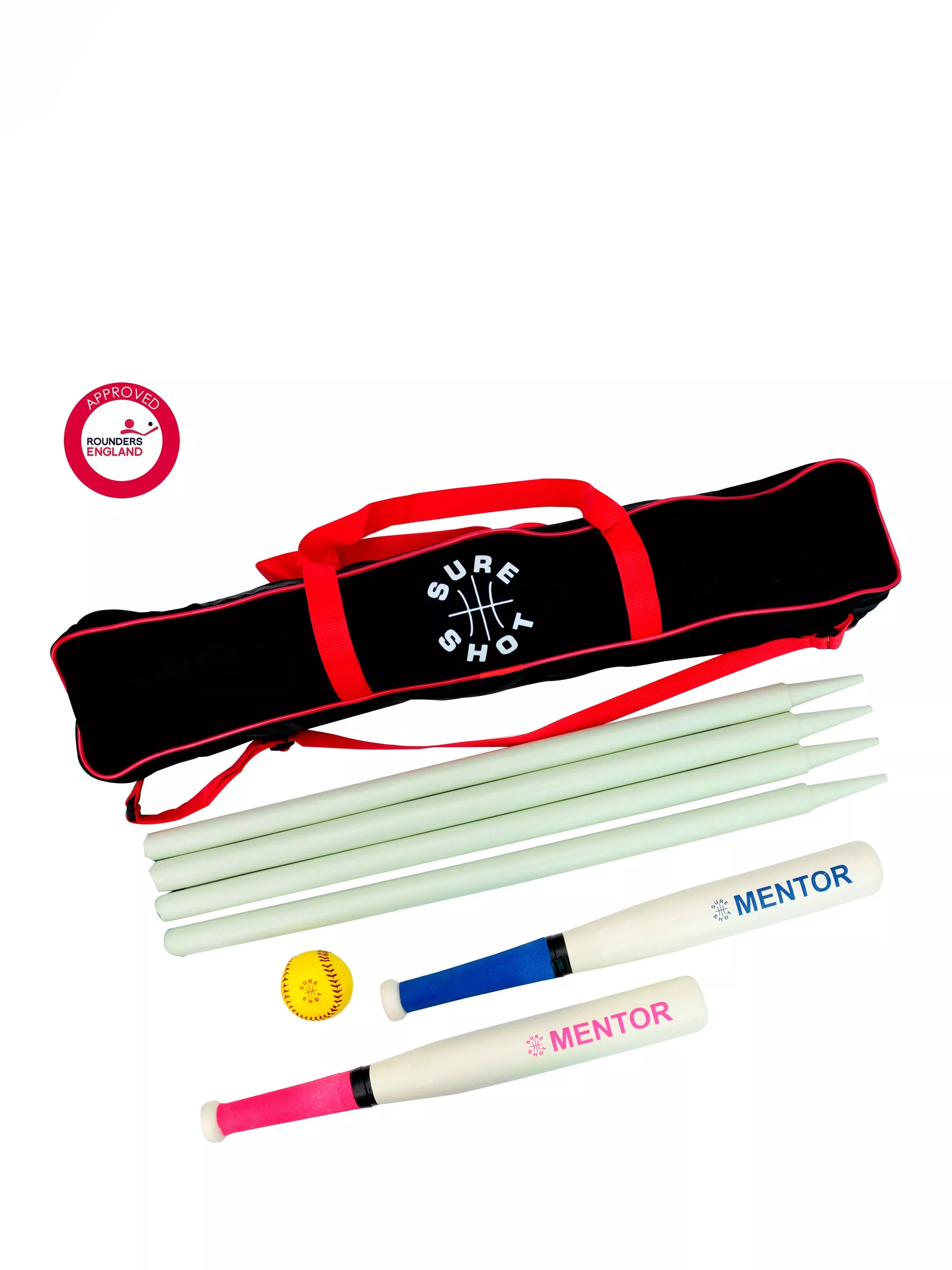 The set consists of 1 x Mentor Blue bat and 1 x Mentor Pink bat for use by all the family. These bats are highly durable wood bats and come with a soft rubber grip. Also included are 1 x Safety ball with soft core centre and 1 x Trainer ball too. To complete the set it also includes wooden posts for marking the pitch. All equipment comes complete in its own Sure Shot Carry case and is approved by Rounders England.