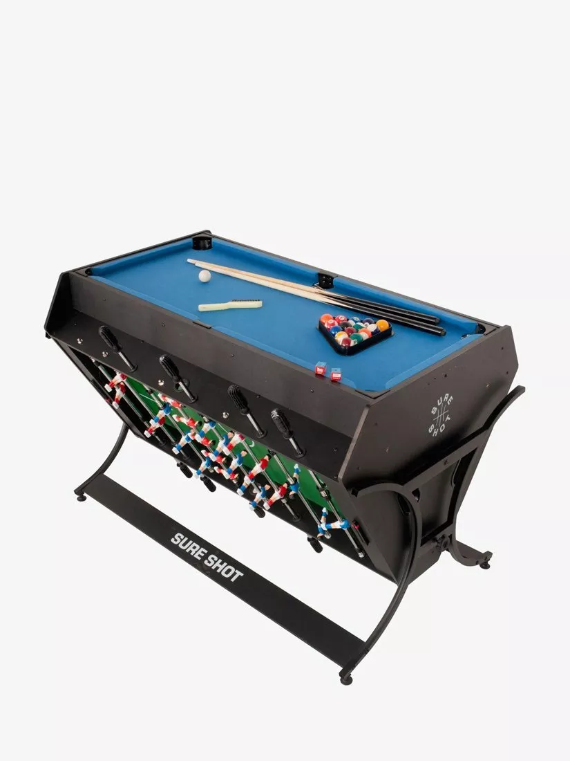 The Sure Shot 4-in-1 Multi Games Table with a triangular rotational design allows you to go from pool to air hockey to foosball in seconds. The table tennis top can be attached quickly. At just four feet in length, this is an extremely compact games table. Light enough for two people to move, it takes up very little space, ready to be brought out when it's time for a game.