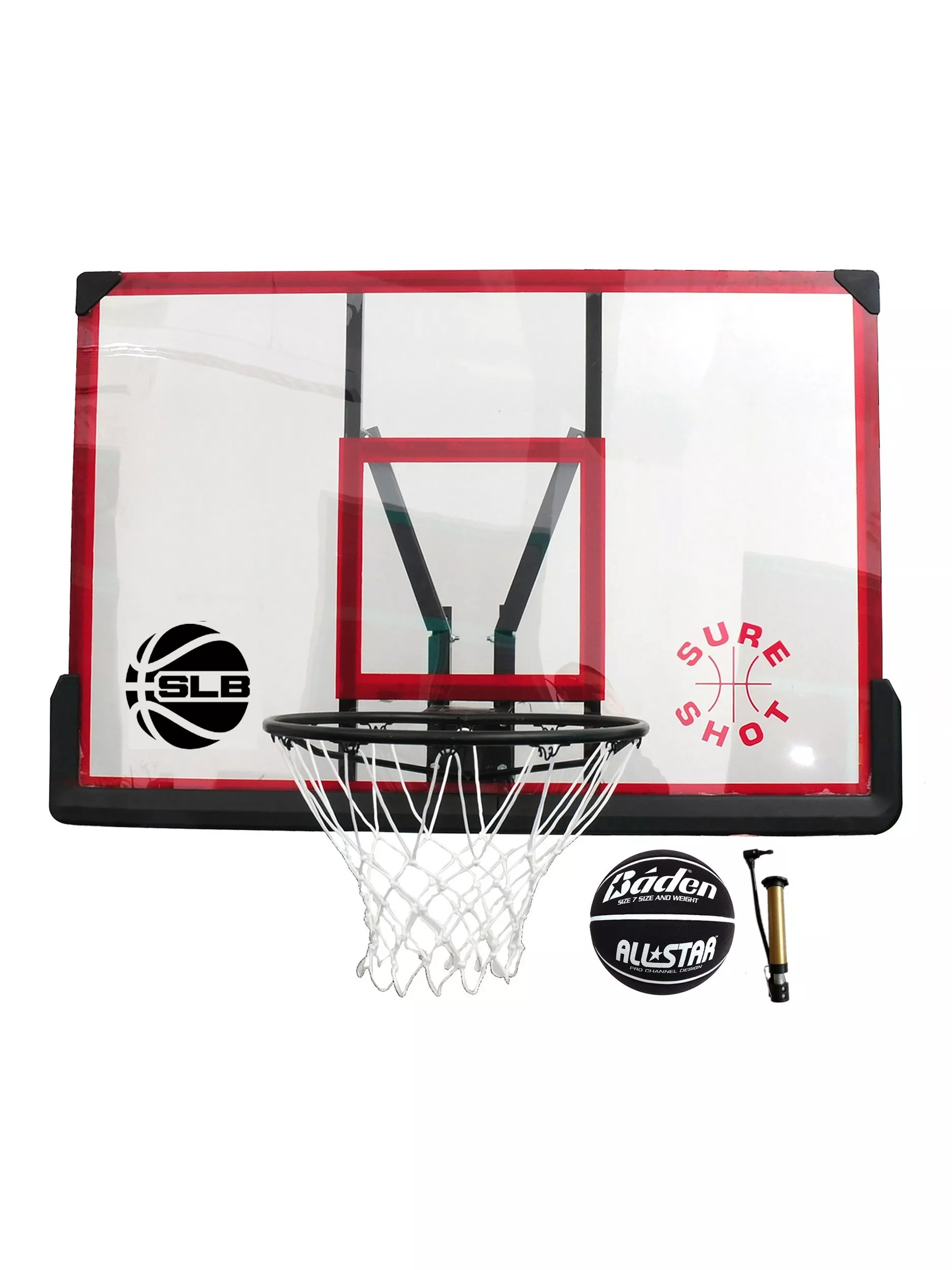 This unit includes a wall mounting bracket providing a 25cm extension from the installed surface. This set also includes a size 7 Baden All Star Basketball and pump.
